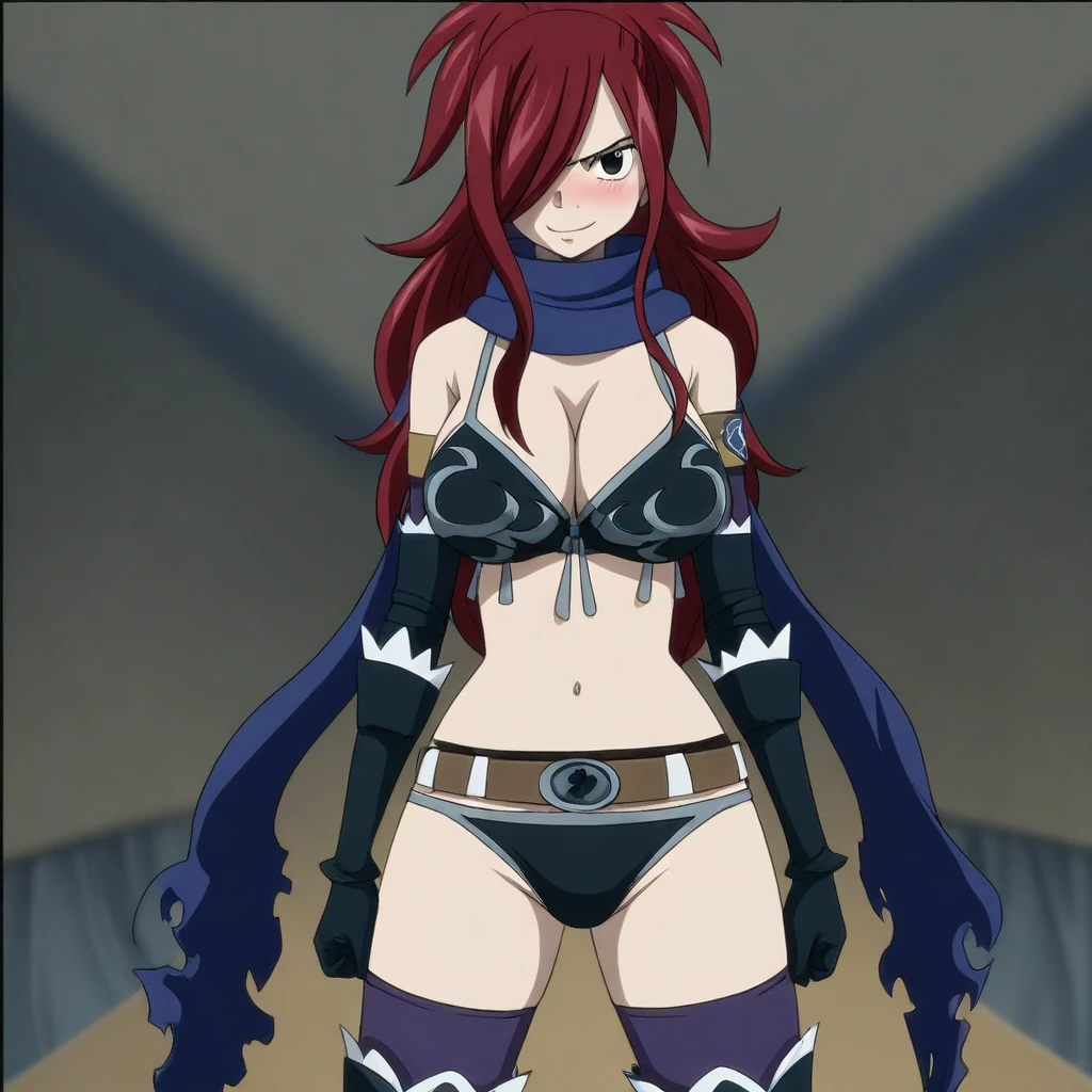 dark-blue scarf, black bikini, silver trim, armbands, black elbow-gloves, cleavage, navel, midriff, belt, white pelvis curtain, black panties, purple thighhighs, black thigh-boots,