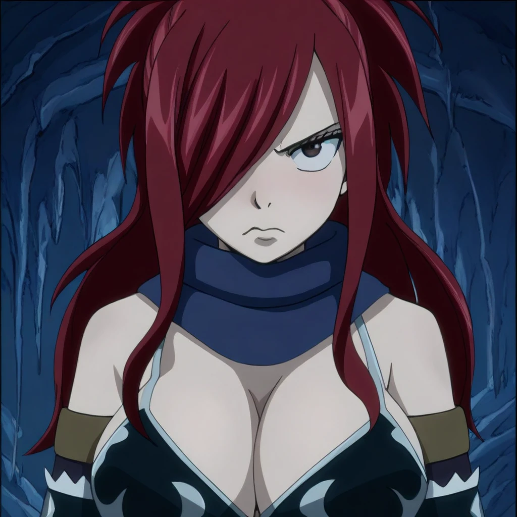 red hair, long hair, swept bangs, bangs over one eye, high hair tail, dark-brown eyes, big breasts,