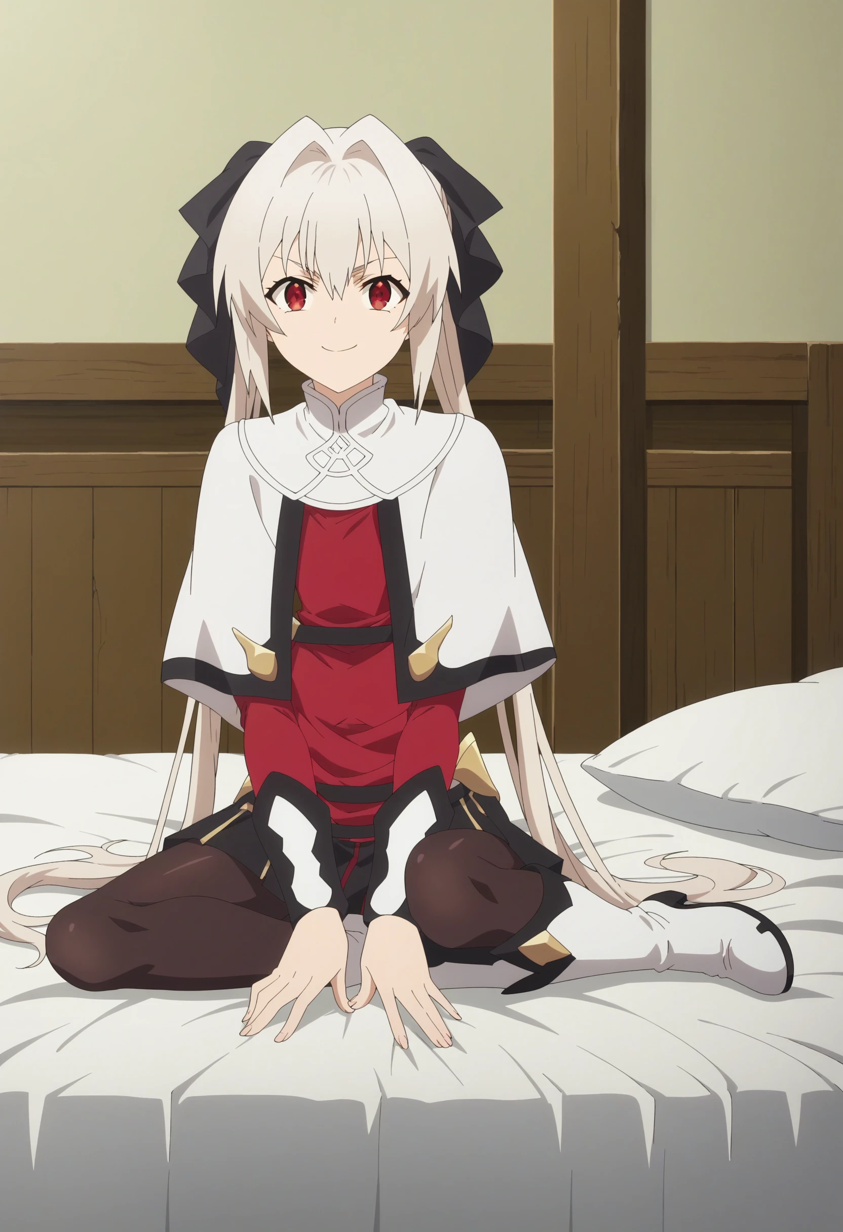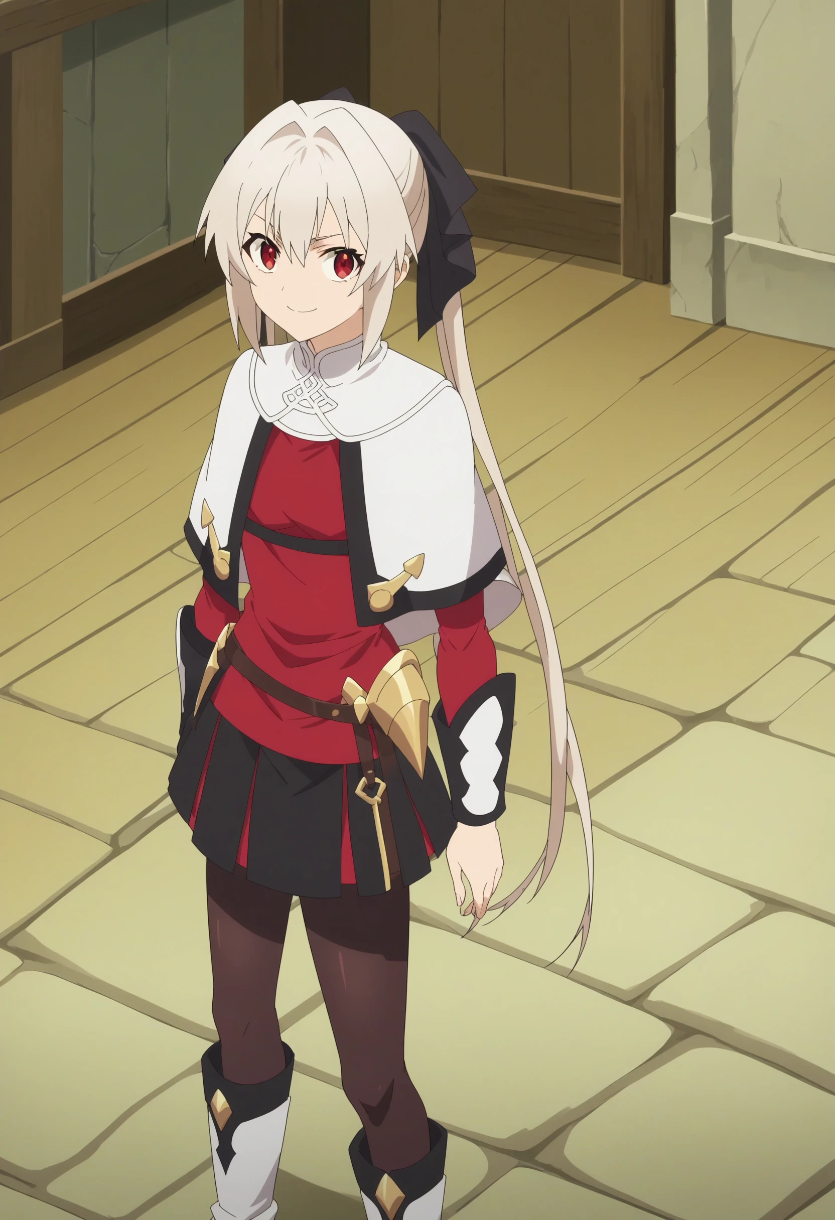 bracers, hair ribbon, white boots, skirt, black pantyhose, red shirt, white capelet, belt,