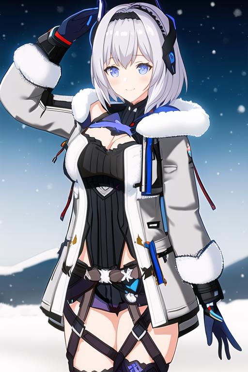 prompts: vidar, asymmetrical headgear, fur-trimmed jacket, gloves, black thighhighs, leotard, short shorts,