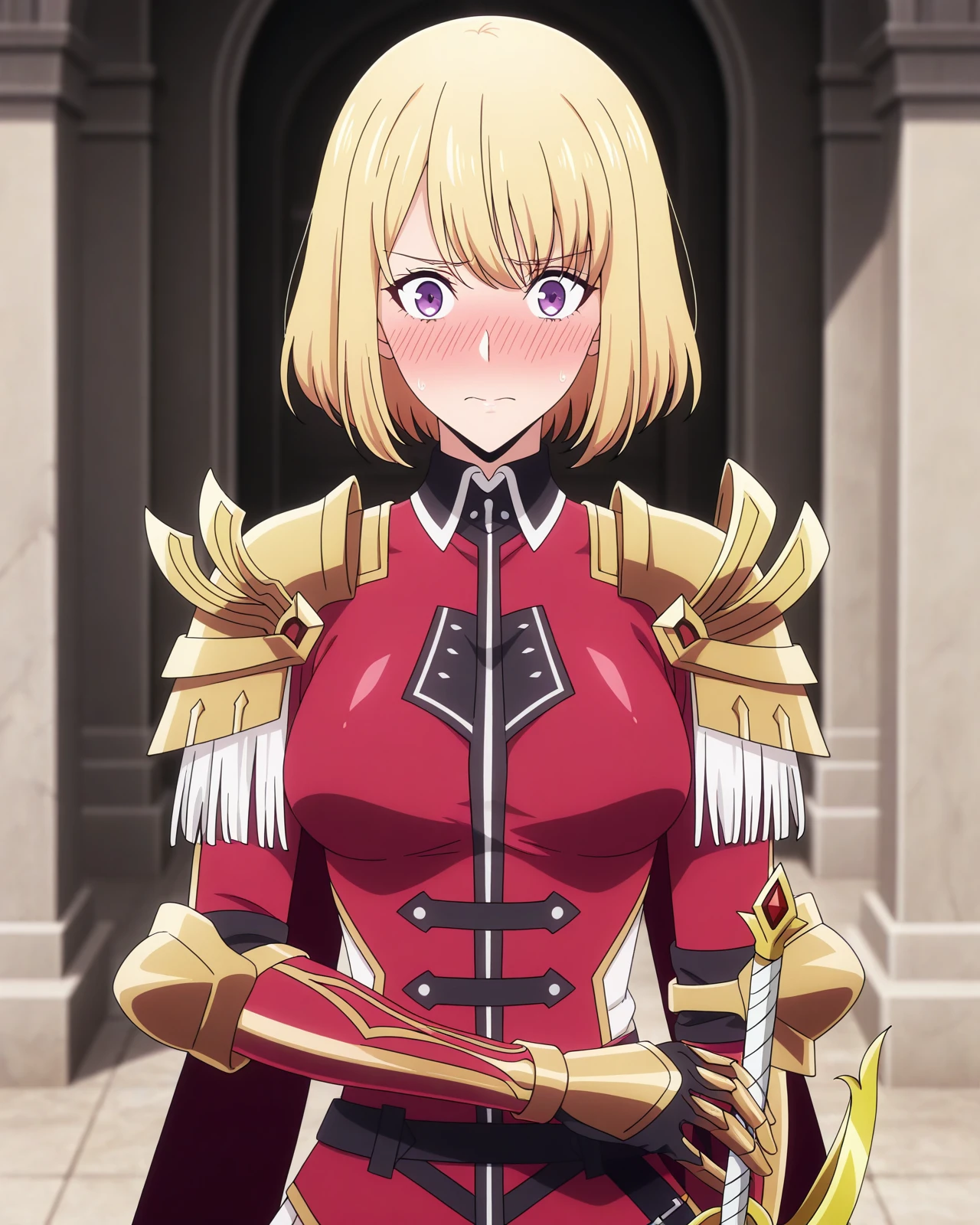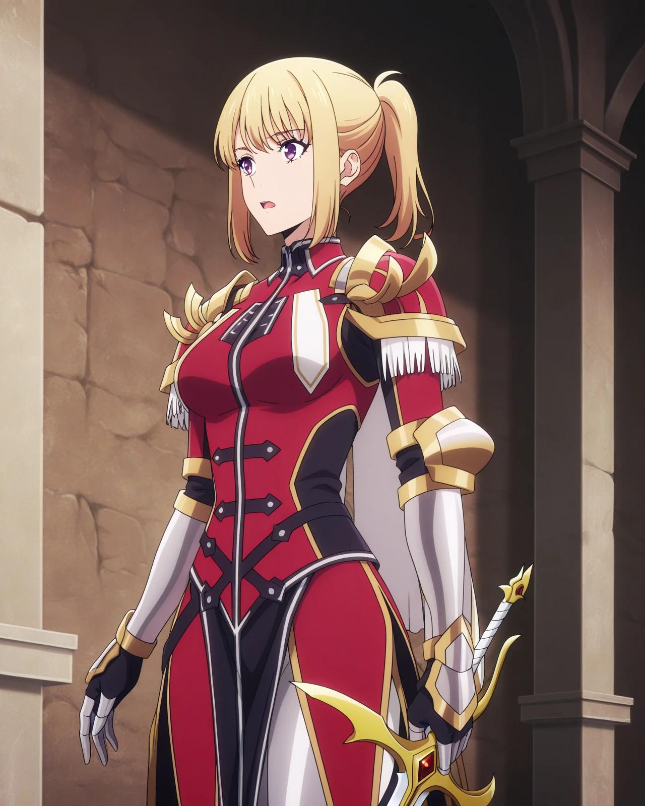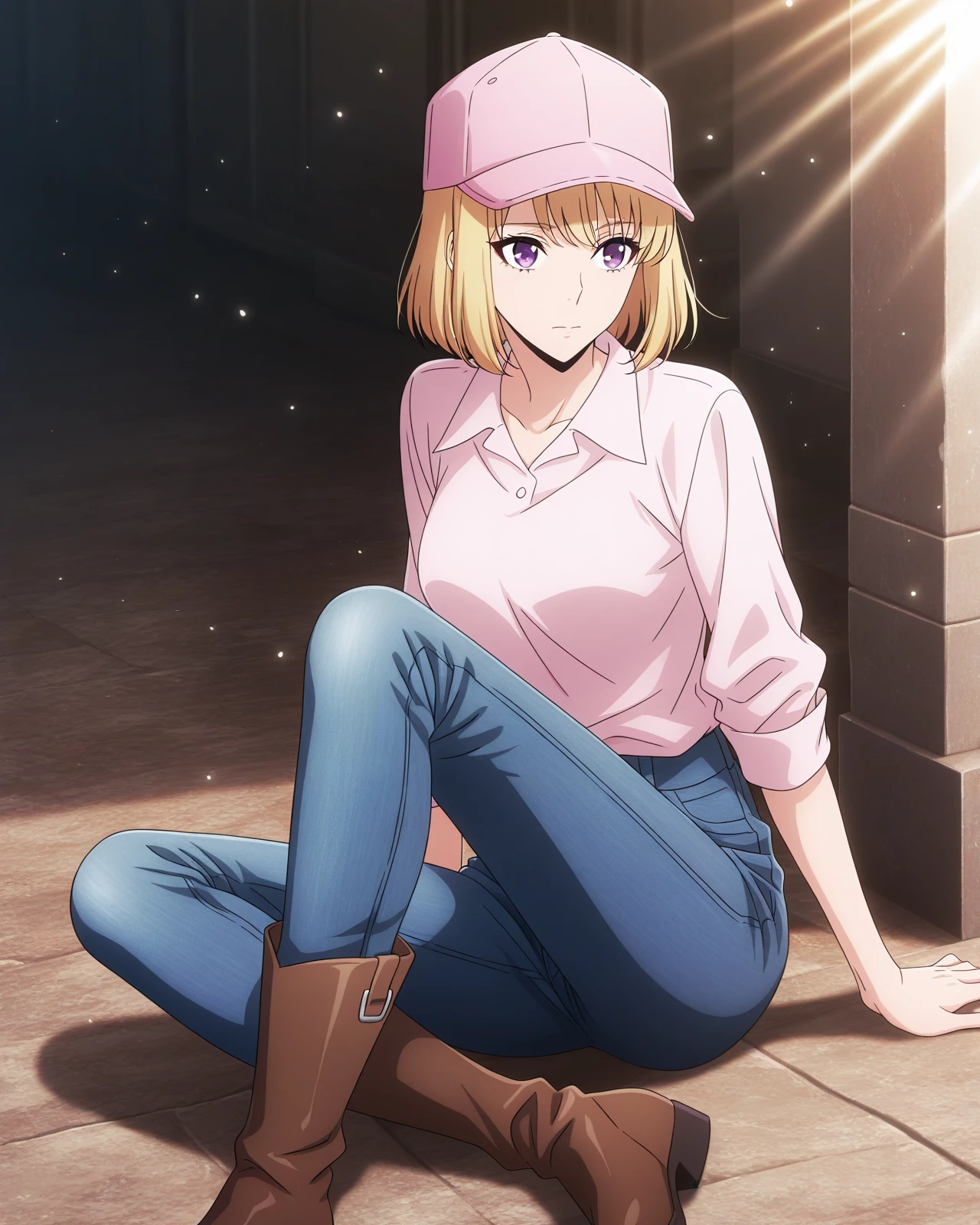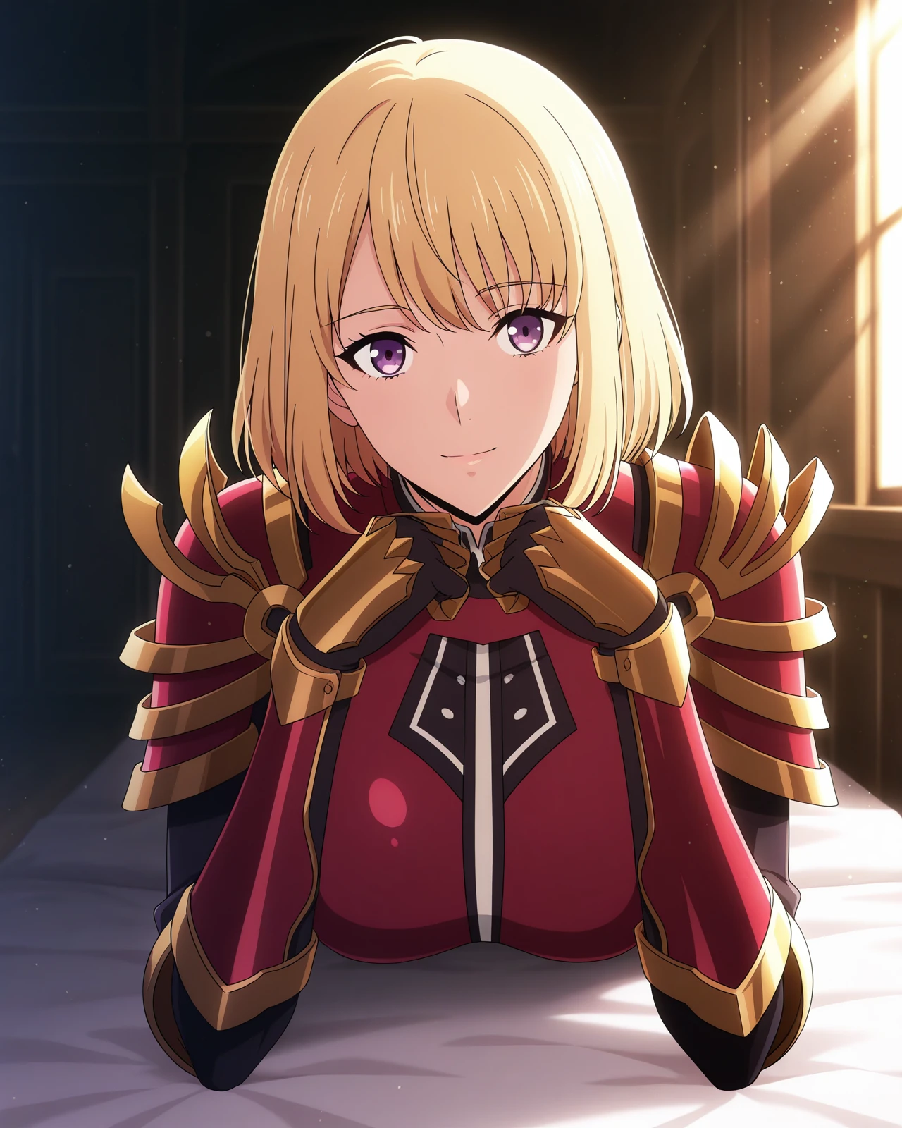 sl-haein, purple eyes, blonde hair, bangs, hair between eyes