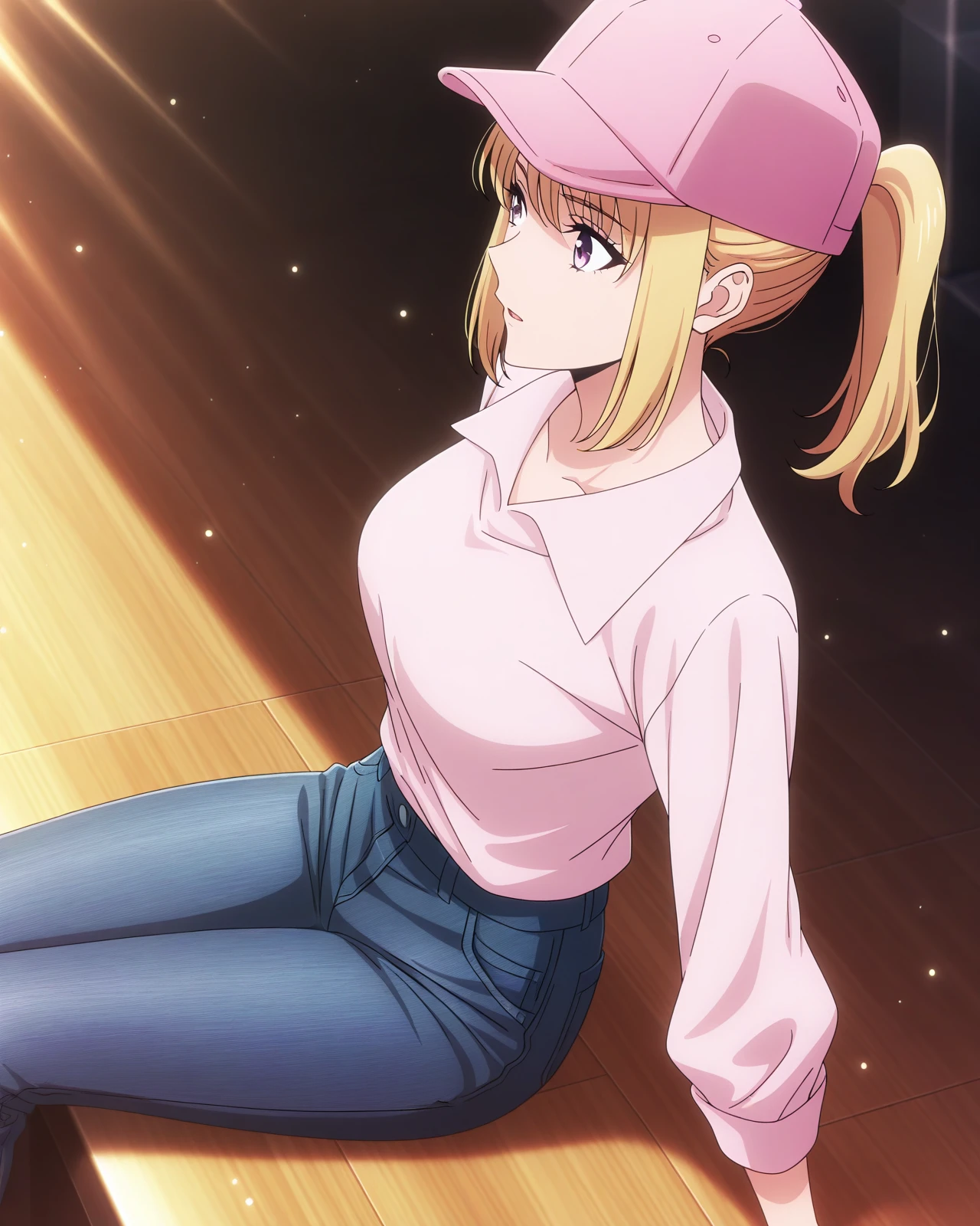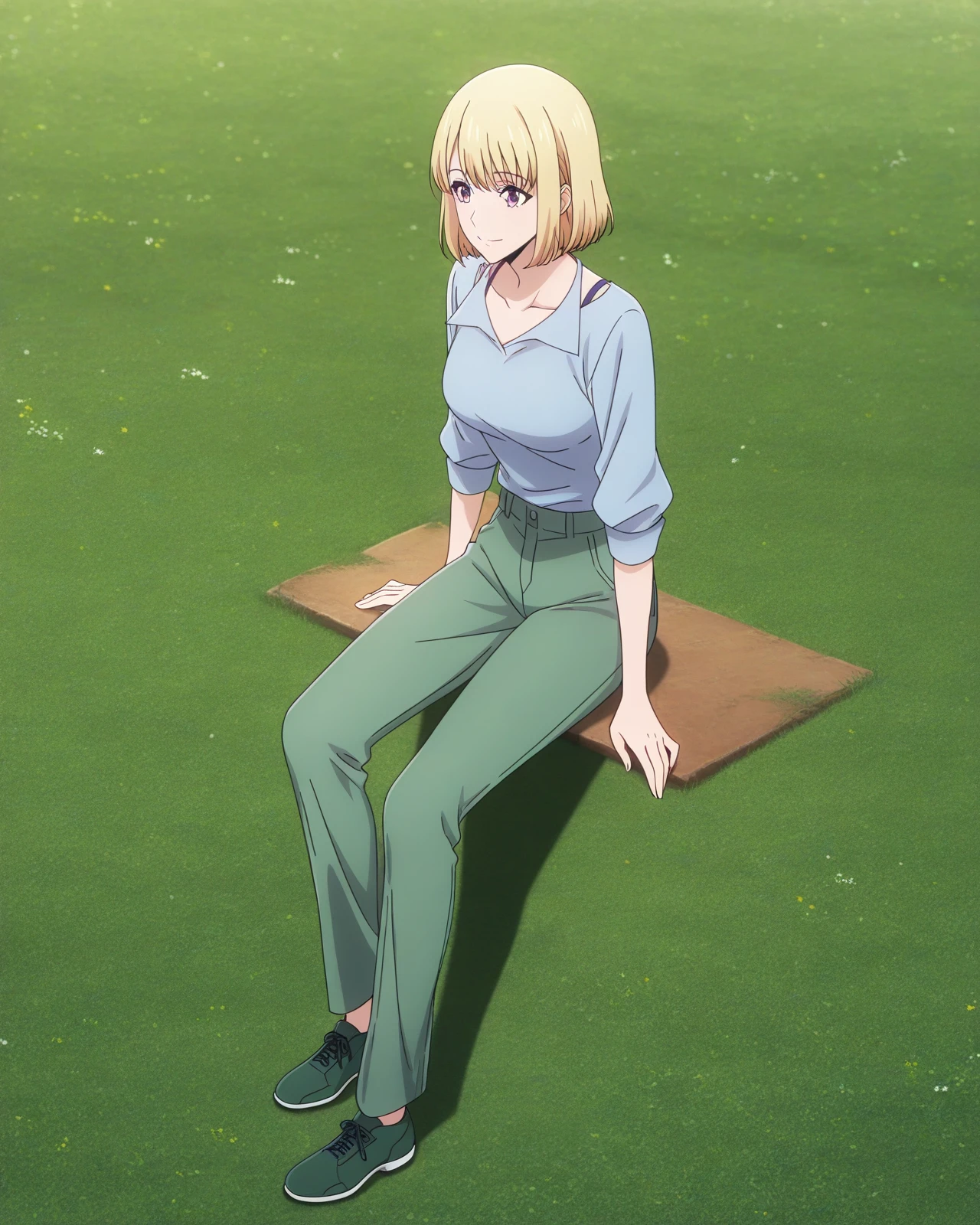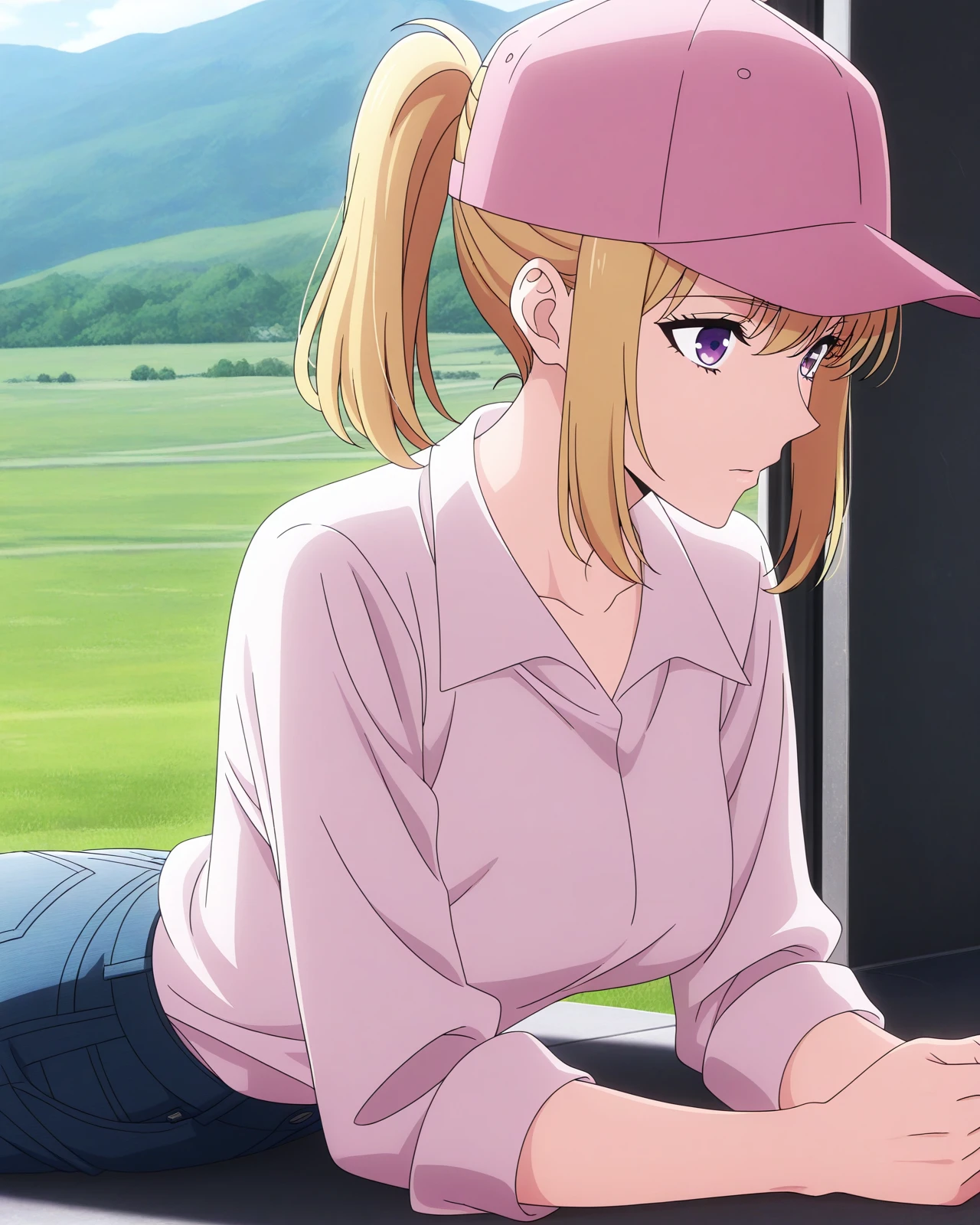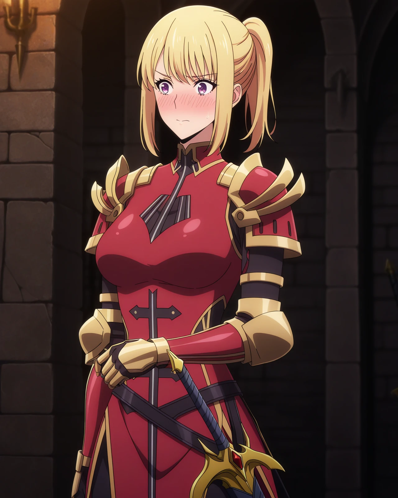 sl-haein, purple eyes, blonde hair, bangs, hair between eyes
