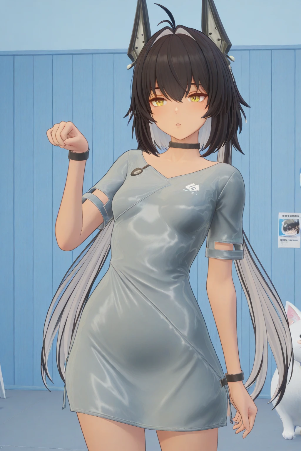 1girl, solo, adult, small , yellow eyes, black hair, hair between eyes, long hair, ahoge, low-twintails, inner hair white, light brown skin, cat ears, metal cat ears,long shirt, light blue, short sleeves, black choker