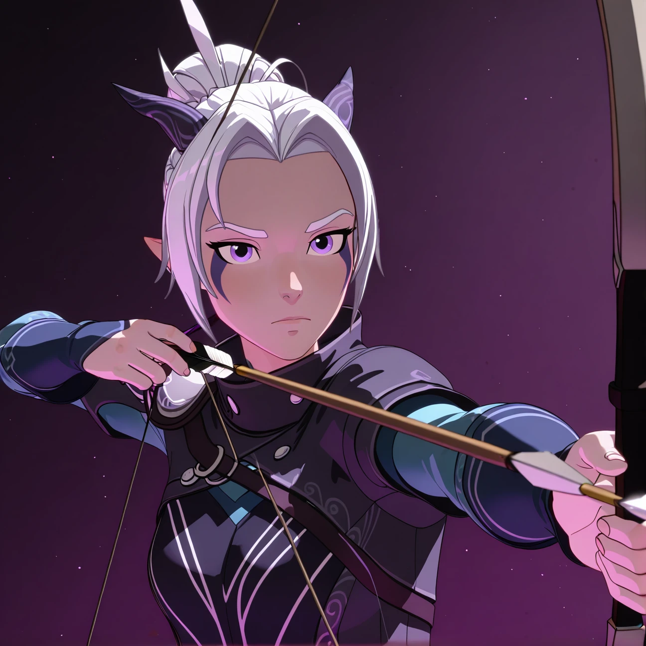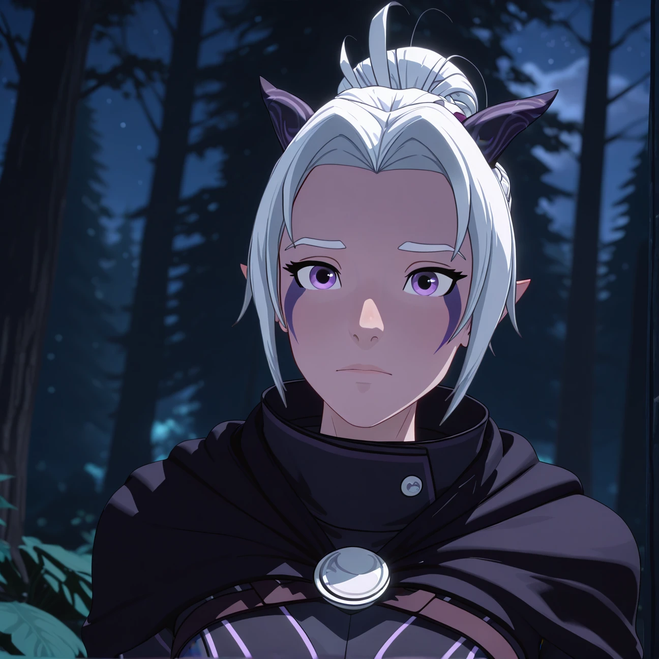 Rayla Elf (Original): r4yl4, 1girl, white hair, grey hair, purple eyes, ??????????????, horns, facial mark, hair bun, single hair bun, elf, pointy ears