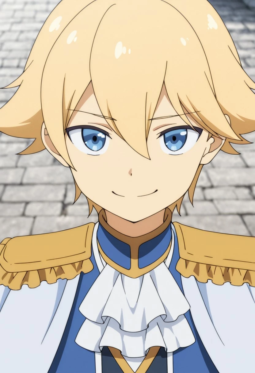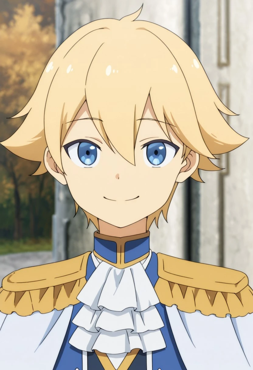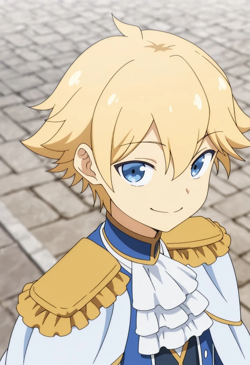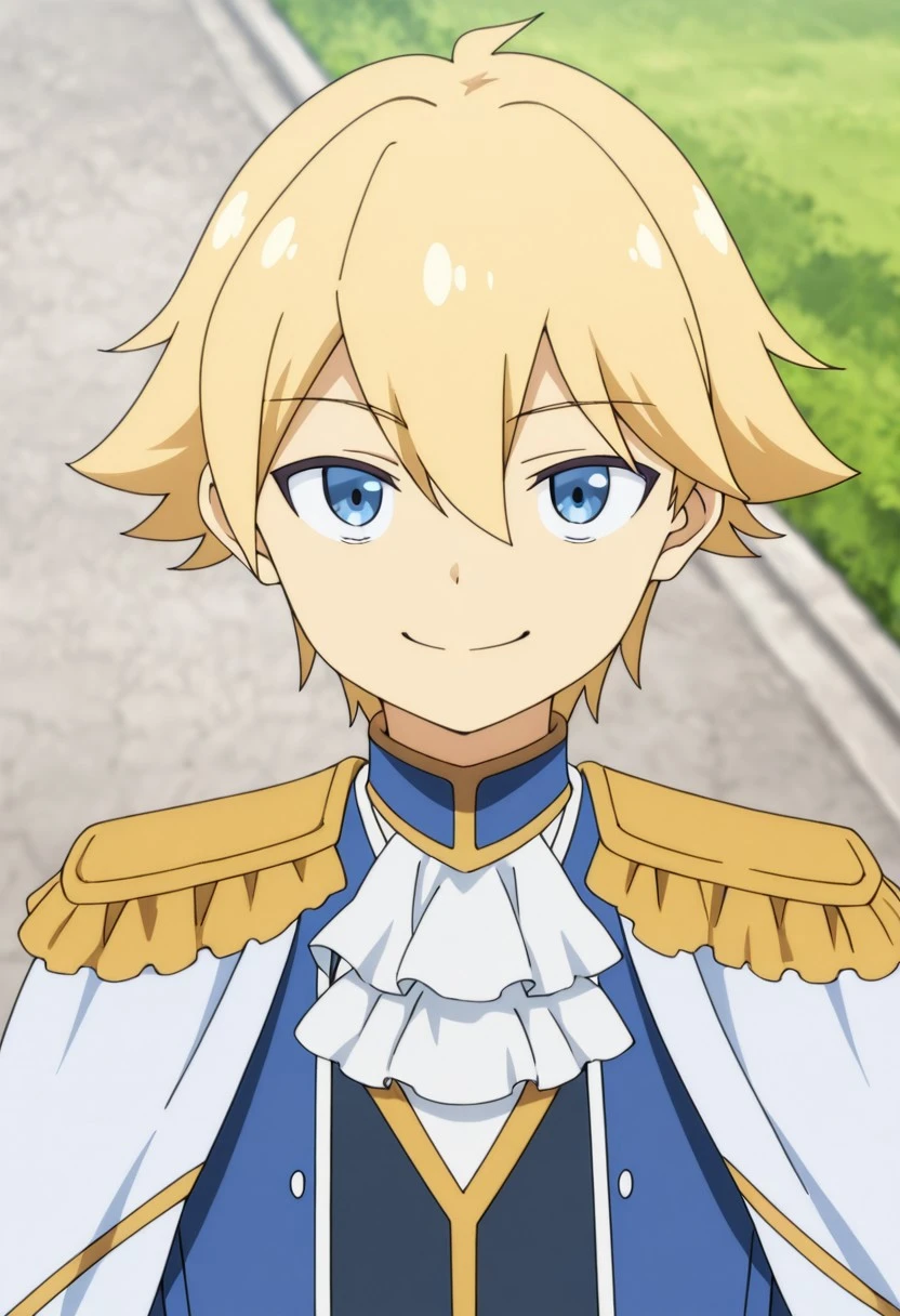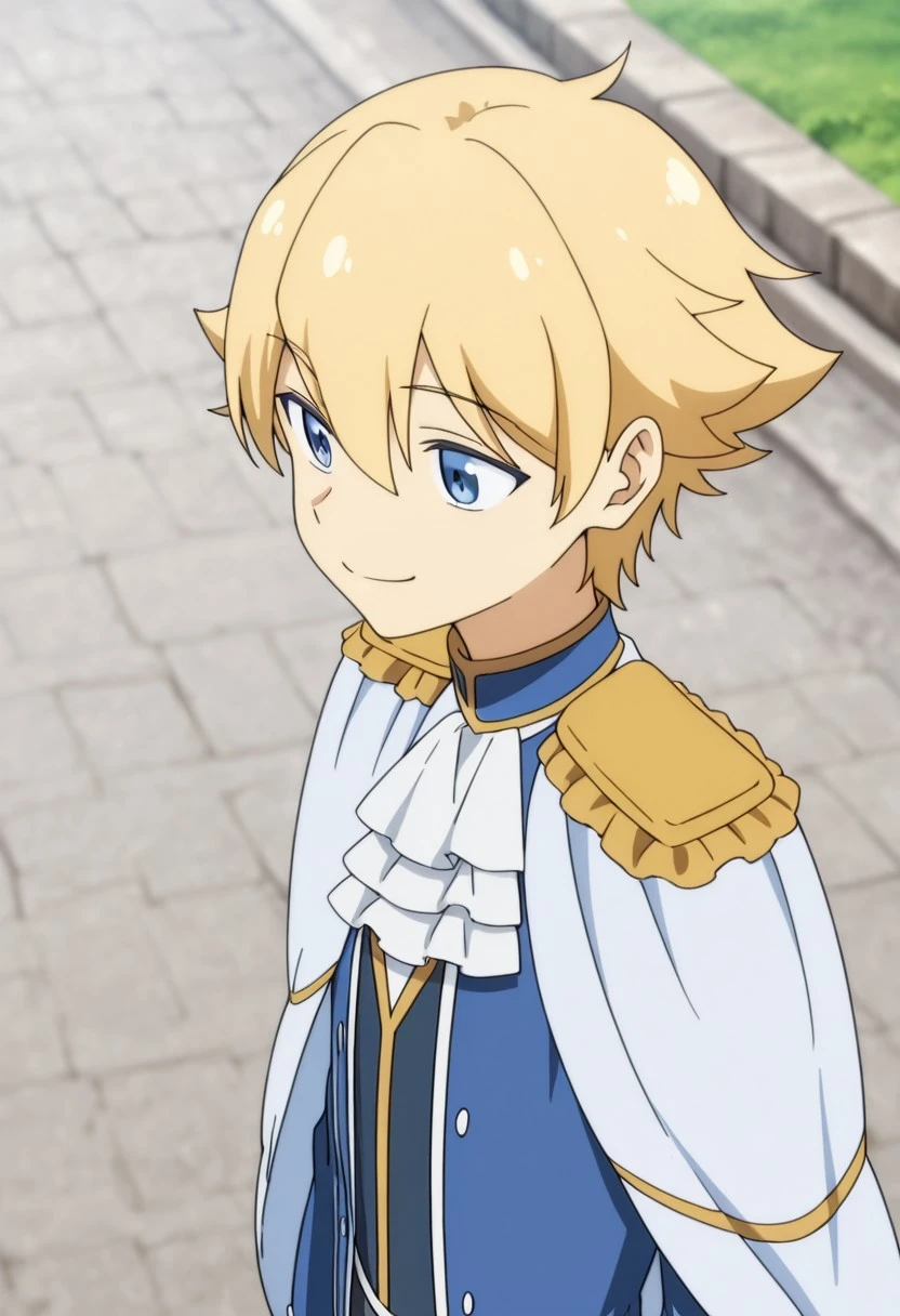 1boy, male focus, solo, blue eyes, blonde hair, blue shirt, high collar, white ascot, white cape, epaulettes, blue jacket, open jacket, grey pants, white gloves, boots, black footwear,