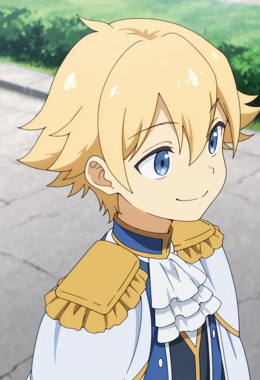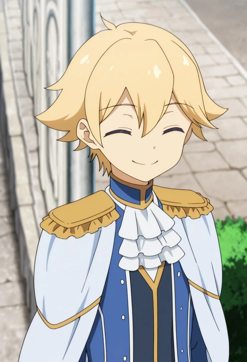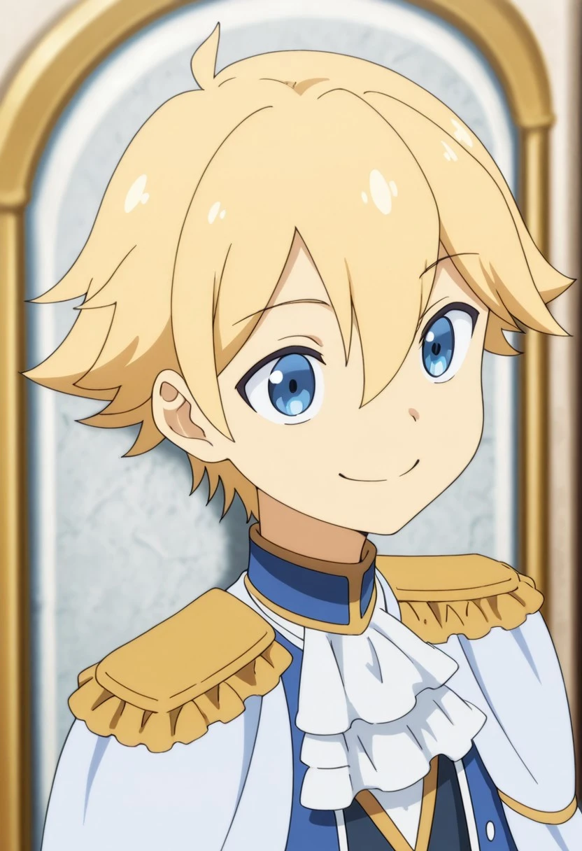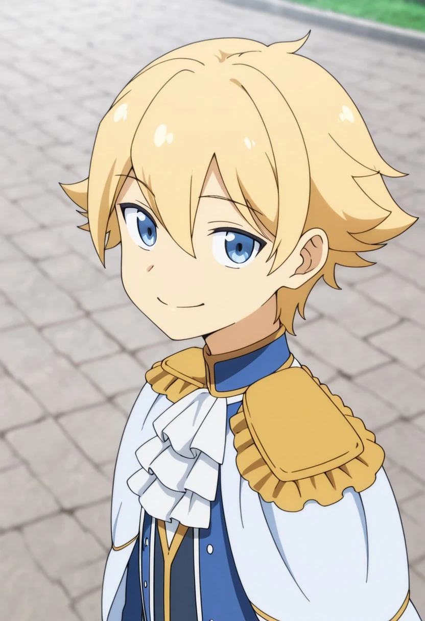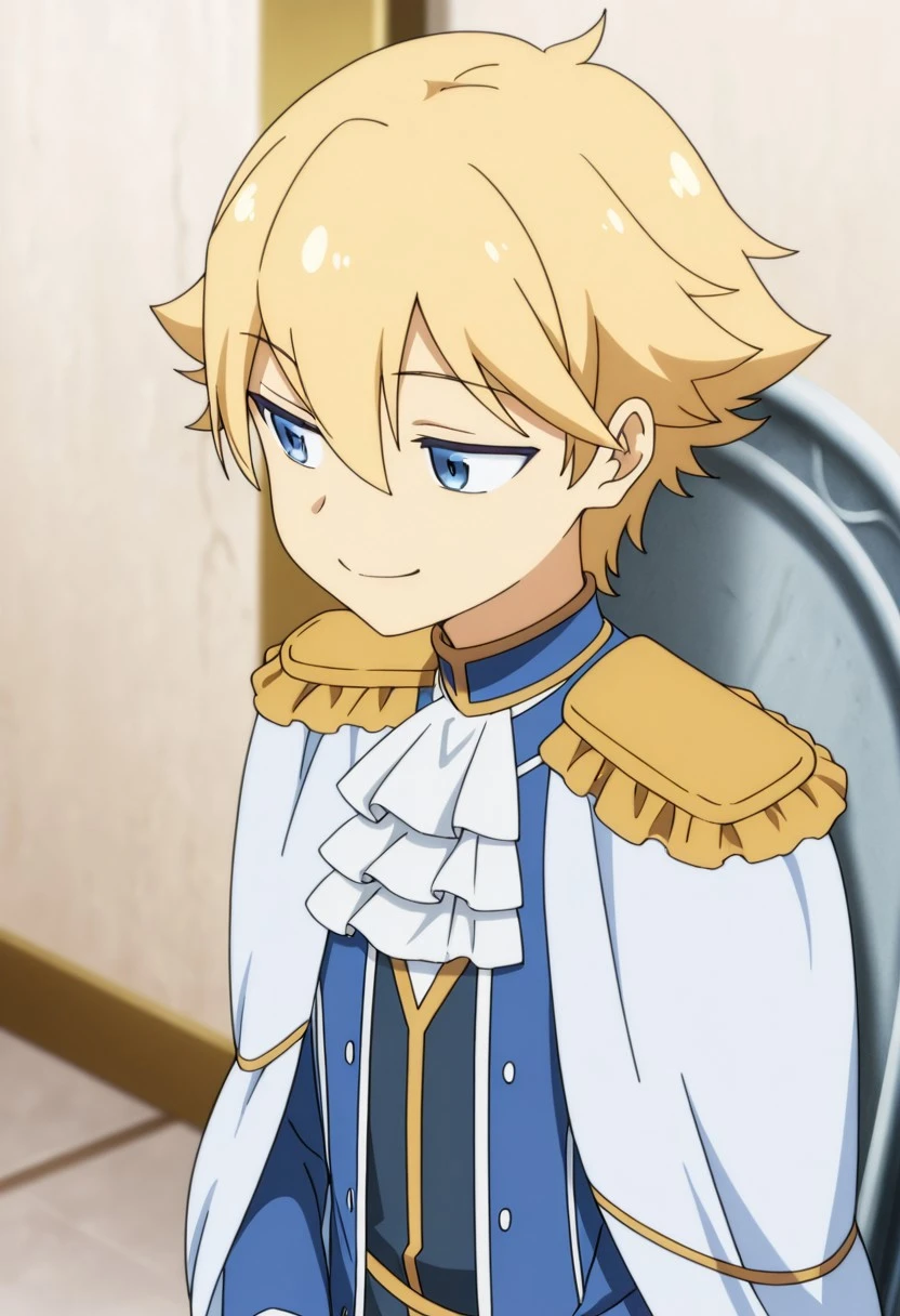 1boy, male focus, solo, blue eyes, blonde hair, blue shirt, high collar, white ascot, white cape, epaulettes, blue jacket, open jacket, grey pants, white gloves, boots, black footwear,