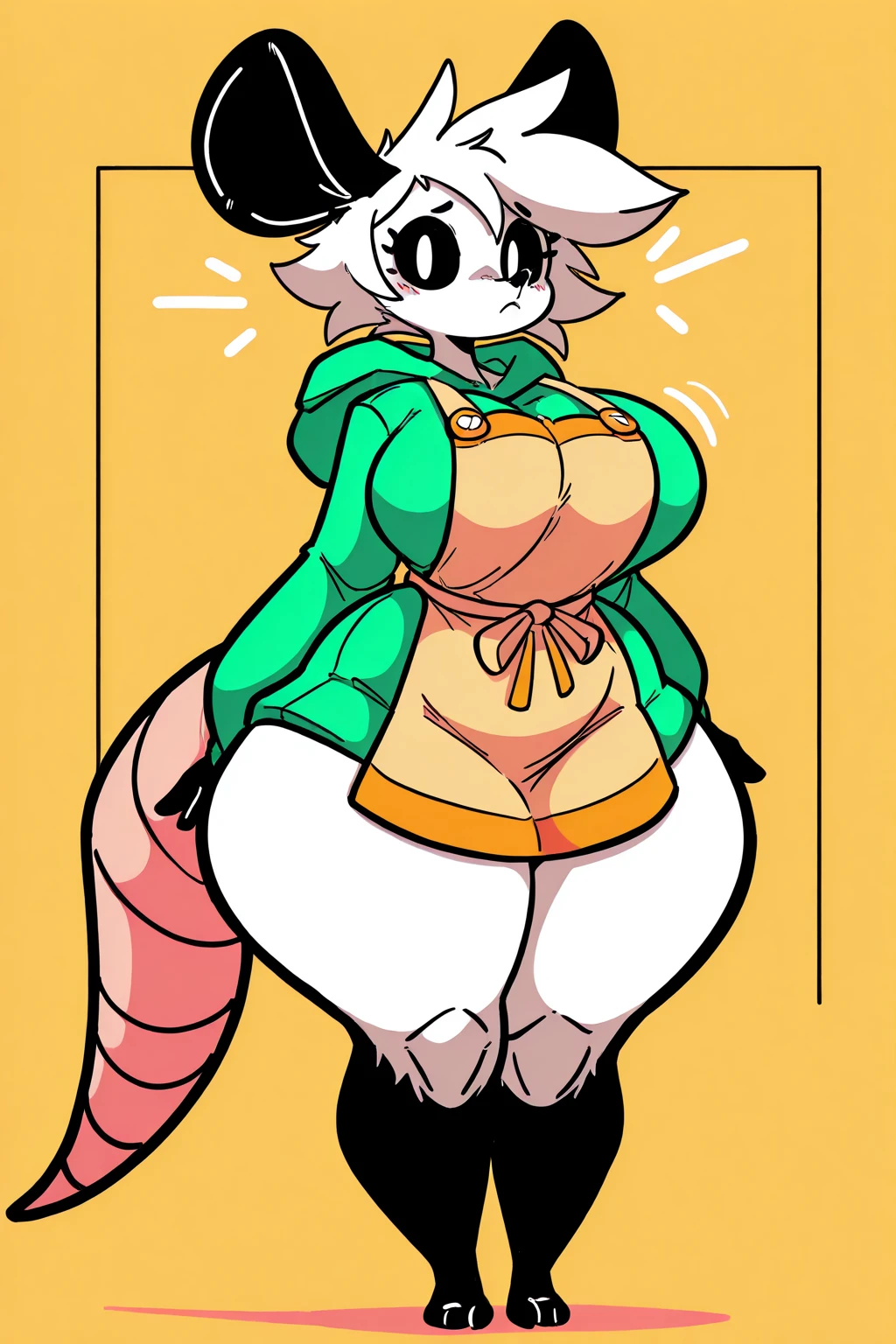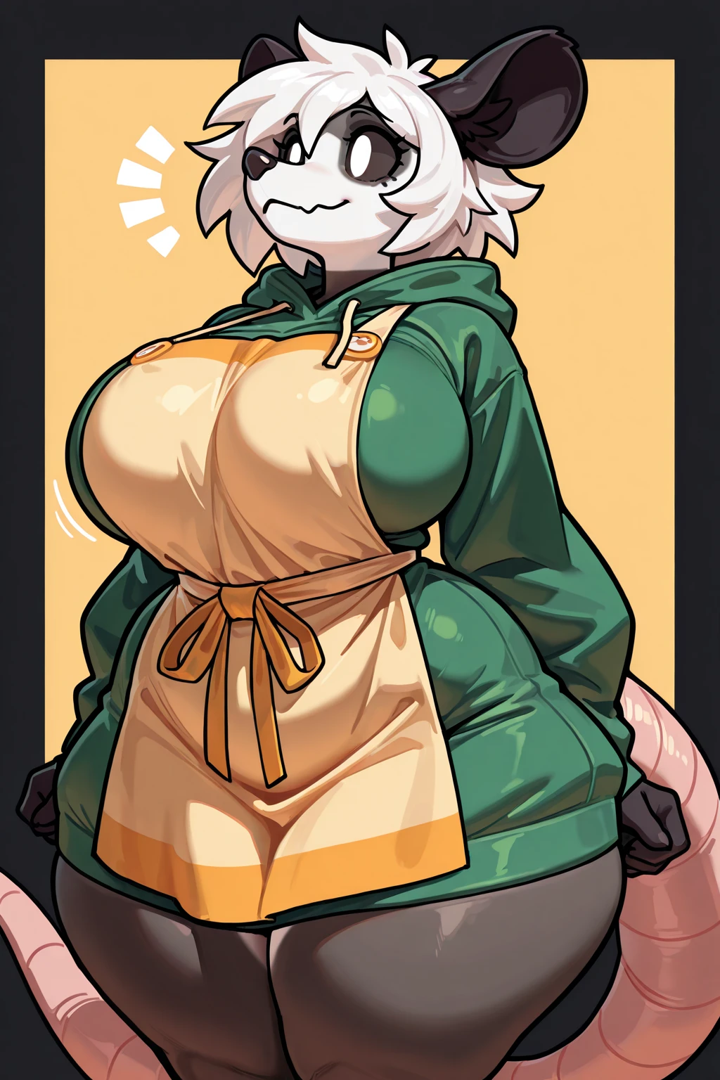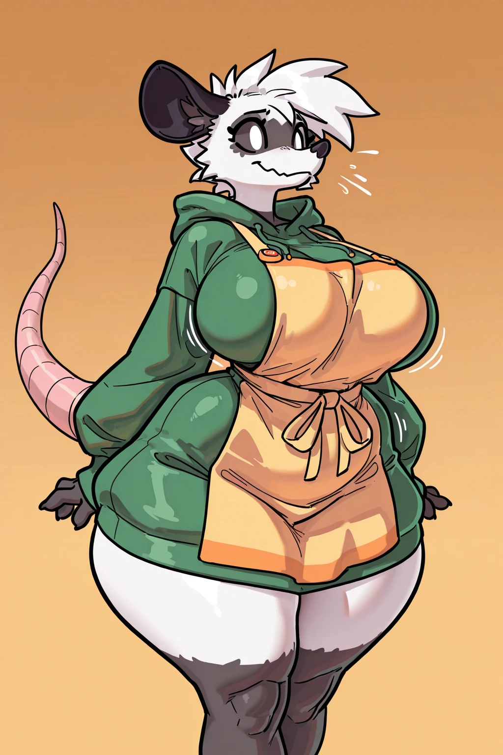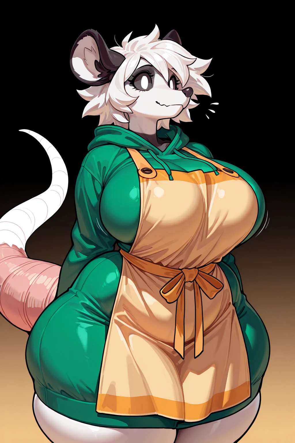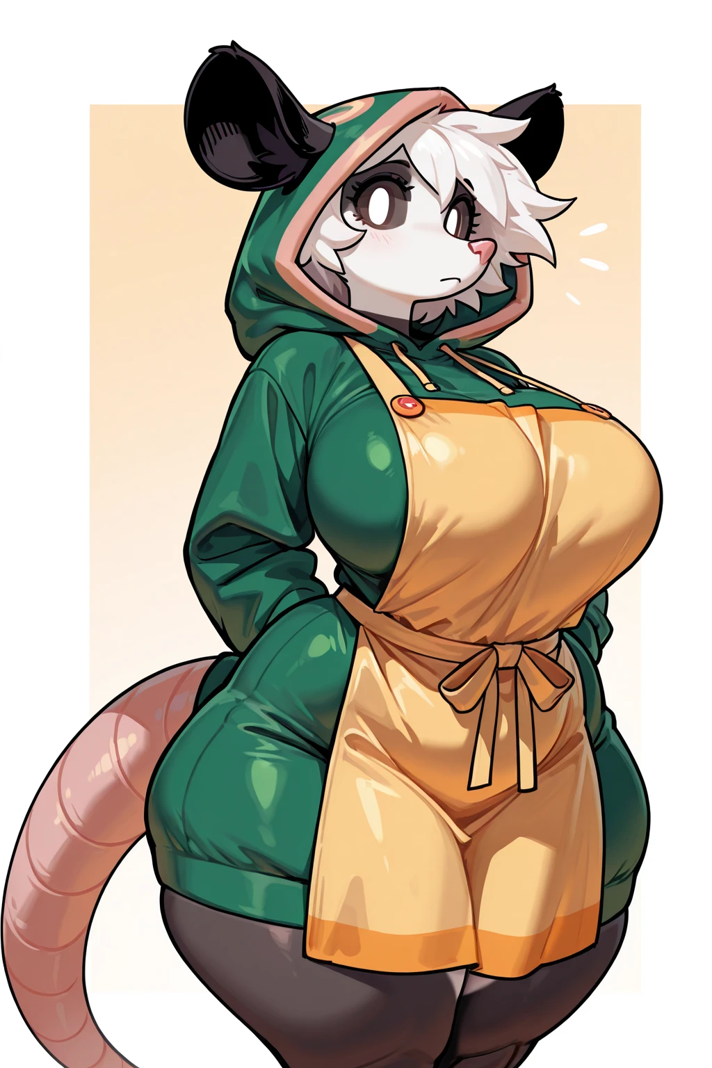 anthro, opossum, big breasts, wide hips, thick thighs, voluptuous, white body, white hair, hoodie, round ears, green robe, yellow apron
