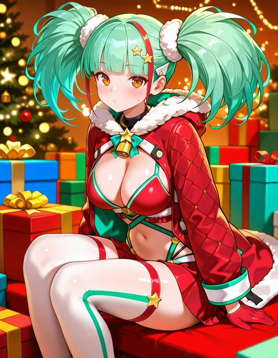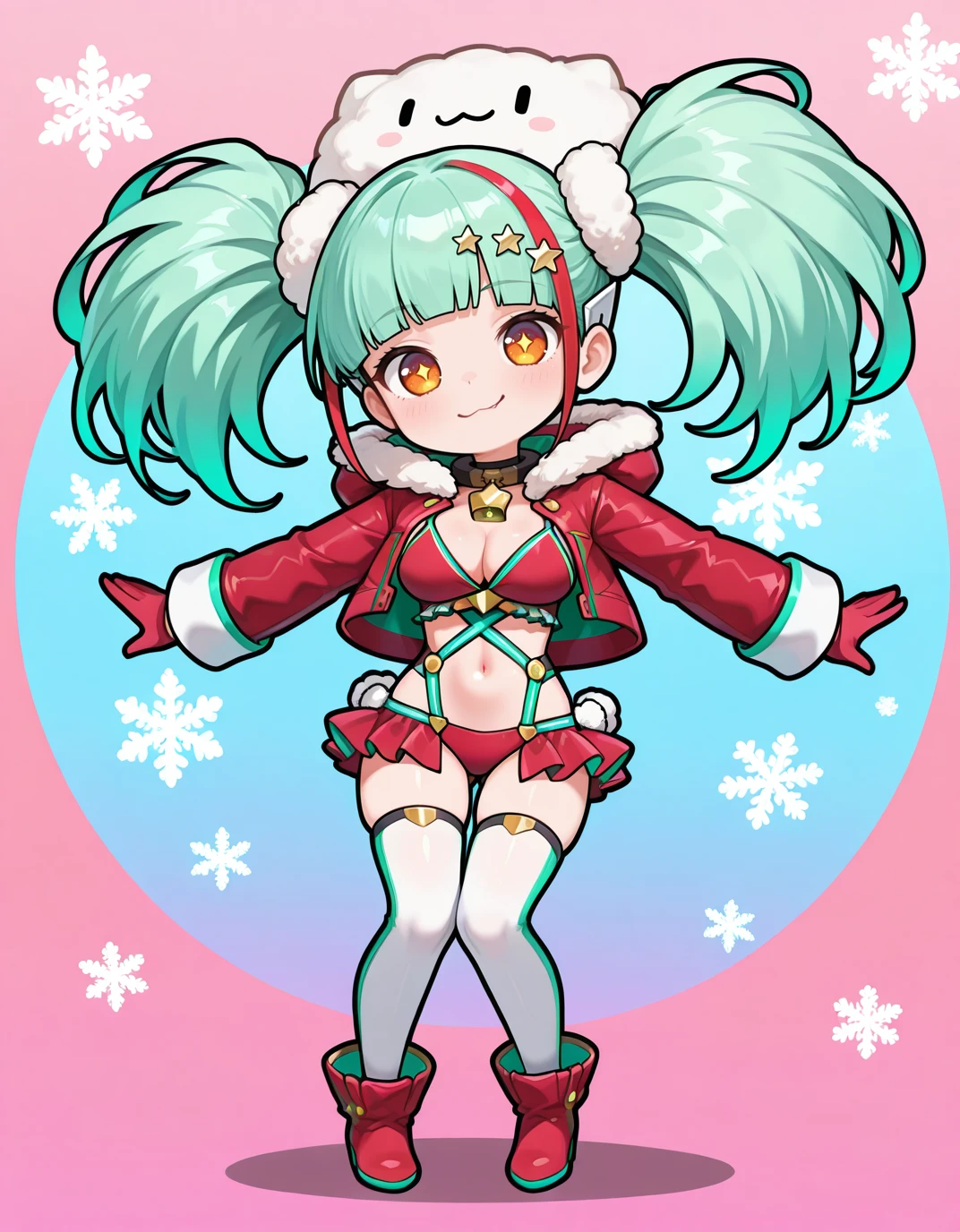 Recommended Prompts: PadMenoaChristmas,(general),1girl, multicolored hair,lightgreen hair,red streaked hair,blunt bangs,twintails, star hair ornament,fur-trimmed hair ornaments, orange eyes, neck bell, red coat,open jacket,red gloves,red showgirl skirt,white thighhighs,