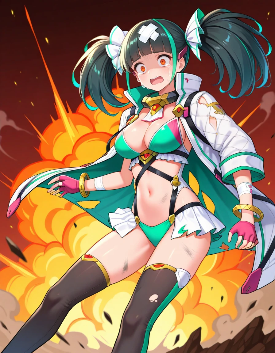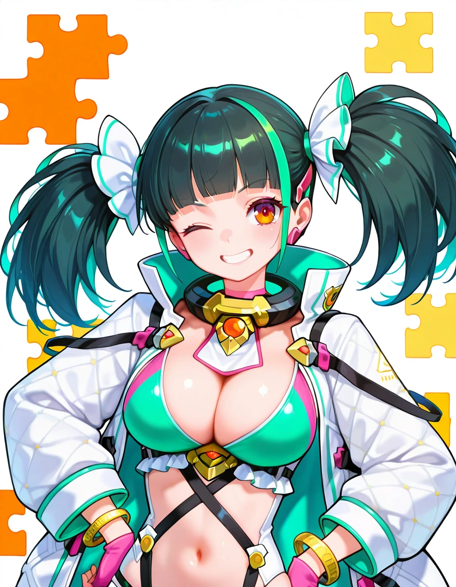 Recommended Prompts: PadMenoa,(general),1girl,multicolored hair,black hair, green streaked hair,orange eyes,blunt bangs,twintails, hair ornaments,white jacket,open jacket, fingerless pink gloves,bracelet,showgirl skirt,,two-tone thighhighs, white boots,