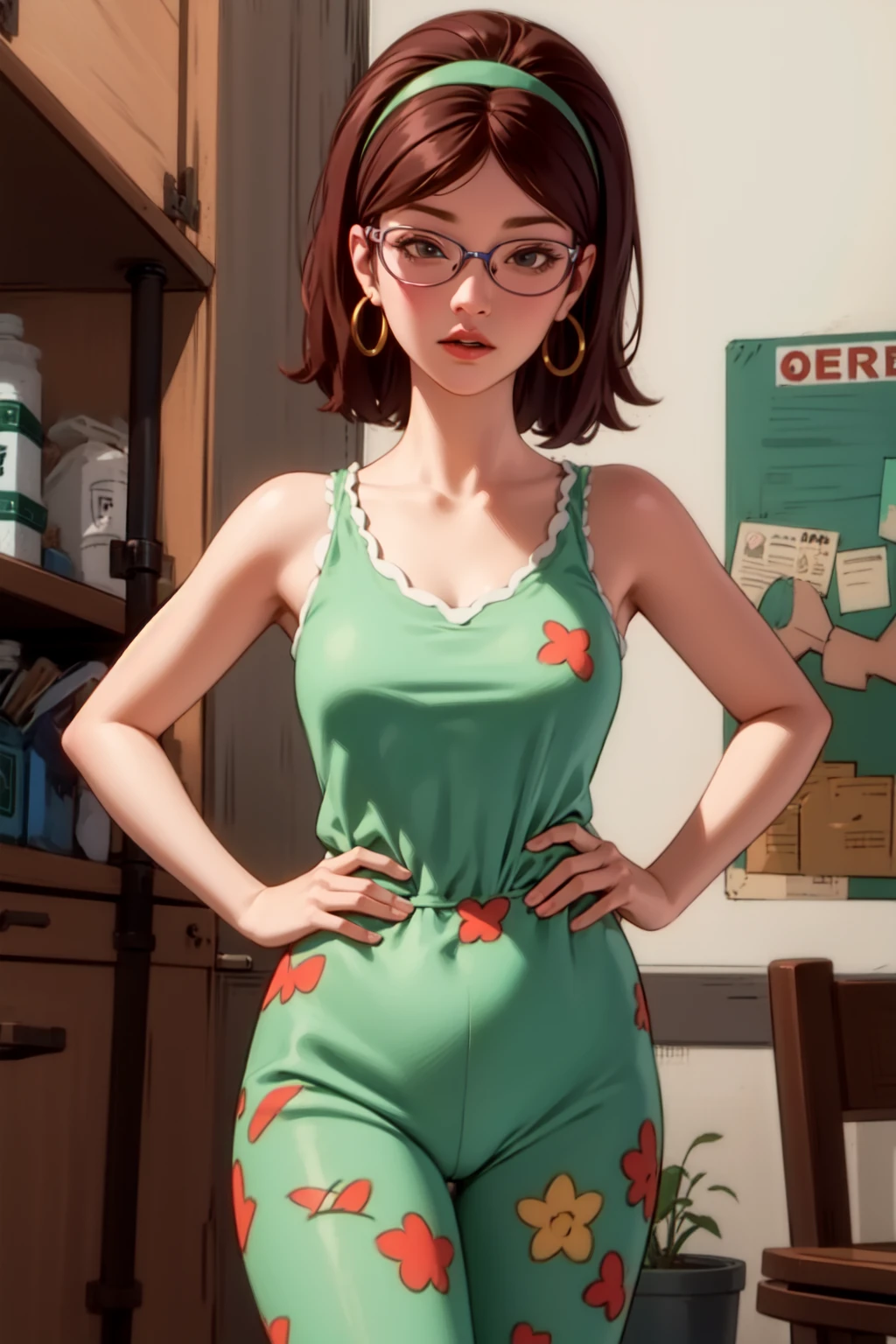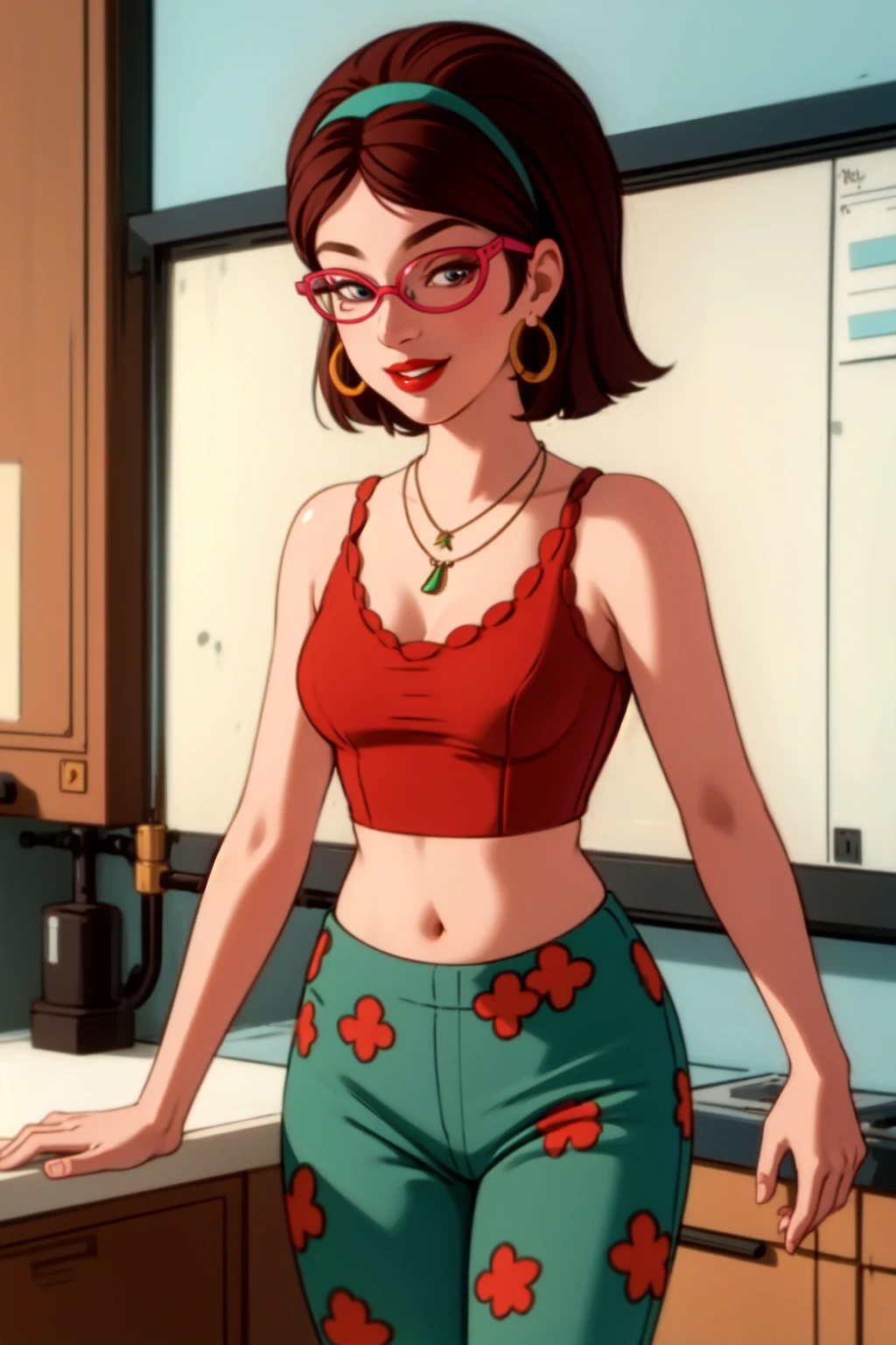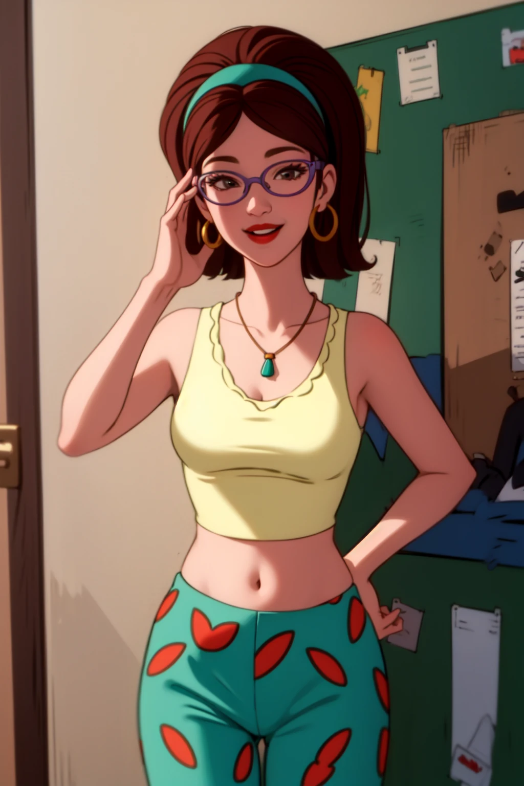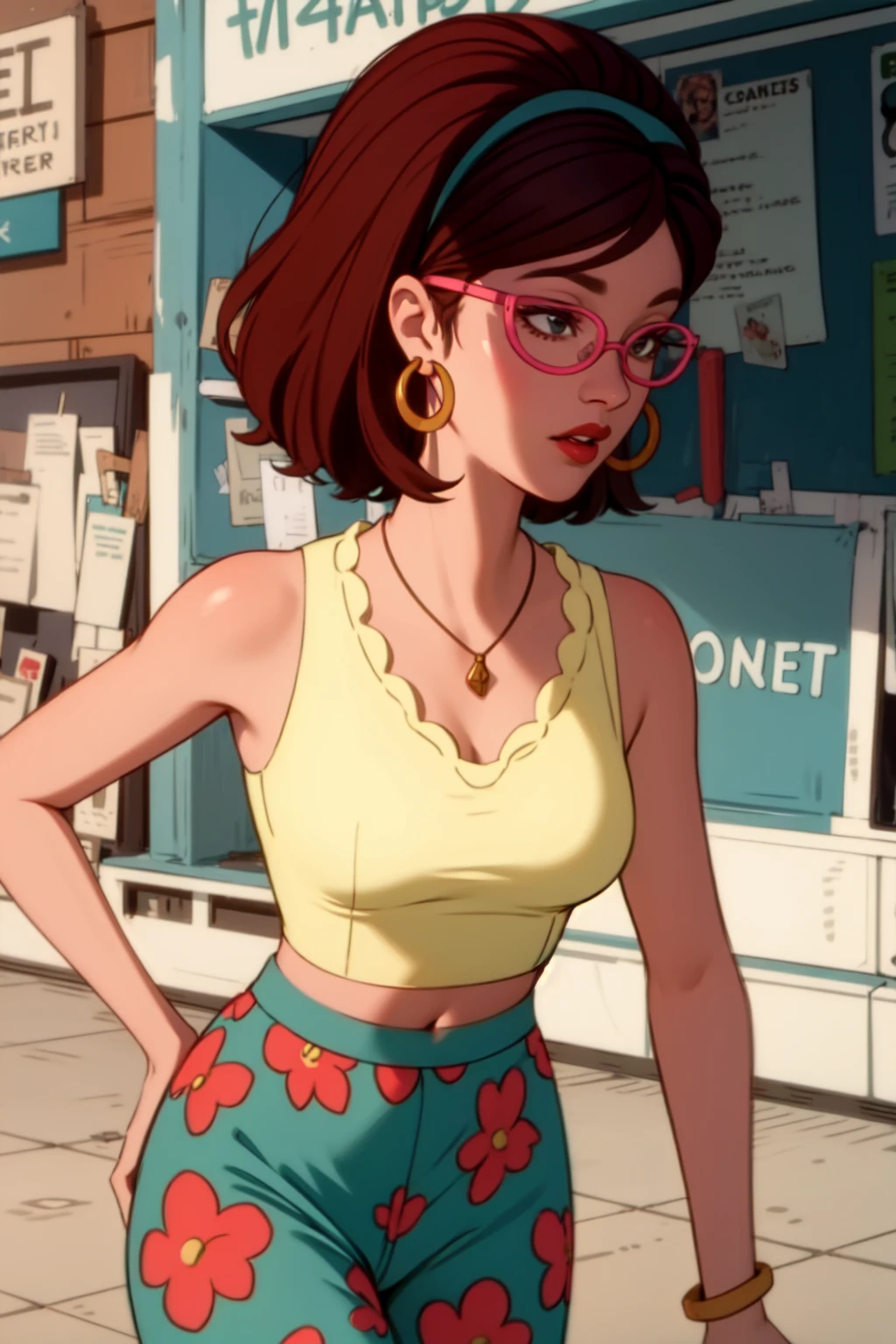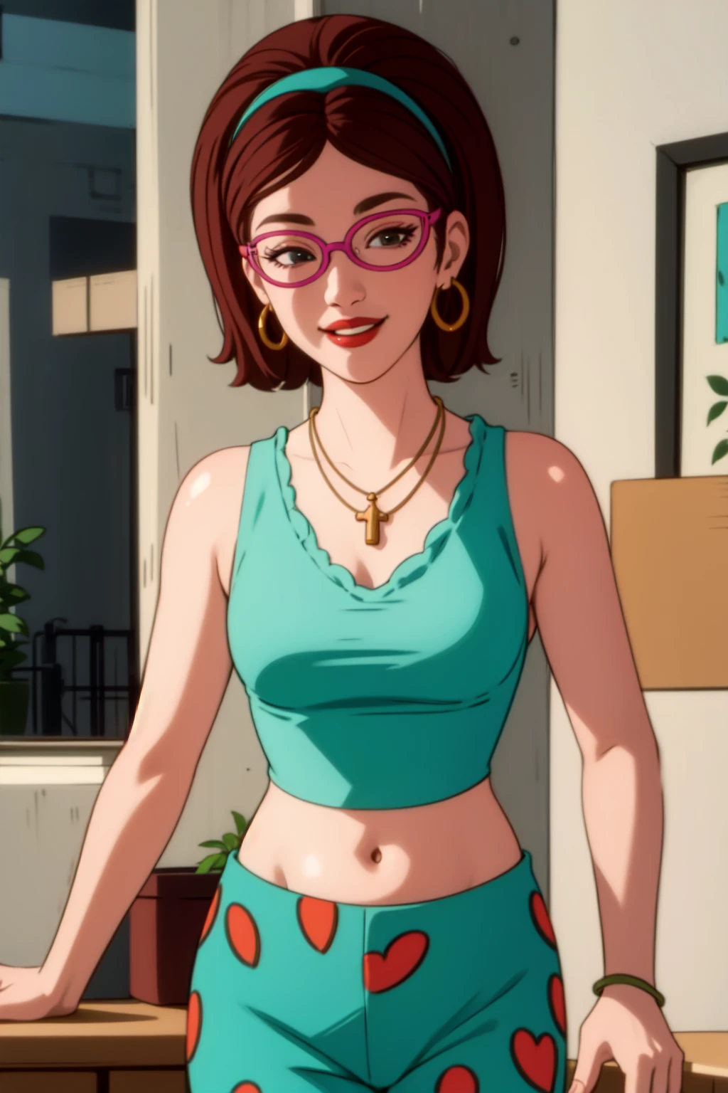 Her regular colors scheme is yellow tank top and green pants. You can also use leggings instead. Combine with polka dot or include it in the negatives if it overwhelms the generations.