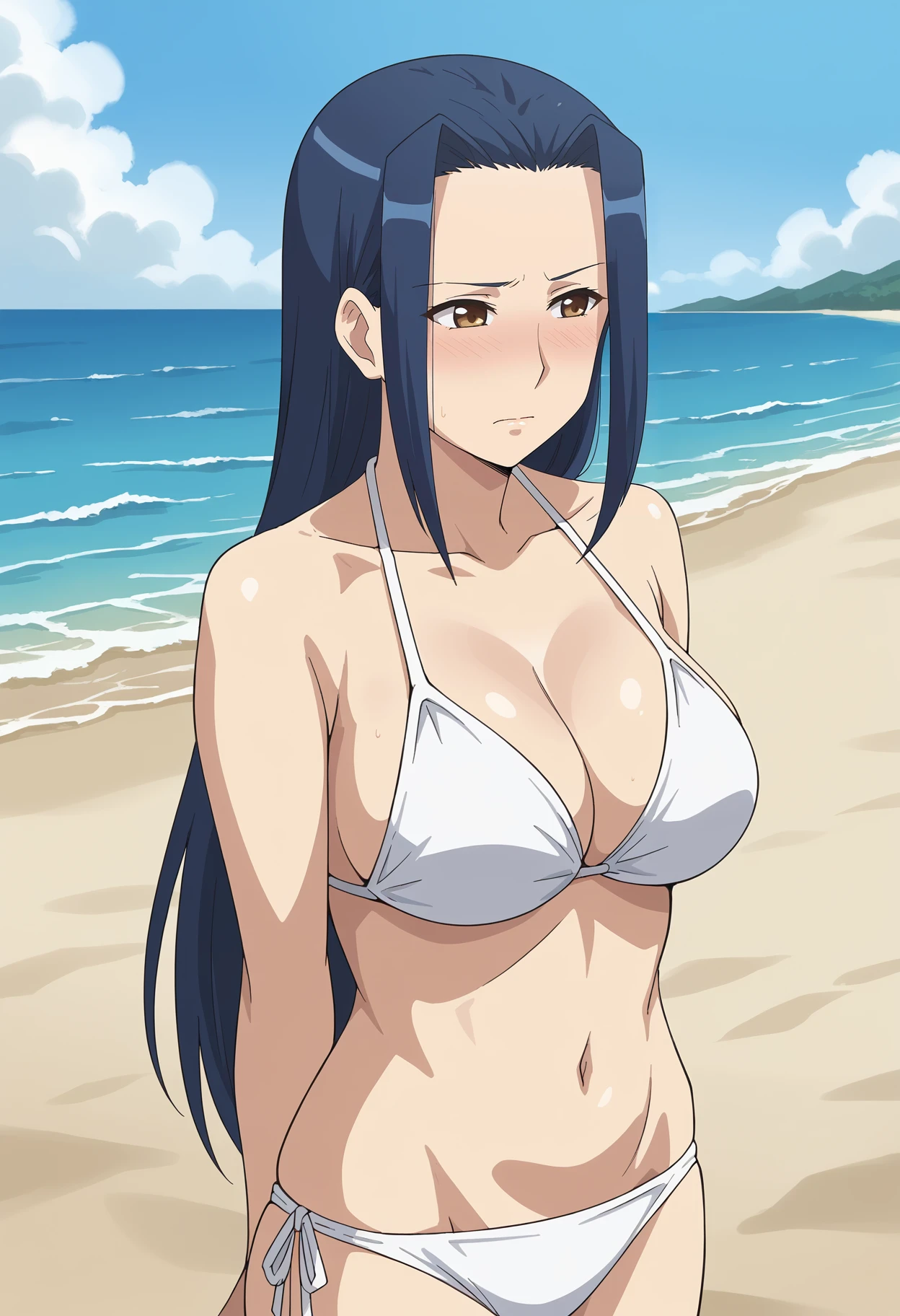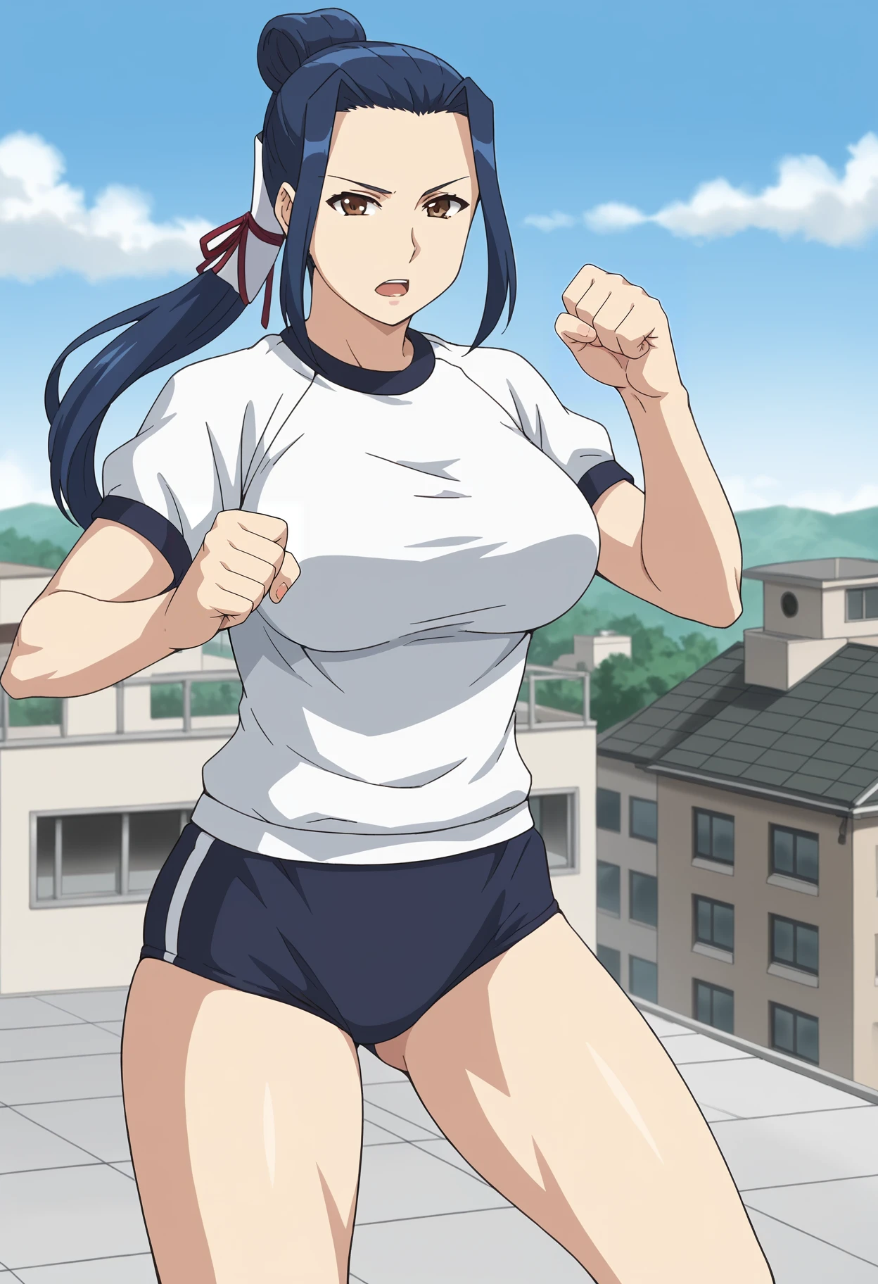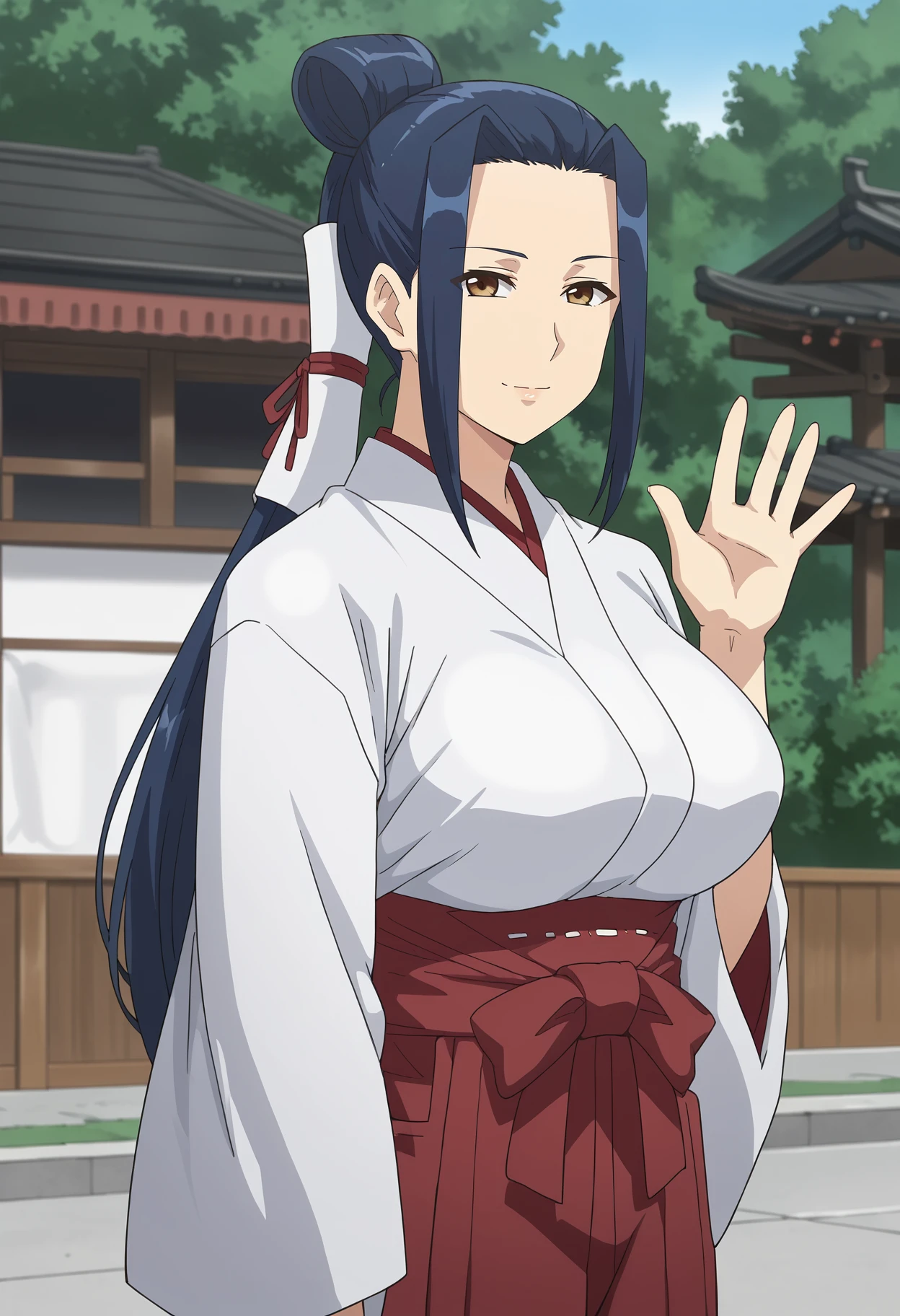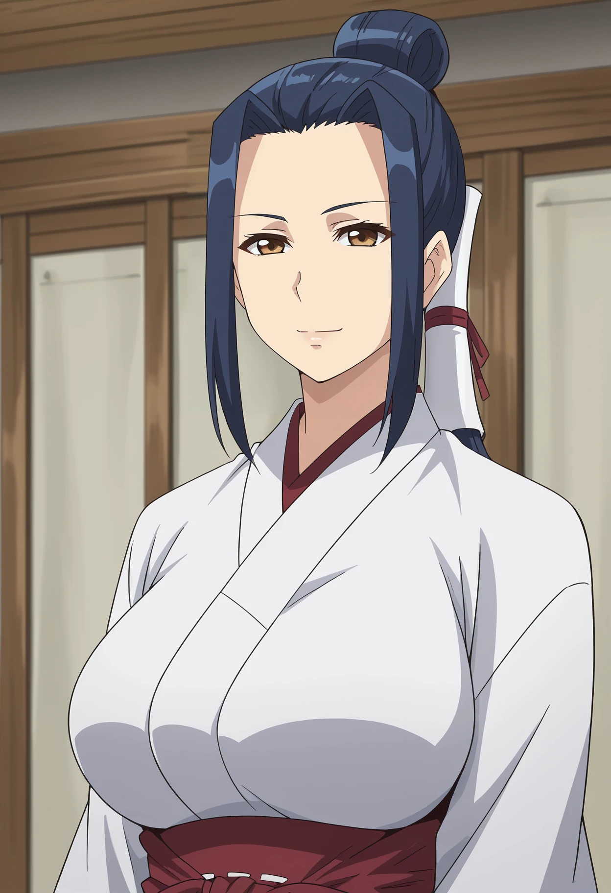 mm,mature female,blue hair,brown eyes,long hair,ponytail,hair bun,large breasts,anime coloring