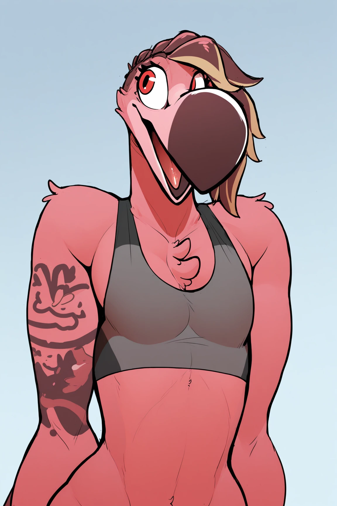 by ritts, natey (ritts), furry, furry male, anthro, avian, bird, flamingo, intersex, andromorph, pink hair, long hair, blonde highlights, highlights (coloring), red eyes, animal nose, animal ears, beak, pink fur, body fur, pink feathers, feathers, tail, toe claws, tattoo, 1boy, solo, sports bra, tattoo, brown hair, short hair, upper body, tongue, open mouth, light blue background, gradient background, simple background Below is an initial configuration, but any other type of configuration is up to you: