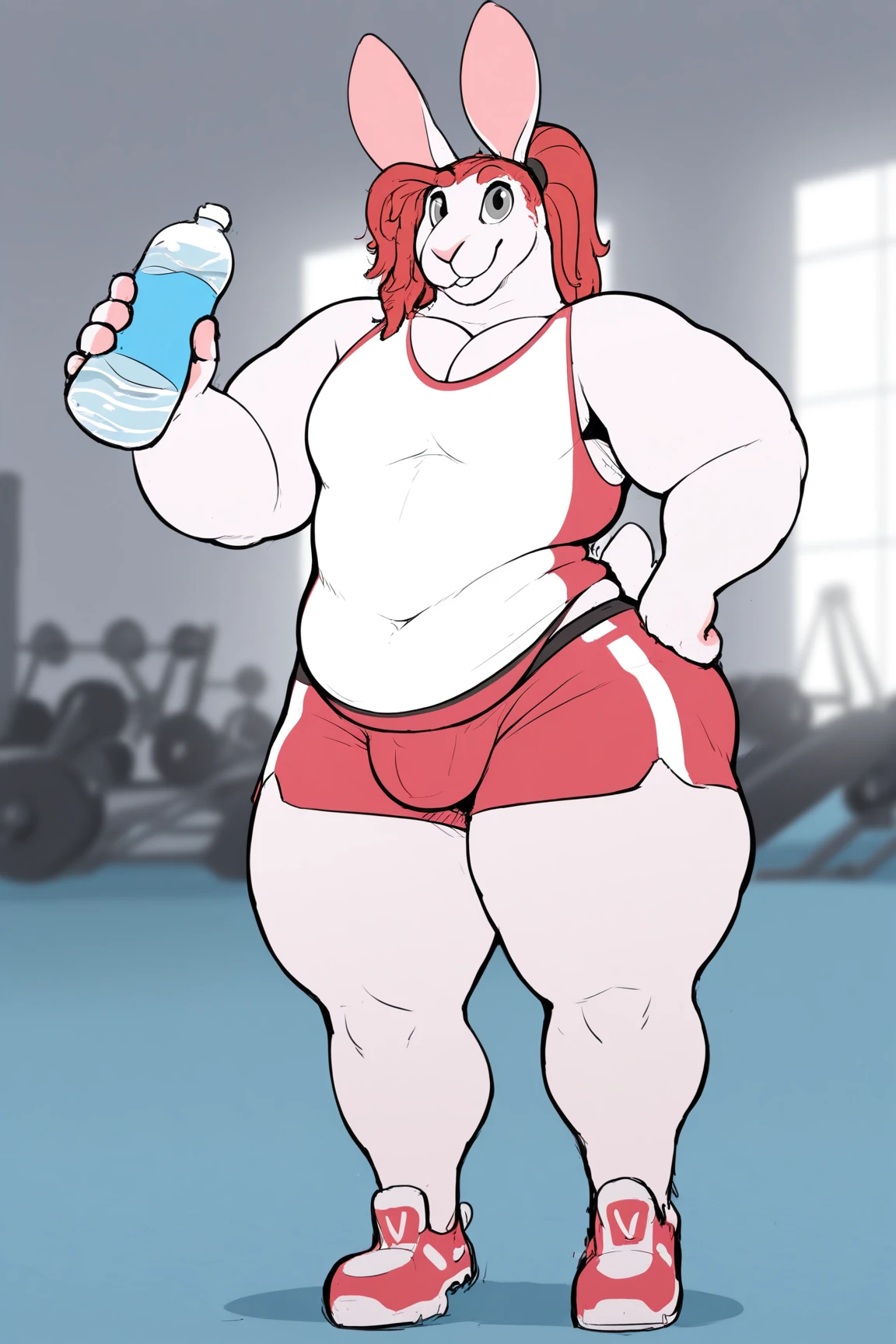 by ritts, alan white (ritts), furry, furry male, anthro, lagomorph, leporid, rabbit, red hair, long hair, grey eyes, animal nose, animal ears, snout, pink nose, white fur, body fur, overweight, overweight male, slightly chubby, thick thighs, tail, red chest tuft, 1boy, solo, male focus, hand on hip, bulge, rabbit ears, shoes, thick thighs, white shirt, thighs, sleeveless, holding, standing, light red shorts, smile, bottle, water bottle, ponytail, pectorals, sleeveless shirt, looking at viewer, gym, blurry background, front viewNatey