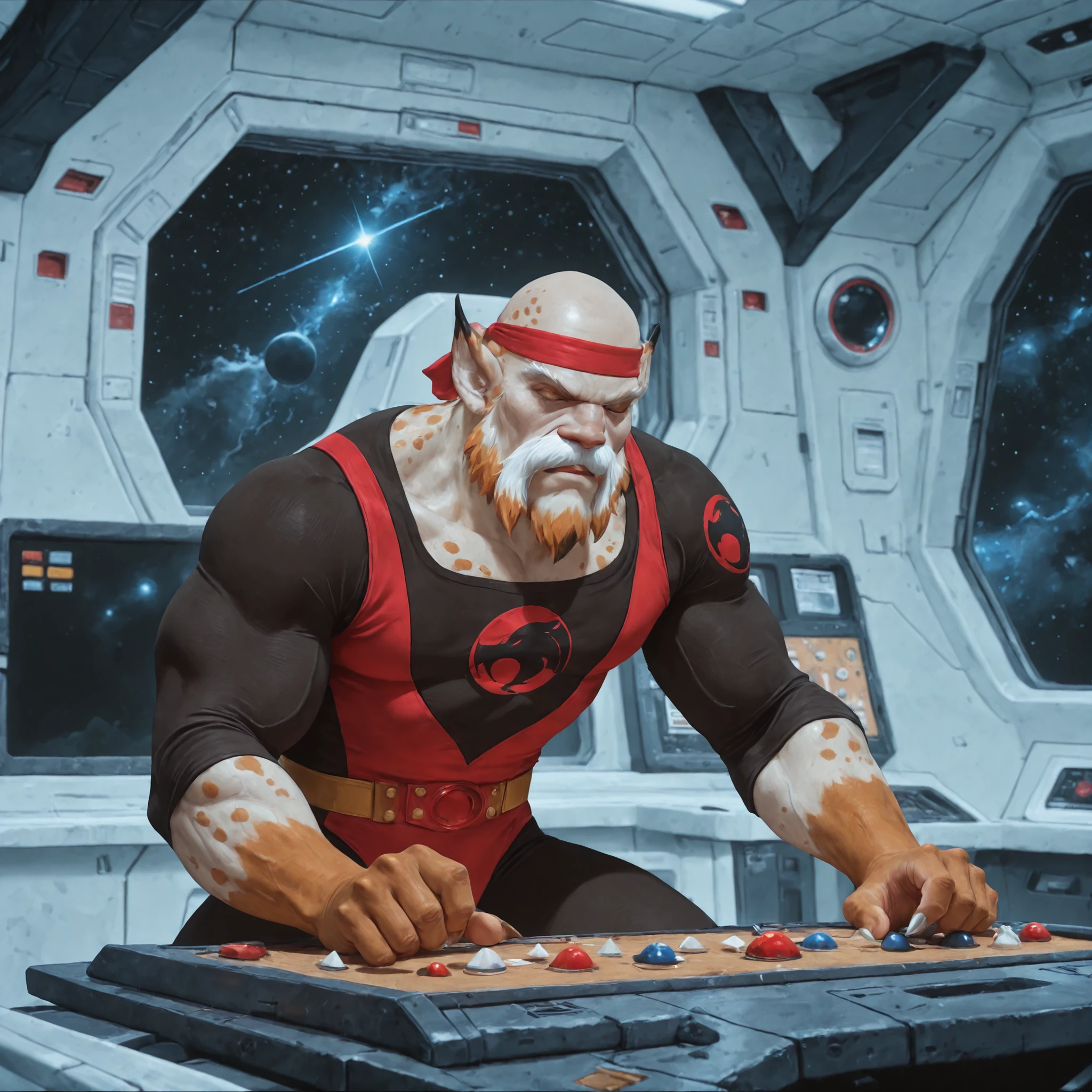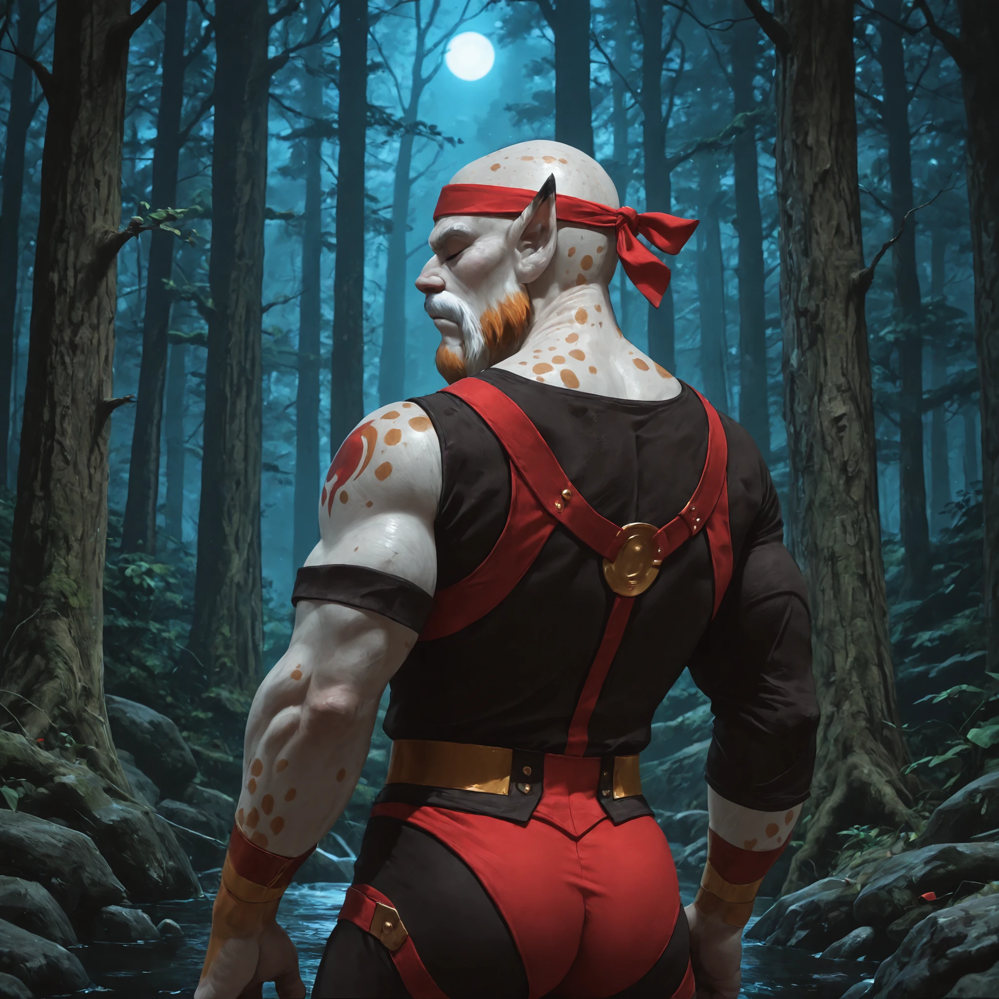 Helpful tags: headband, leotard, black tights, multicolored hair, bald, beard, white mustache, spots, pointed ears, ear tufts,