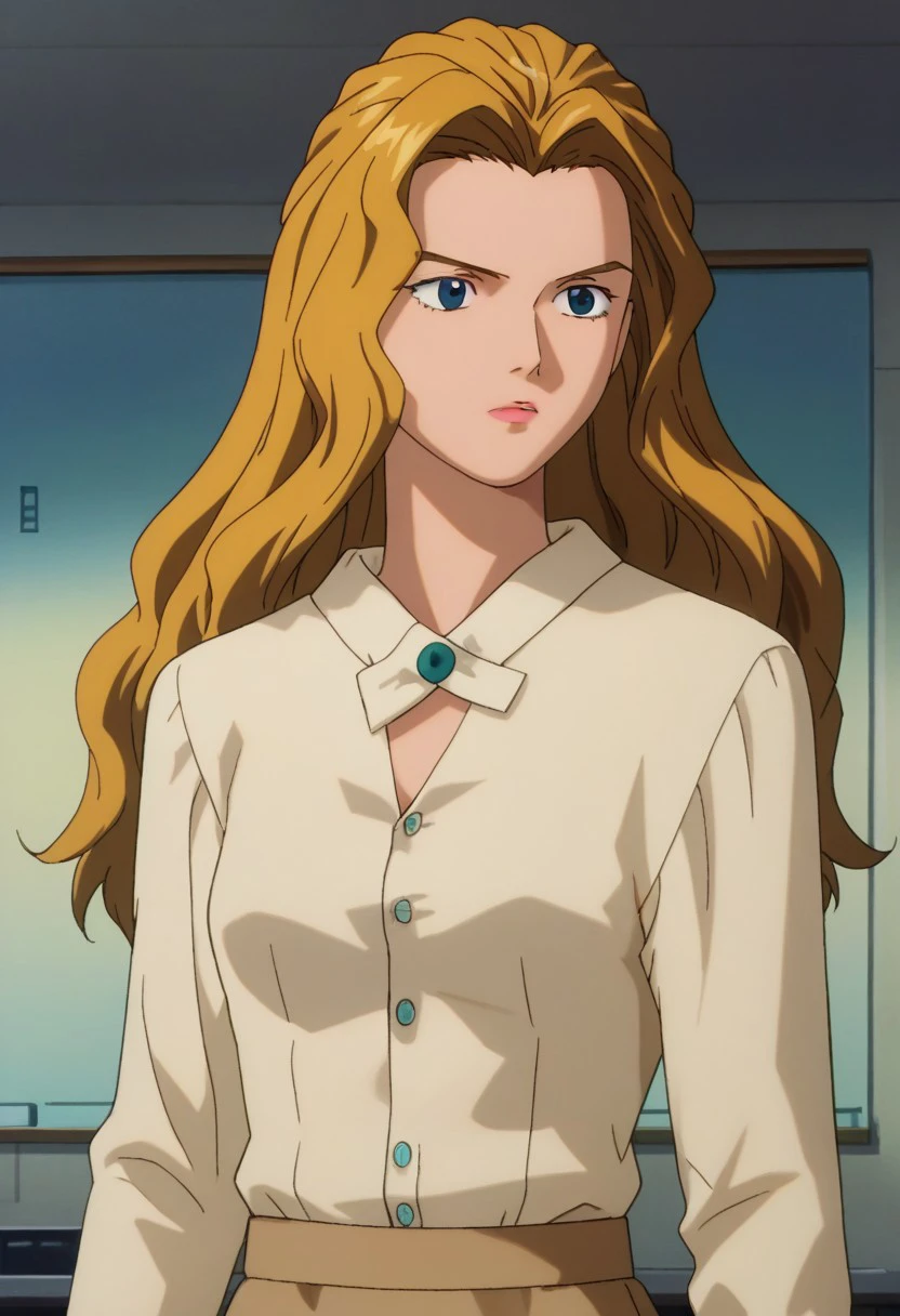 anoamc, 1girl, solo, blue yes, blonde hair, long hair, shirt, white shirt, buttons, skirt,
