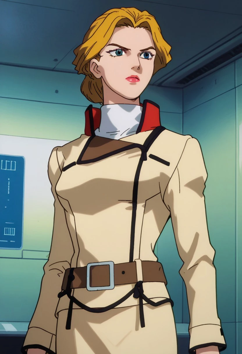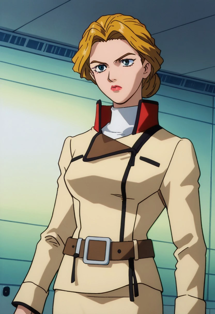 anoamc, 1girl, solo, blue yes, blonde hair, hair bun, lipstick, uniform, military, military uniform, shirt, white shirt, turtleneck, jacket, belt, skirt,
