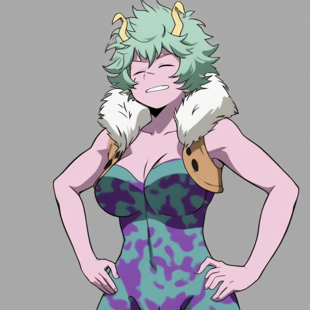 1girl, Mina_Ashido, light lavender-pink skin, fit and curvy athletic physique, short bright fluffy pink spiky hair, two small tan curved horns on her head, large expressive eyes, black sclera, yellow irises, outfit is a tight sleeveless camouflage-patterned bodysuit in teal or turquoise green and purple, short tan vest with white fur trimming around the collar and sleeves, large brown boots, tan soles and cuffs, appearance is vibrant, confident, and energetic, alien-like yet stylish look, vivid colors, sharp shading
