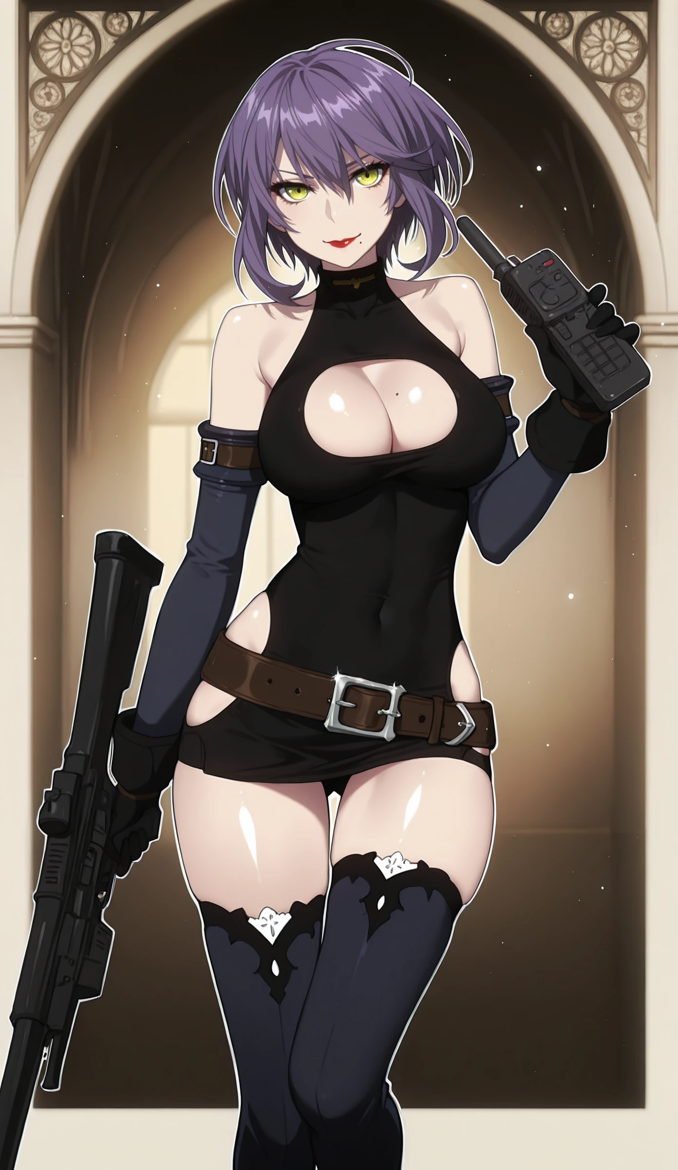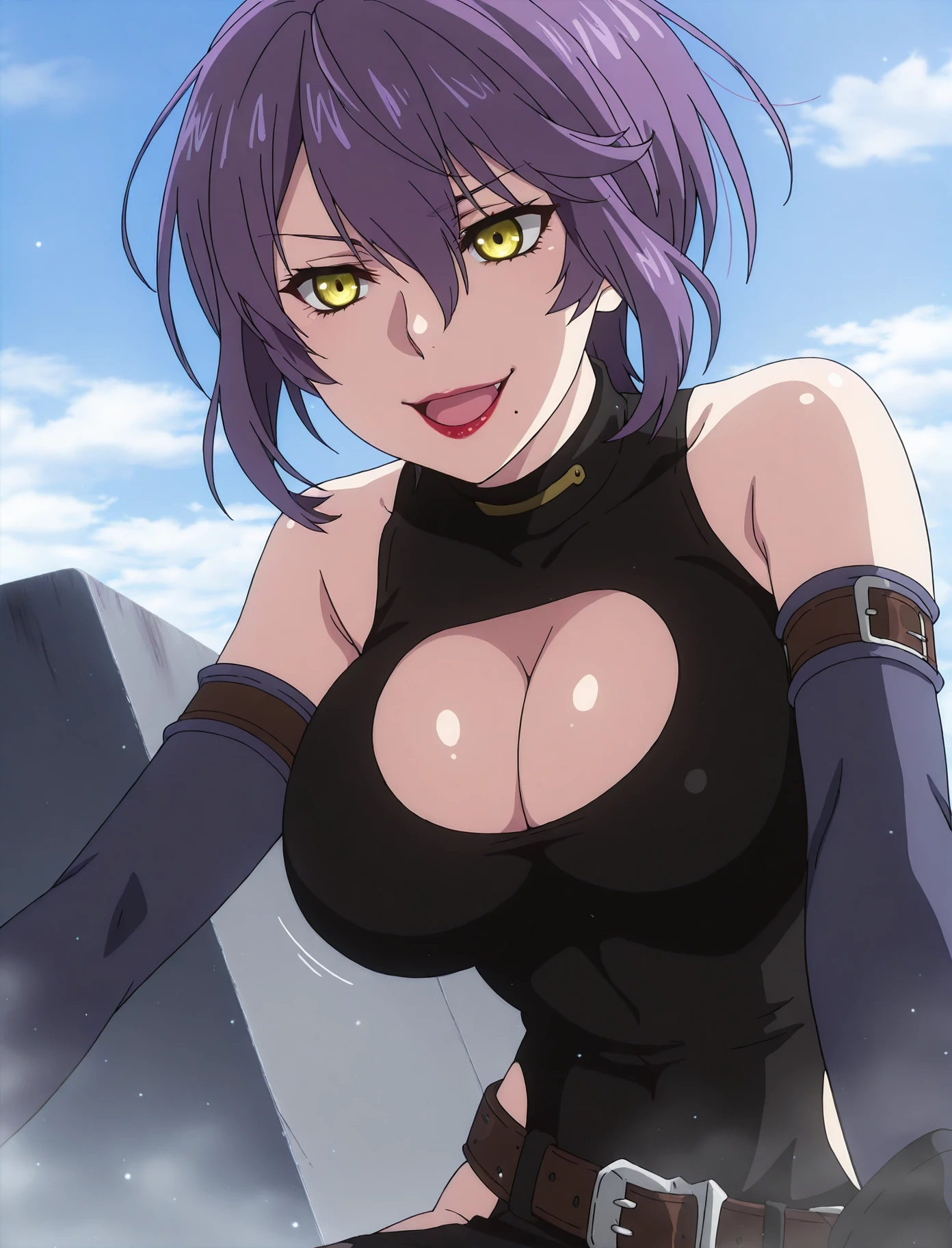 Trigger word: trine_halden, short purple hair, yellow eyes, red lips, big breasts, cleavage, chin mole