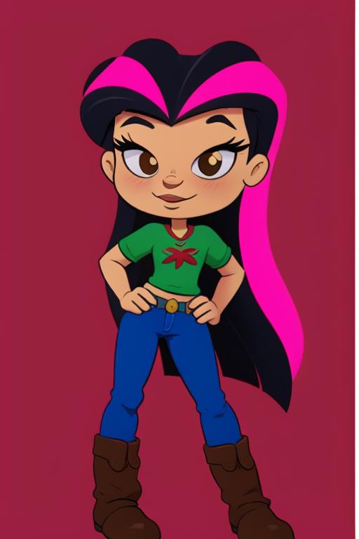 1 cartoon girl with pink lips, aisan american, black long hair, long hair with a pink stripe, tiny breasts, small breasts, petite breasts, flat chest, pink hair stripe, brown eyes, looking at left, closed mouth, happy expression, master piece, great anatomy, perfect eyes, green shirt, blue jeans, black boots,