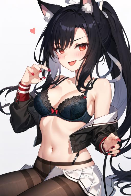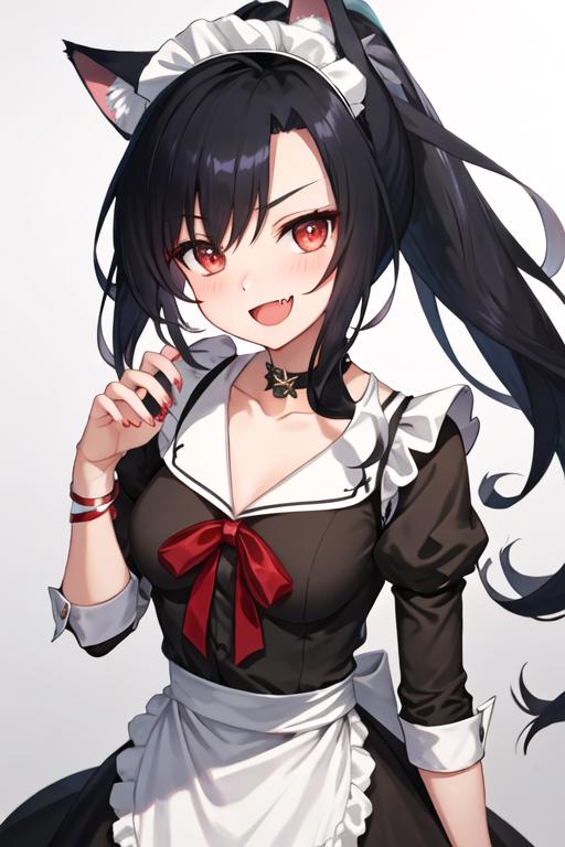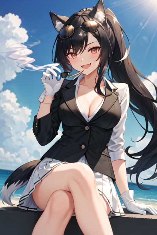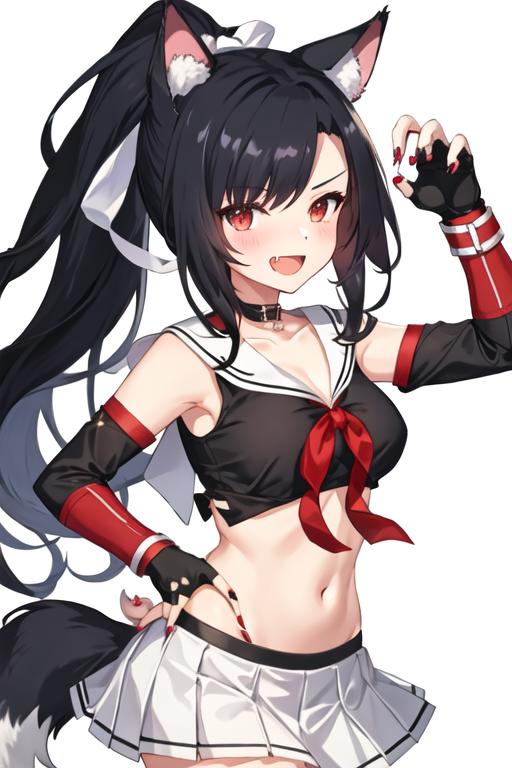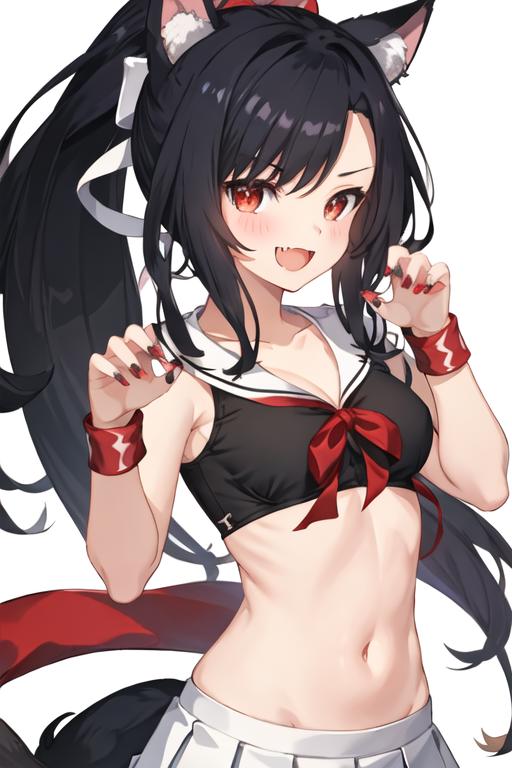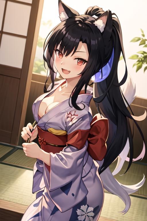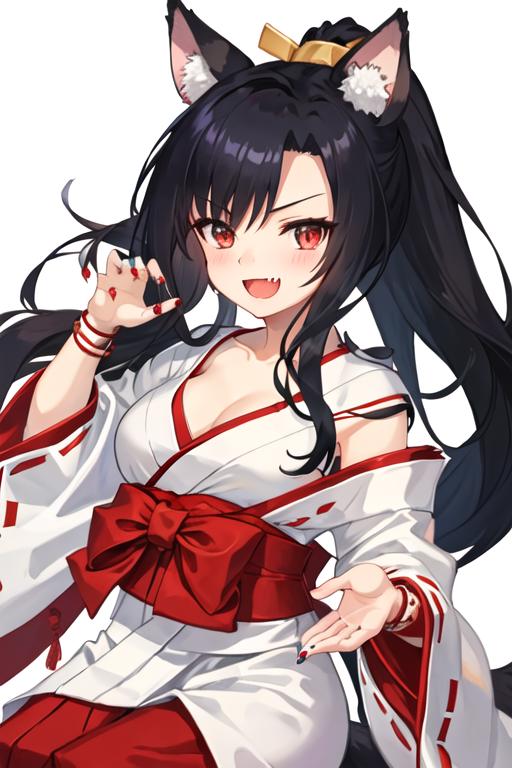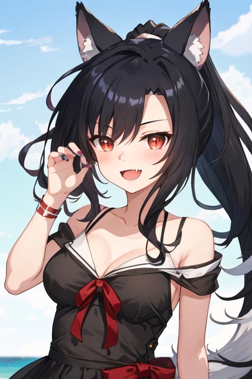 The trigger word is shigure_azurlane, and the recommended tags are best quality, masterpiece, highres, solo, {shigure_azurlane:1.15}, animal_ears, long_hair, black_hair, red_eyes, breasts, wolf_ears, blush, ponytail, smile, fang, medium_breasts, bangs, open_mouth, tail, animal_ear_fluff, wolf_tail, nail_polish, collarbone, ribbon.