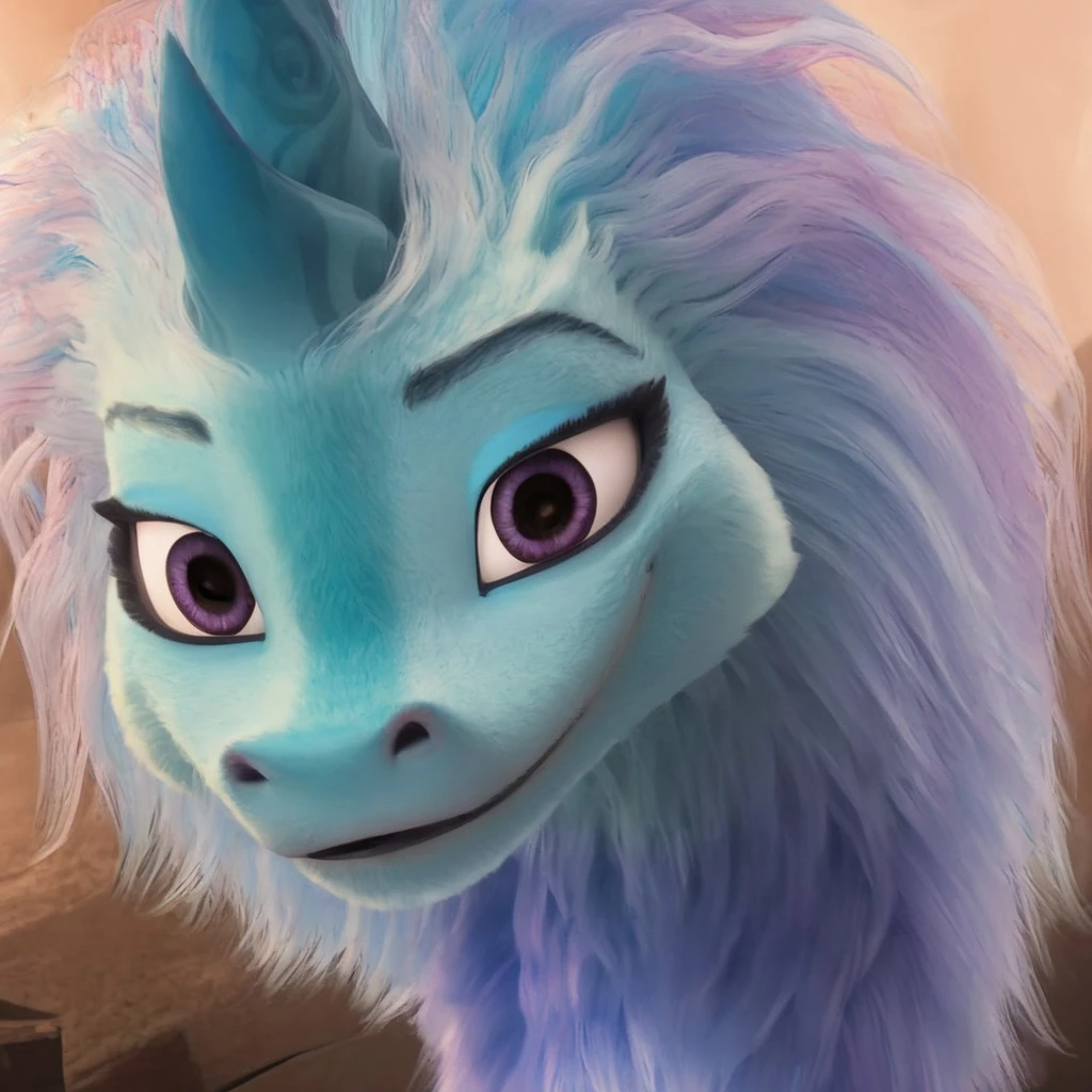 sisu, blue dragon, furry, female, 1girl, fluffy, purple eyes, snout, horn, 3D, realistic,