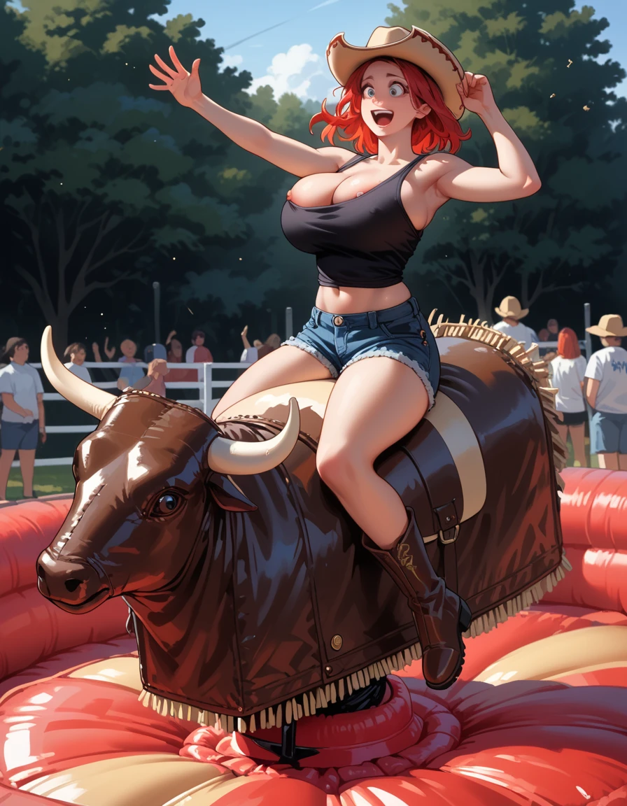Keywords: cowboy hat, smile, COLOR hair, arm up, riding, hud_bullr1de, ground vehicle, animal, horns, inflatable stage (if animal starts messing with it, remove it, same with horns.