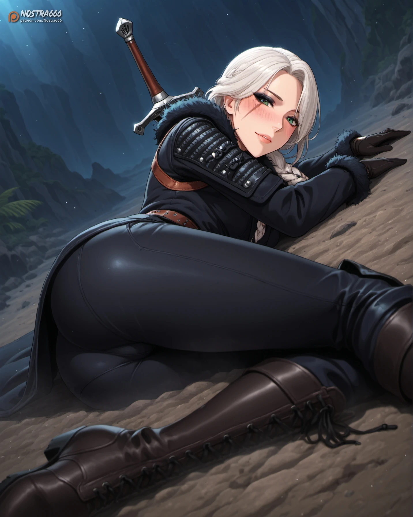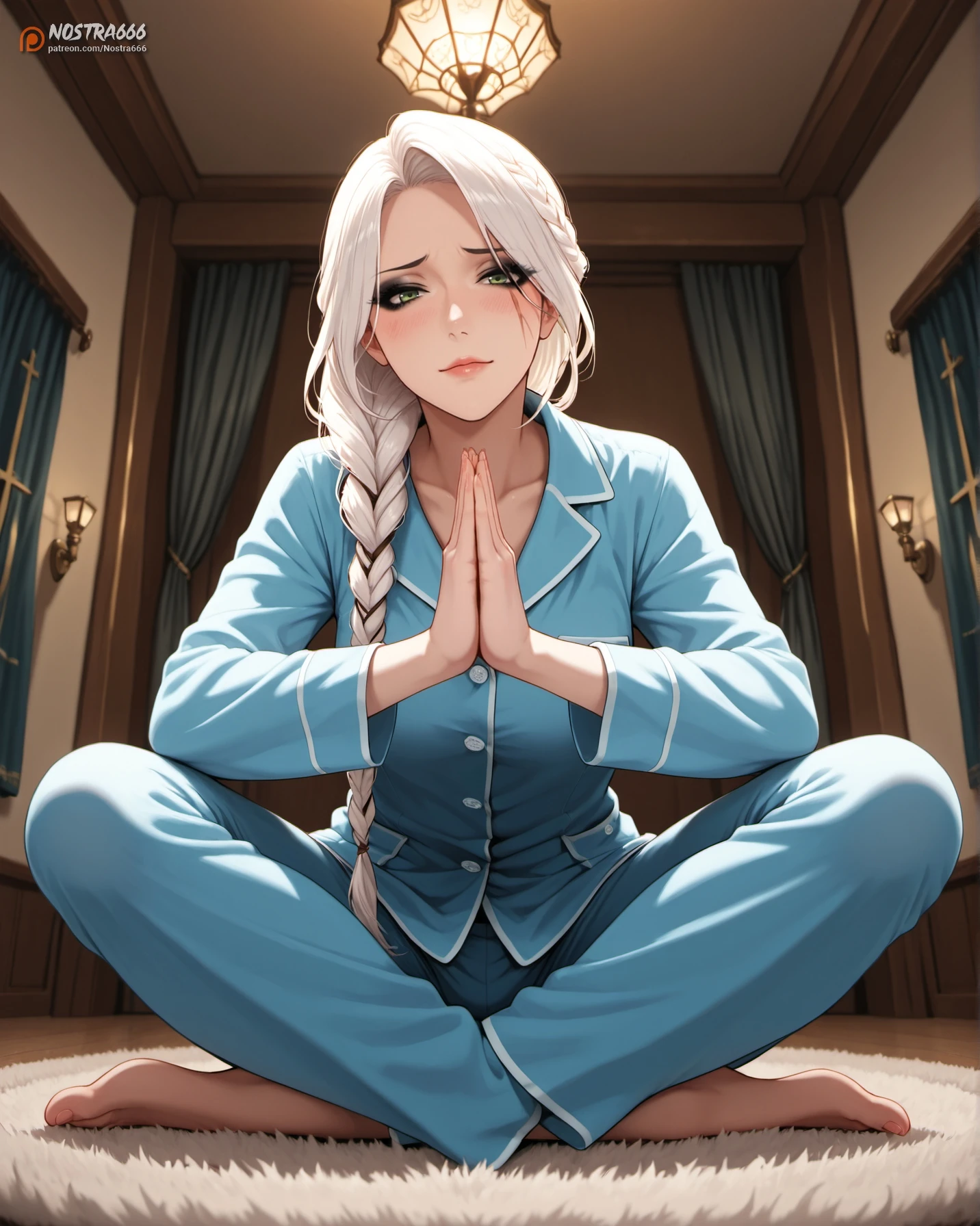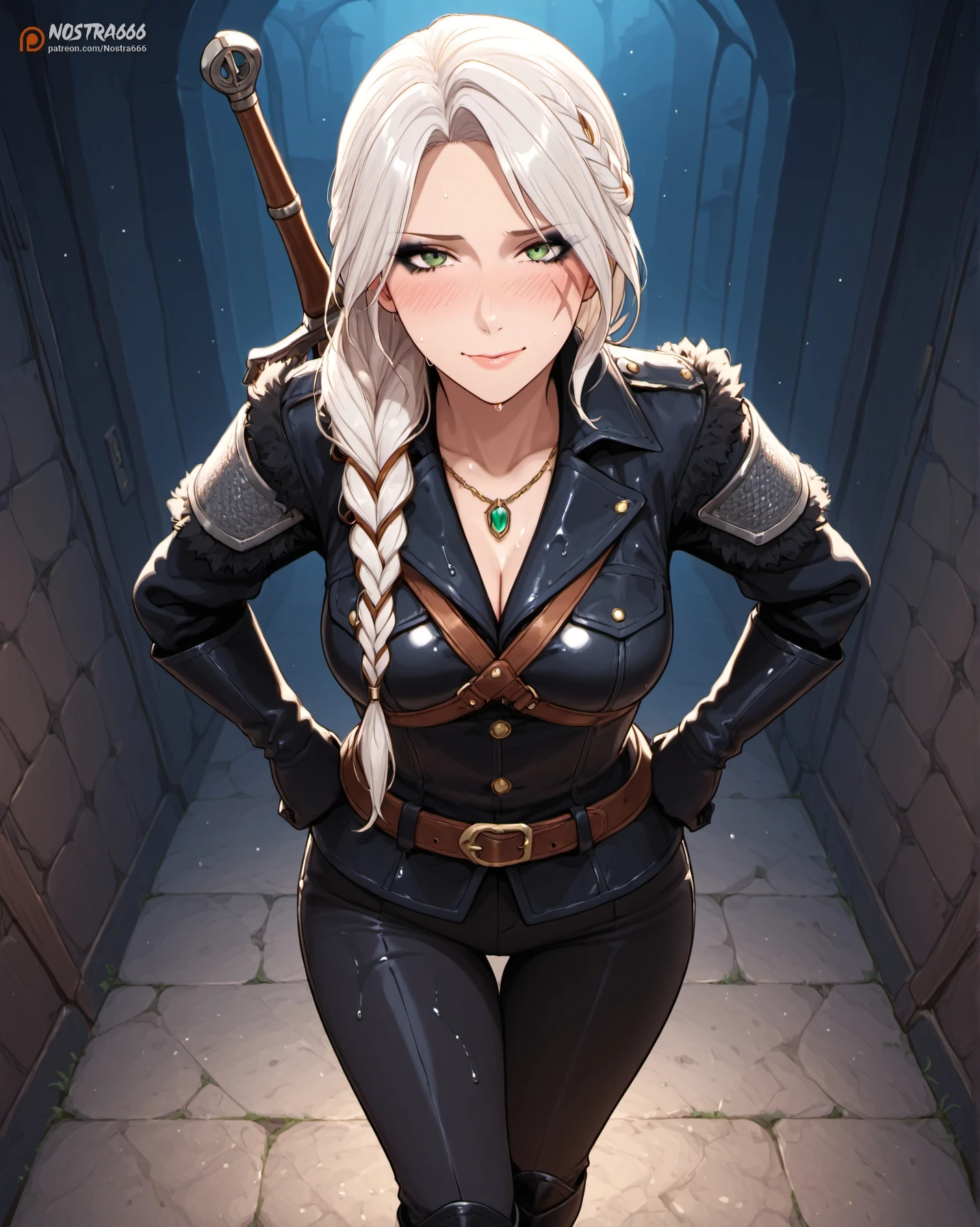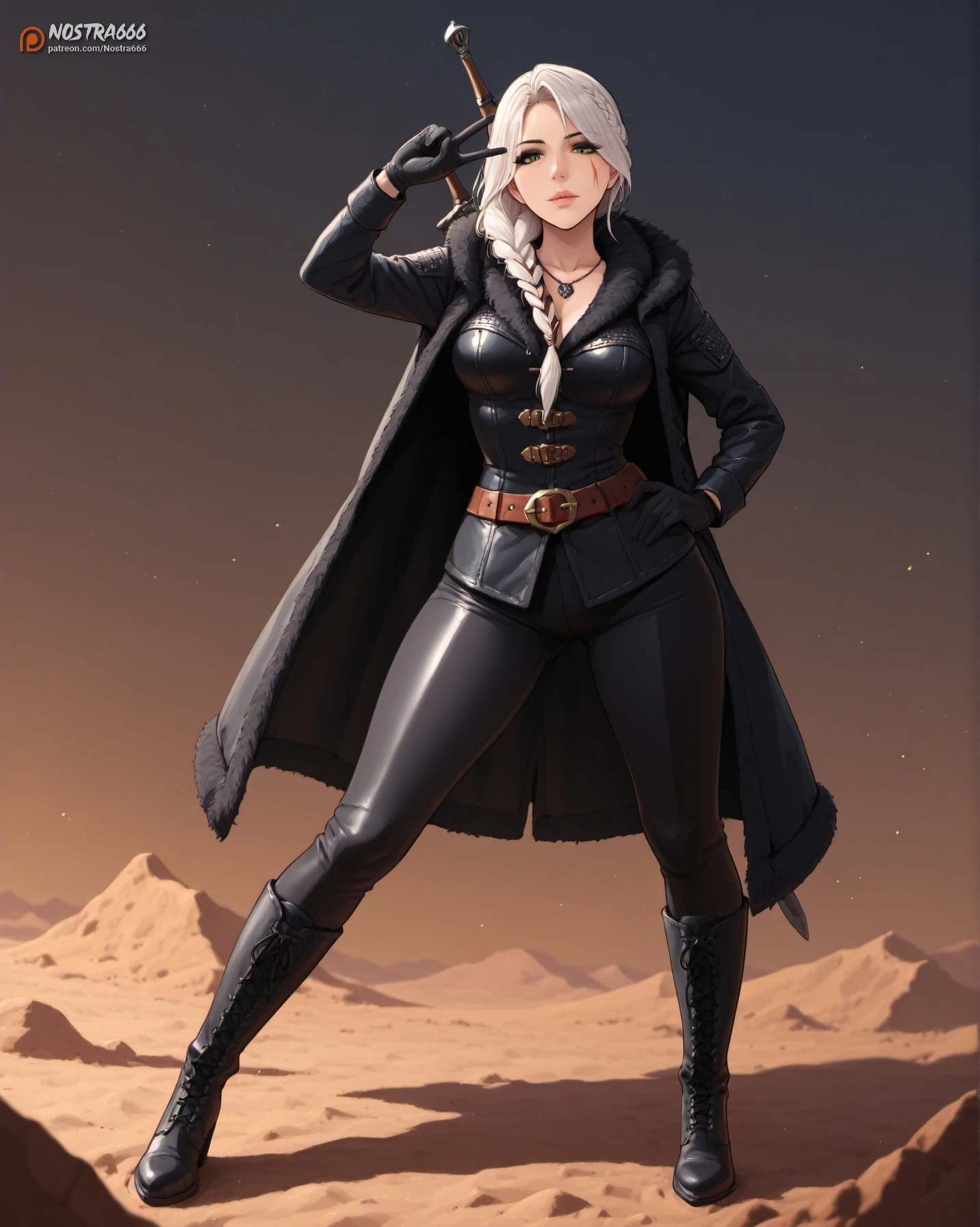 nostraciri4, green eyes, white hair, grey hair, long hair, long braid, scar on the left cheek, scar scar across eye, black eyeshadow, makeup,