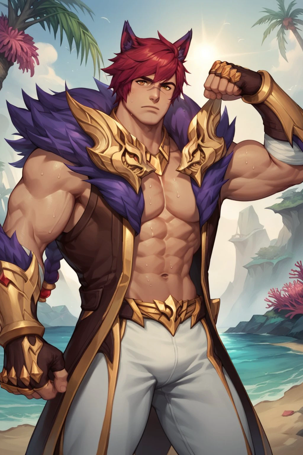 • [Sett, open coat, open clothes, bandages, fingerless gloves, gauntlets, jewelry, white pants, purple fur trim, gold belt]