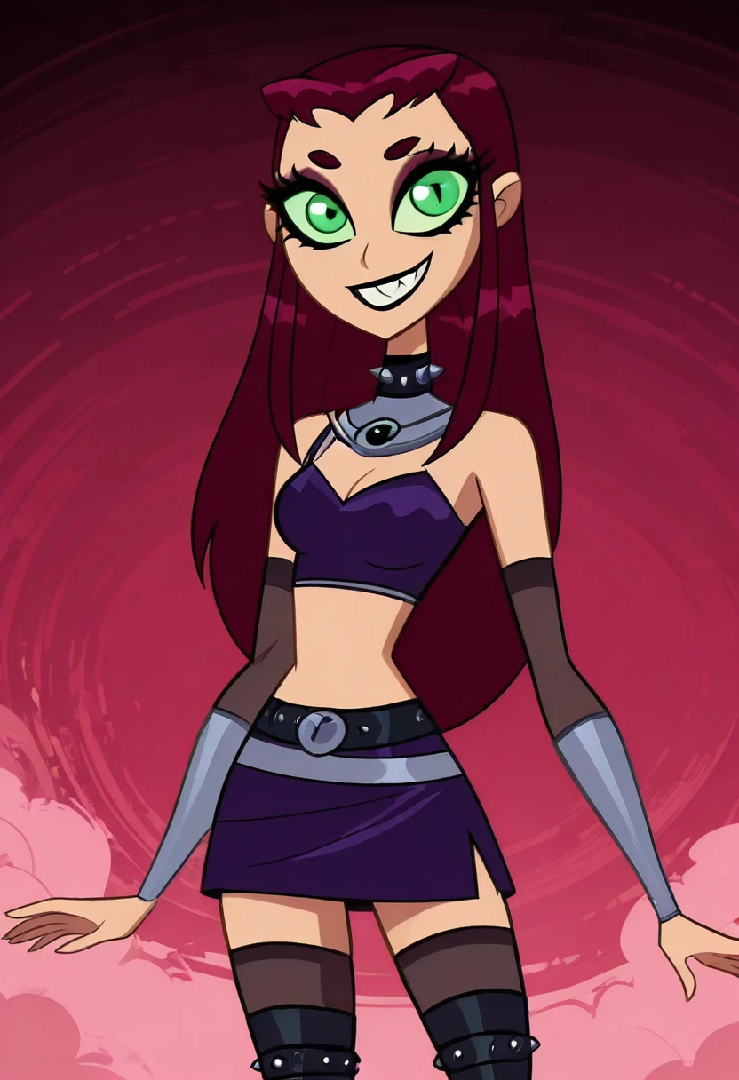 strfr, green eyes, red hair, long hair, colored sclera, green sclera, midriff, crop top, gorget, skirt, thighhighs ,