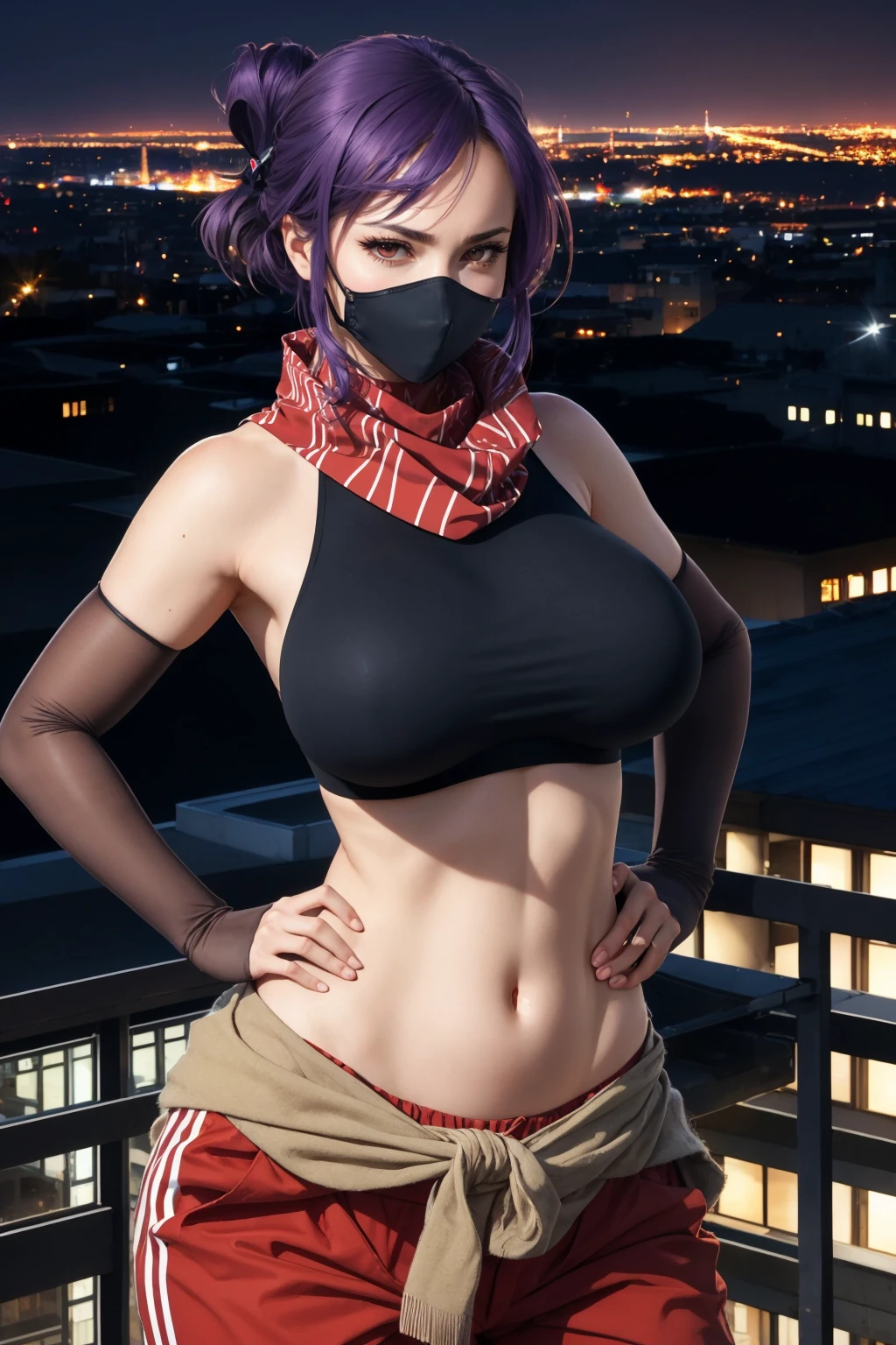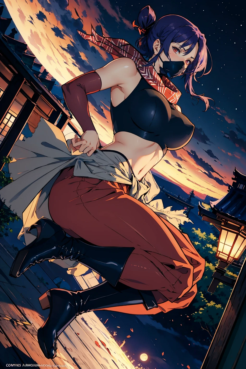 Add "red scarf, mouth mask, black crop top, red pants, clothes around waist, elbow gloves, black boots" for her ninja outfit.