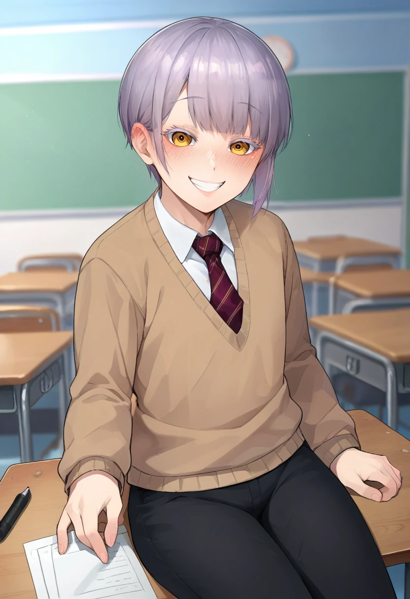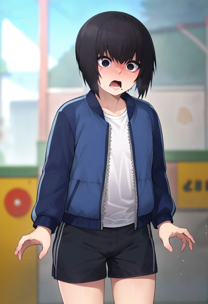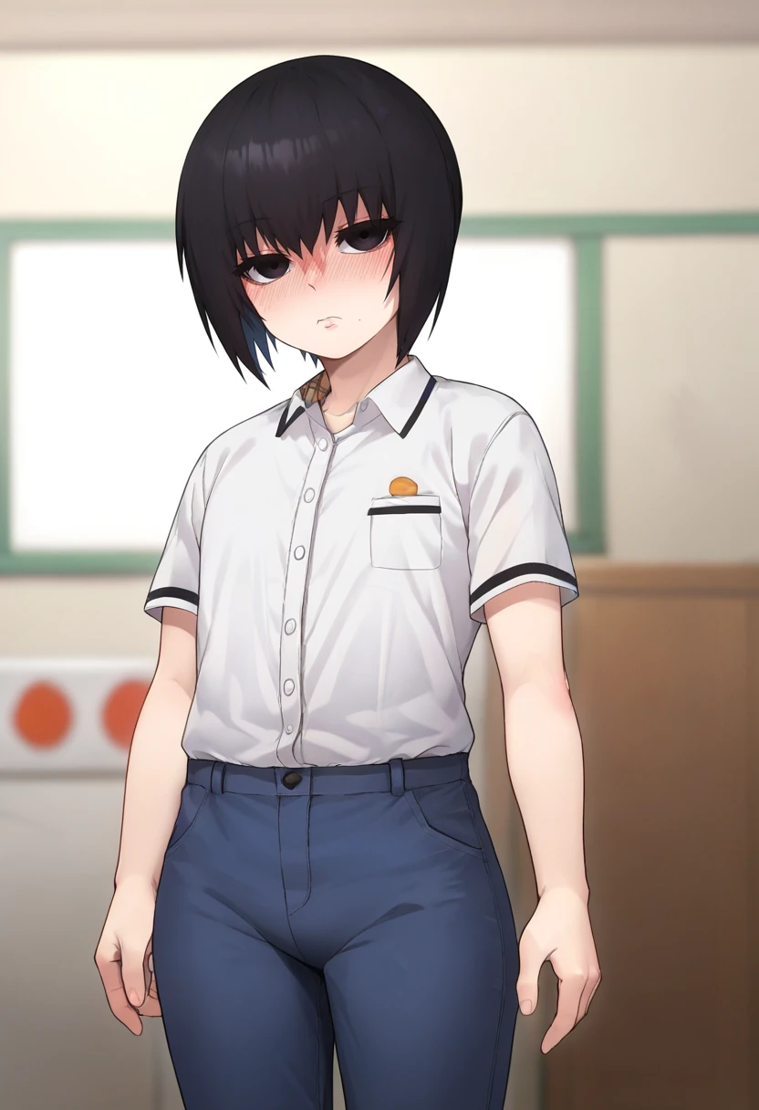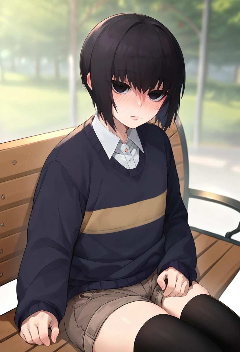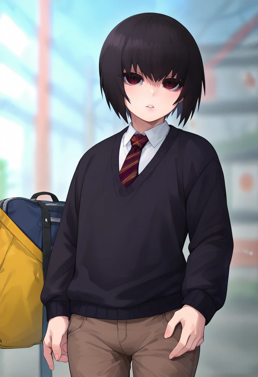 kuro, black eyes/crimson eyes, black hair, short hair, otoko no ko, mole under mouth, expressionless, // , school outfit, collared shirt, necktie, black sweater, brown pants, // , school outfit, collared shirt, brown shorts, striped sweater, black thighhighs, // , white shirt, blue pants, //, white shirt, open shirt, red panties, // , blue jacket, open jacket, shirt, black shorts, // , school outfit, collared shirt, necktie, open front sweater,