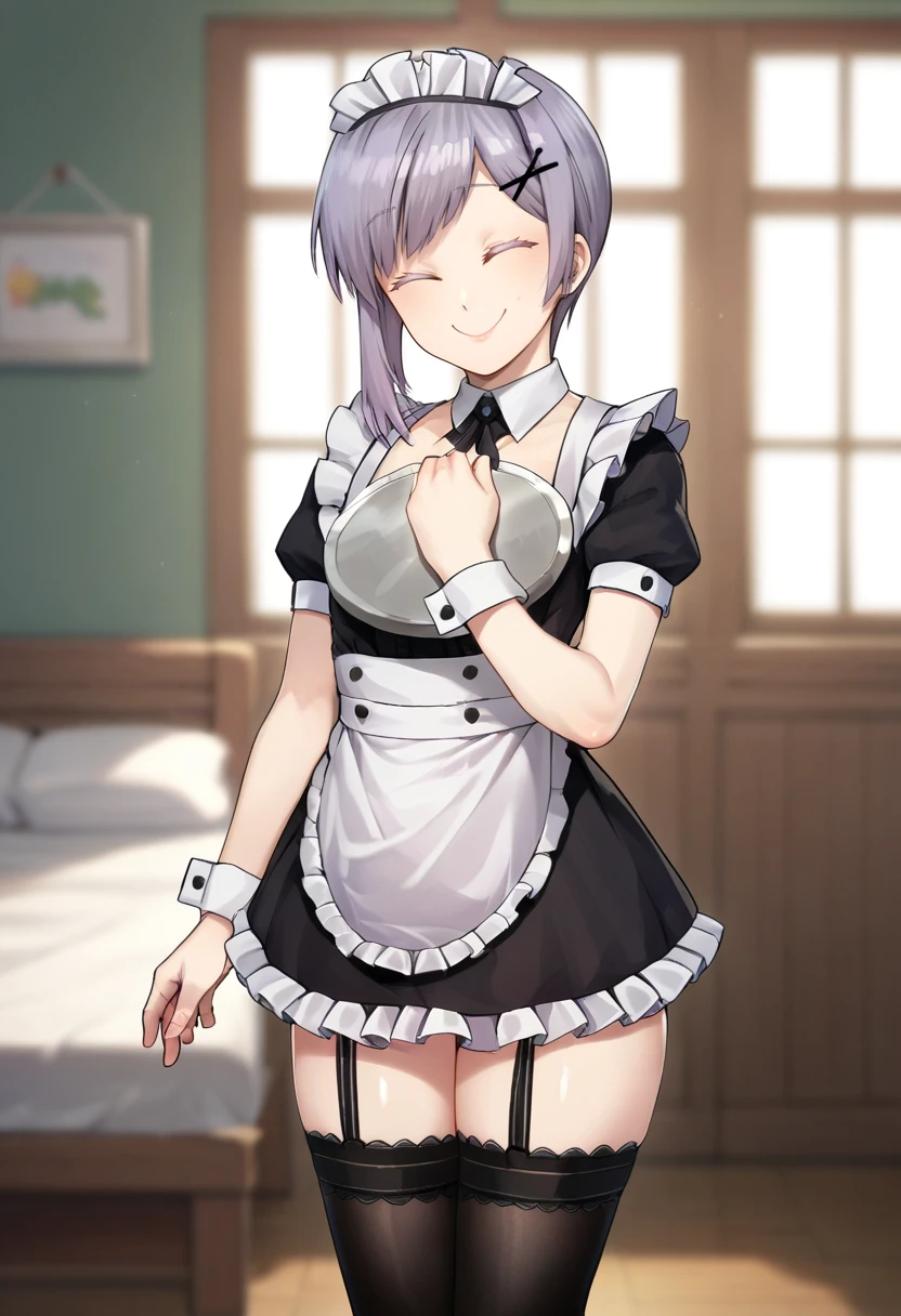shiro, yellow eyes, silver hair, short hair, otoko no ko, // , off-shoulder shirt, black, bra, black shirt, grey shorts, // , school outfit, collared shirt, necktie, brown sweater, black pants, // , maid, maid outfit, x hair ornament, thighhighs, maid headdress, garter straps,