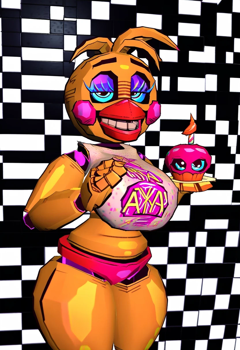 toy chica (vibapop), beak, 3d, 3d model, retro, teeth, Blue eyes, blue eyeliner, crop top, joints, yellow body,