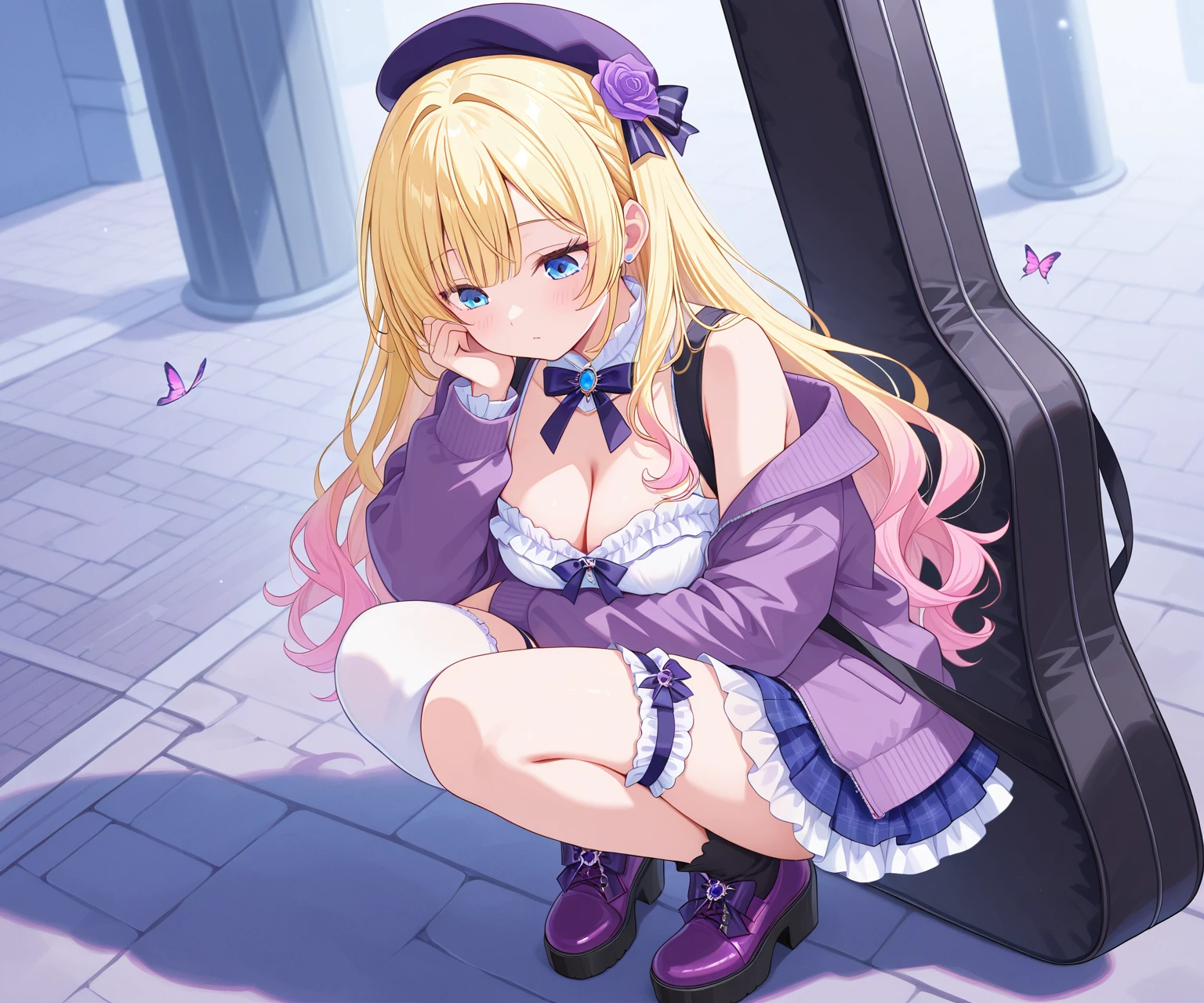1girl, blonde hair, long hair, full body, single thighhigh, breasts, dress, flower, thighhighs, jacket, blue eyes, solo, instrument case, hat, butterfly, cleavage, hair ornament, bug, rose, purple footwear, hair flower, short dress, long sleeves, jacket on shoulders, standing, guitar case, thigh strap, bow, frills, magical girl,Kanzaki Kanade