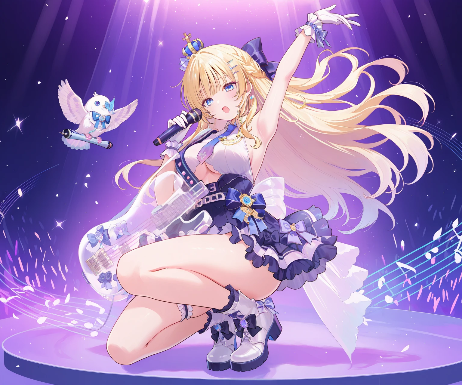 1girl, blonde hair, holding, long hair, solo, blue eyes, bow, standing on one leg, breasts, gloves, white gloves, full body, hair bow, sleeveless, standing, purple bow, skirt, holding microphone, open mouth, white footwear, crown, braid, purple skirt, frills, arm up, armpits, boots, bird, microphone, musical note, floating hair, Neon Glow,Kanzaki Kanade
