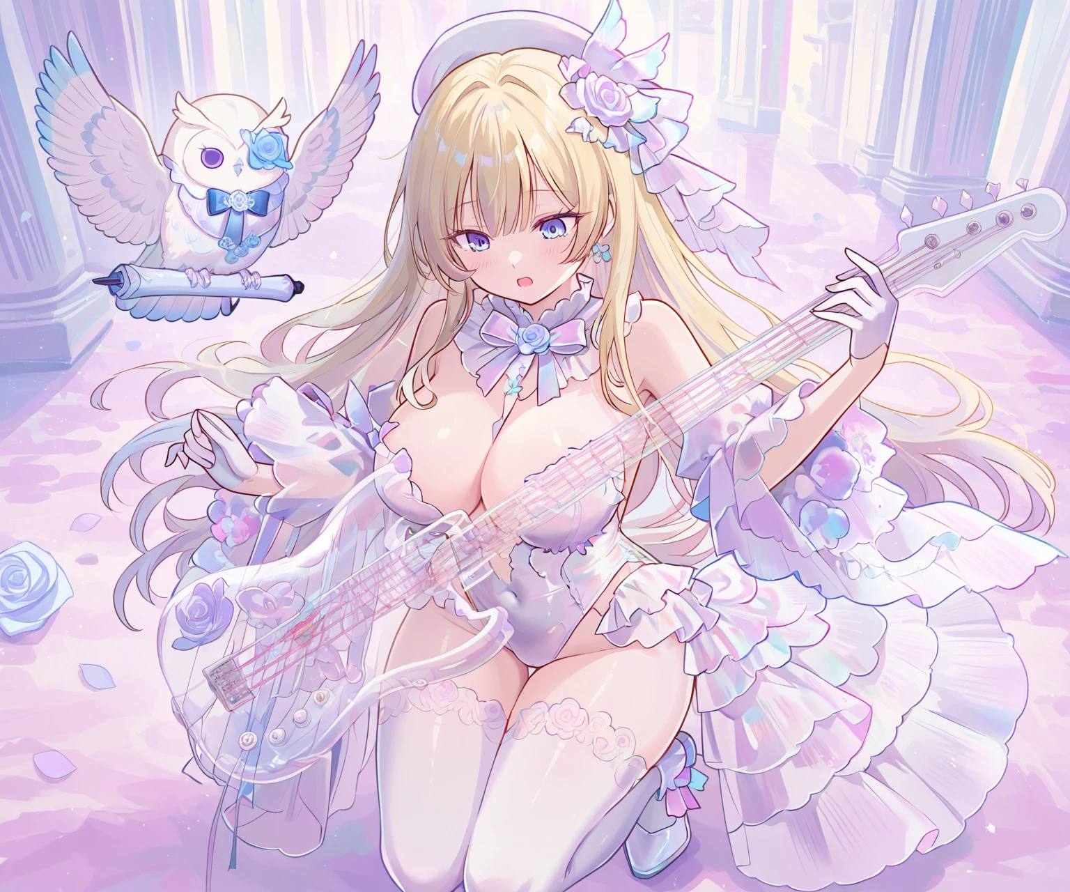 1girl, breasts, gloves, thighhighs, blonde hair, long hair, white gloves, blue eyes, instrument, solo, large breasts, hat, flower, white thighhighs, white headwear, hair ornament, bare shoulders, open mouth, holding, owl, dress, thighs, frills, rose, cleavage, revealing clothes, leotard, jewelry, earrings, bird, hair flower, Magical Costume, iridescent,Kanzaki Kanade