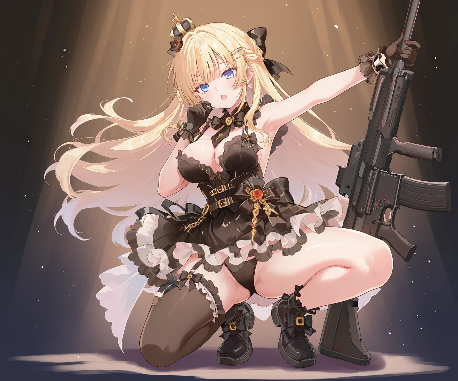 1girl, gun, blonde hair, weapon, rifle, long hair, breasts, thighhighs, gloves, holding, single thighhigh, solo, dress, assault rifle, full body, flower, black gloves, rose, blue eyes, black dress, black footwear, armpits, crown, standing, holding weapon, standing on one leg, frills, holding gun, Elegy of Bullets,Kanzaki Kanade