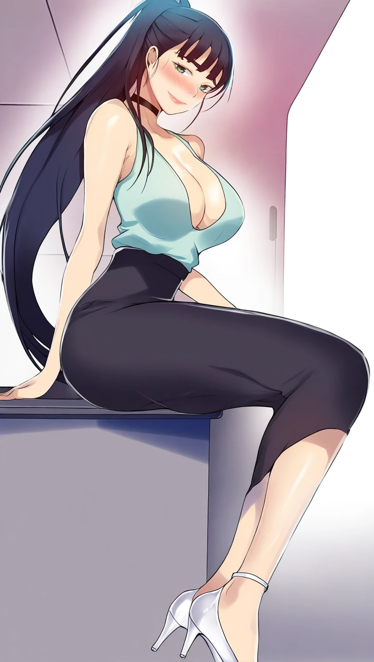 date outfit, light blue tank top, long black skirt, medium skirt, high heels, white heels, breasts, large breasts, cleavage, choker, black choker,