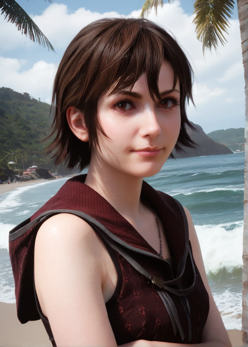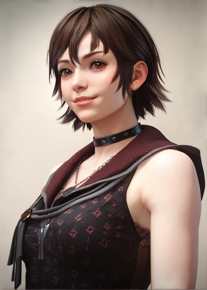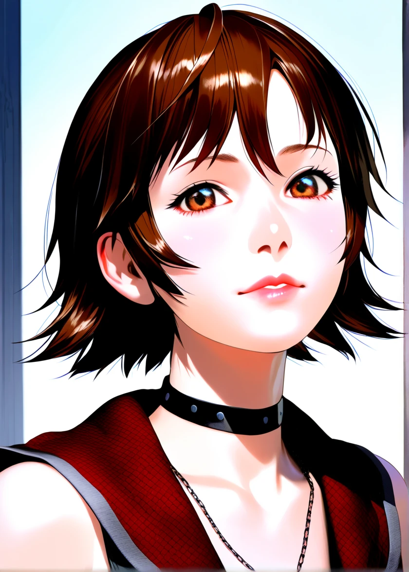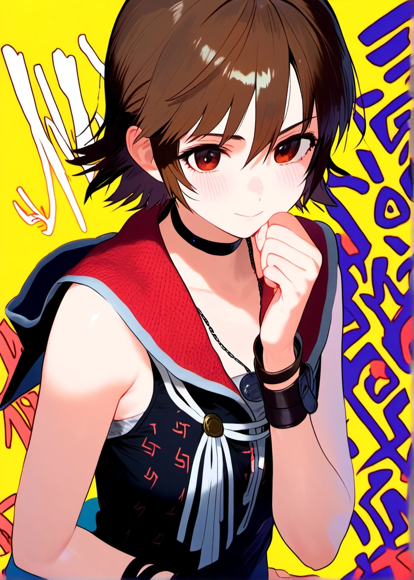 irisamicitia, 1girl, short hair, brown hair, swept bangs, red eyes