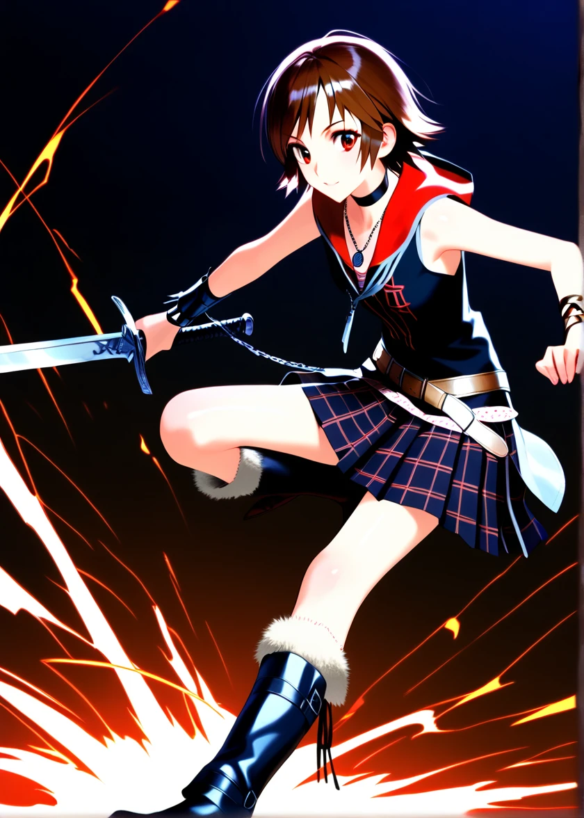 black choker, pendant, jewelry, sleeveless, bare shoulders, sleeveless hoodie, hood down, bracelet, pleated skirt, belt, chain, knee boots, black footwear