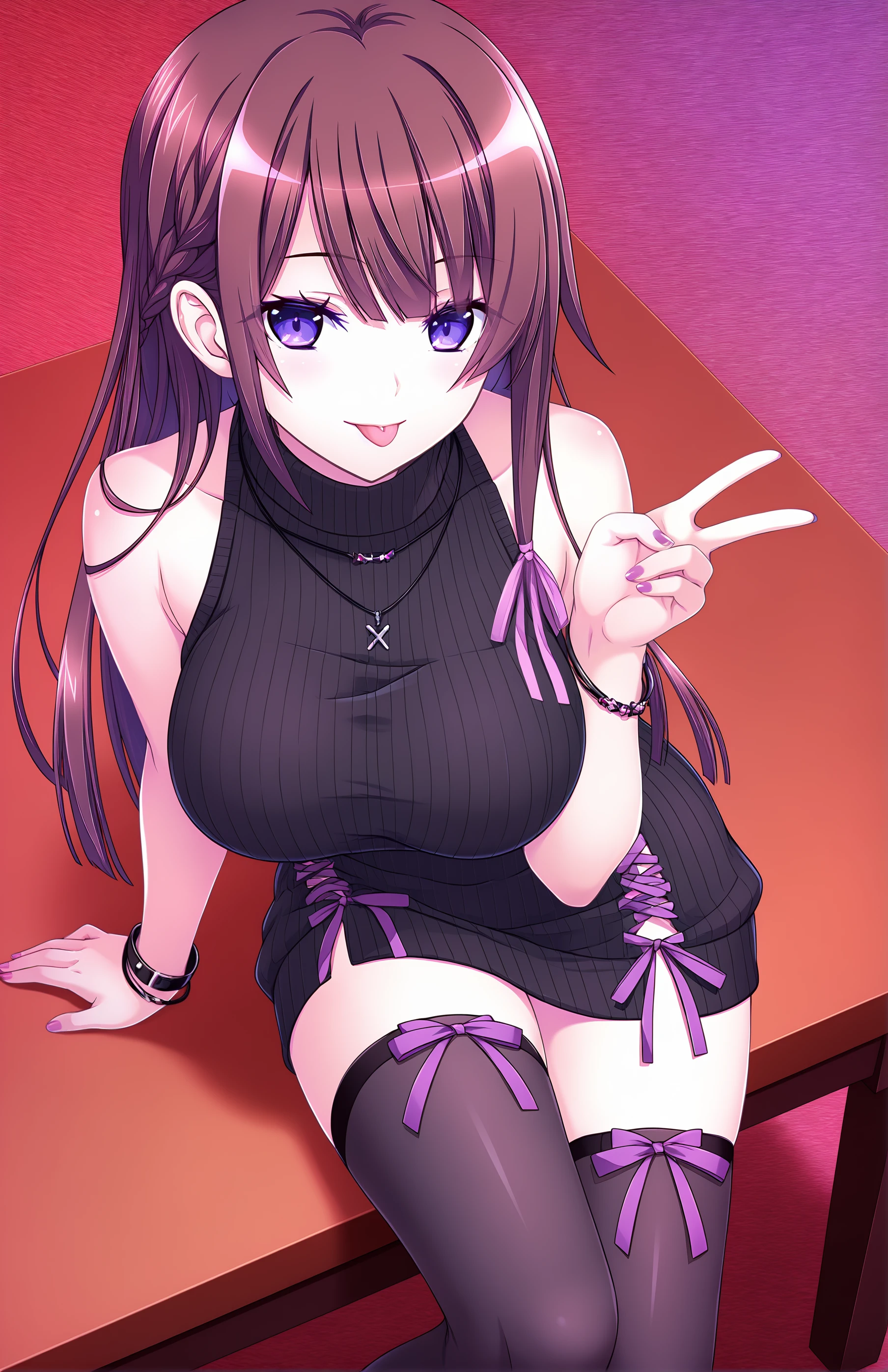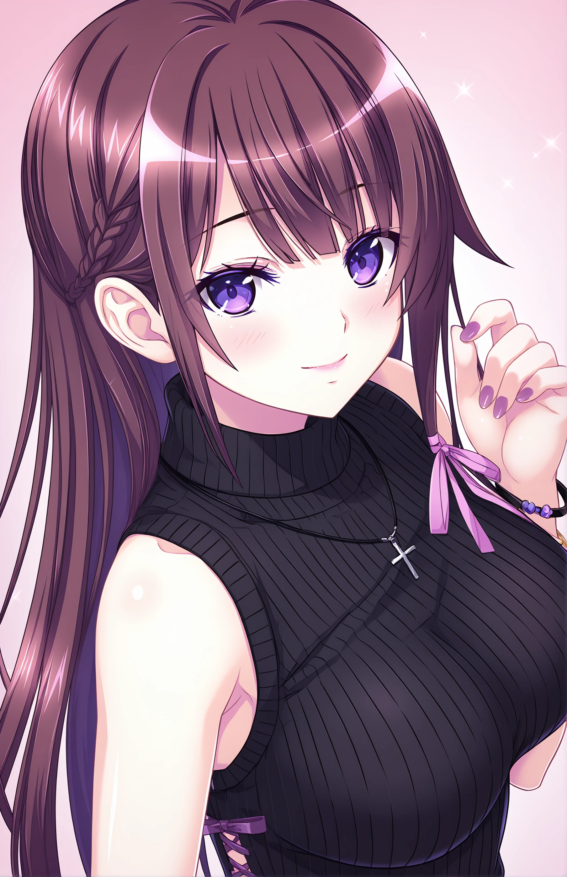 SonodaSatsuki, long hair, breasts, bangs, large breasts, brown hair, dress, ribbon, bare shoulders, purple eyes, braid, sleeveless, necklace, nail polish, bracelet, sweater, turtleneck, ribbed sweater, turtleneck sweater, purple nails, cross-laced clothes, black sweater, sleeveless turtleneck, sweater dress