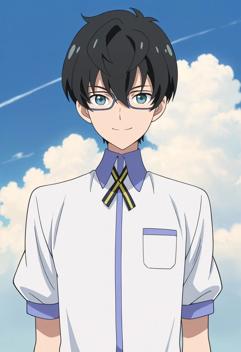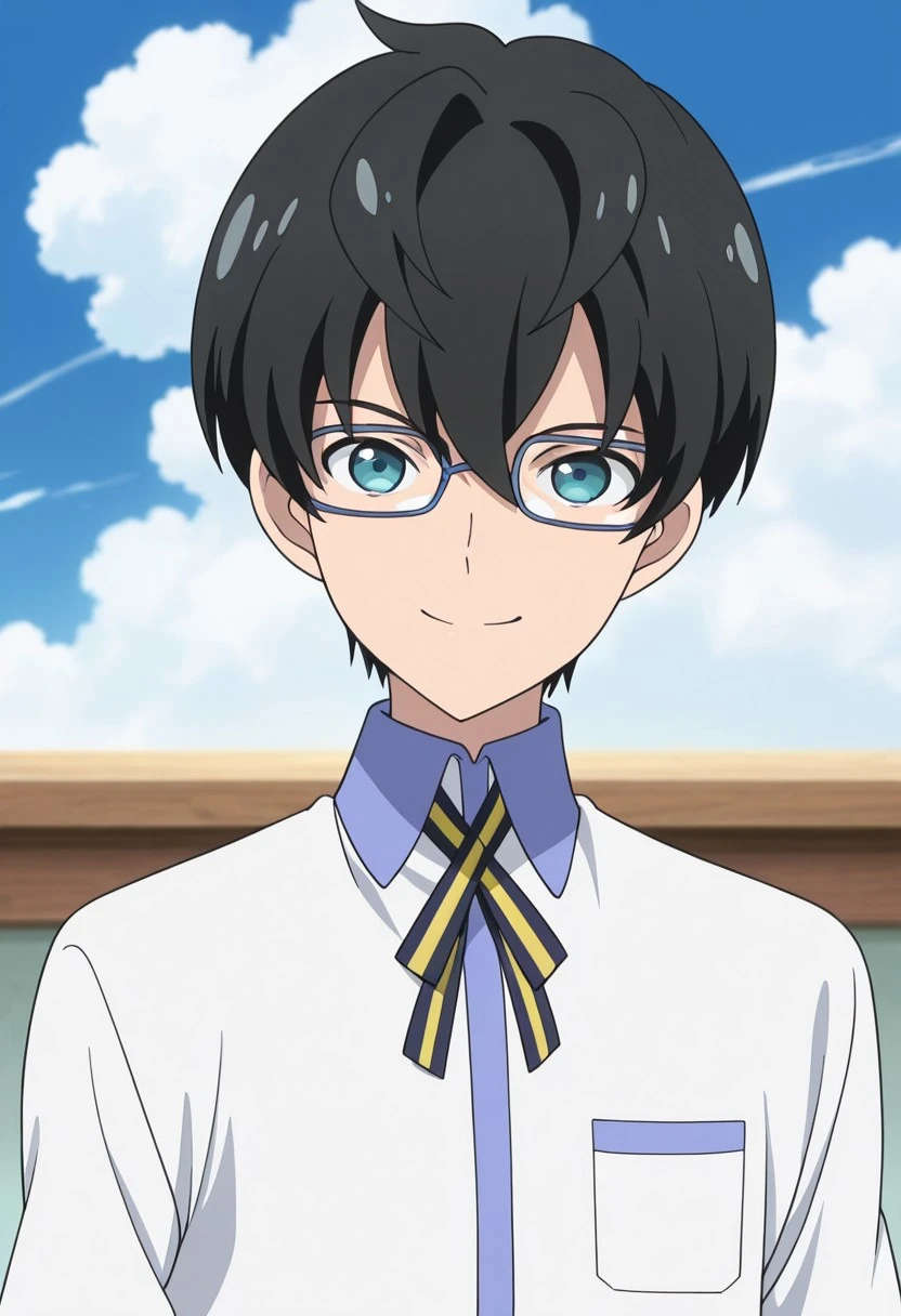 1boy, male focus, solo, blue eyes, glasses, black hair, hair between eyes, white shirt, yellow ribbon, neck ribbon, short sleeves, green pants,