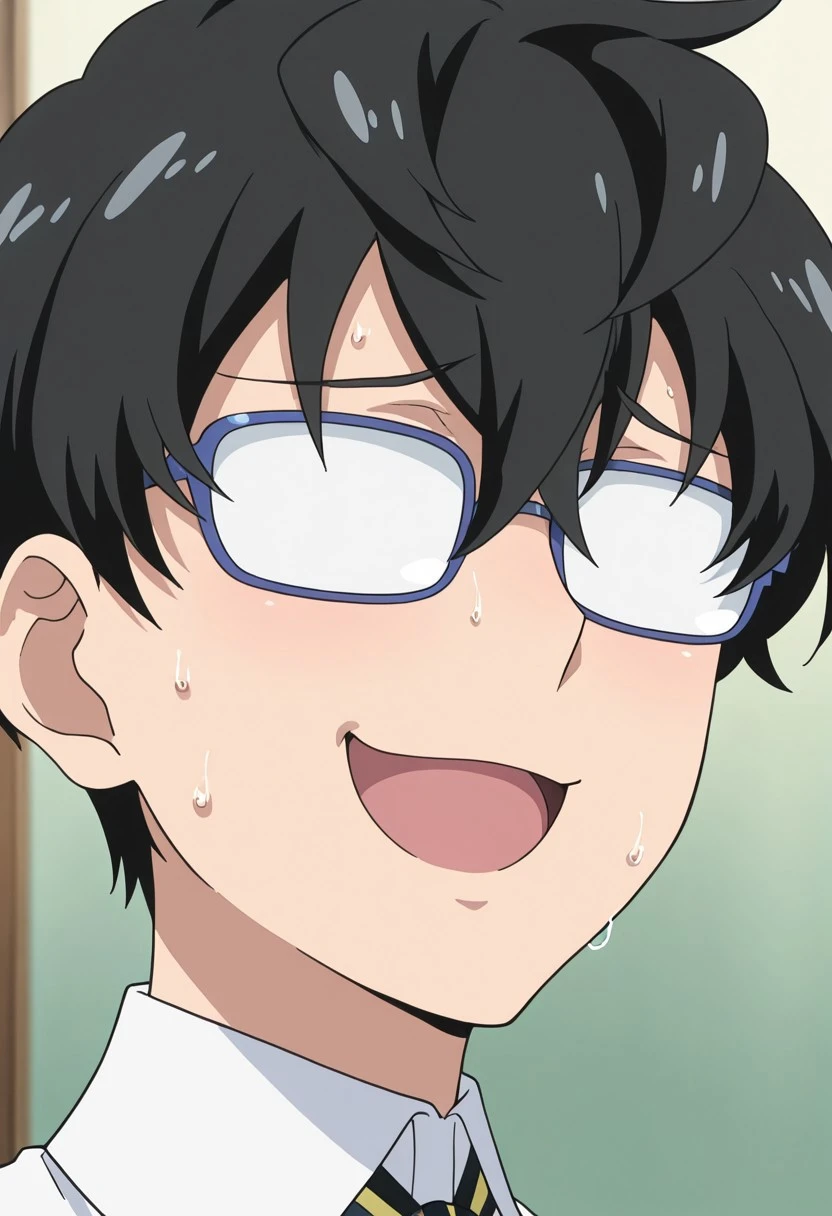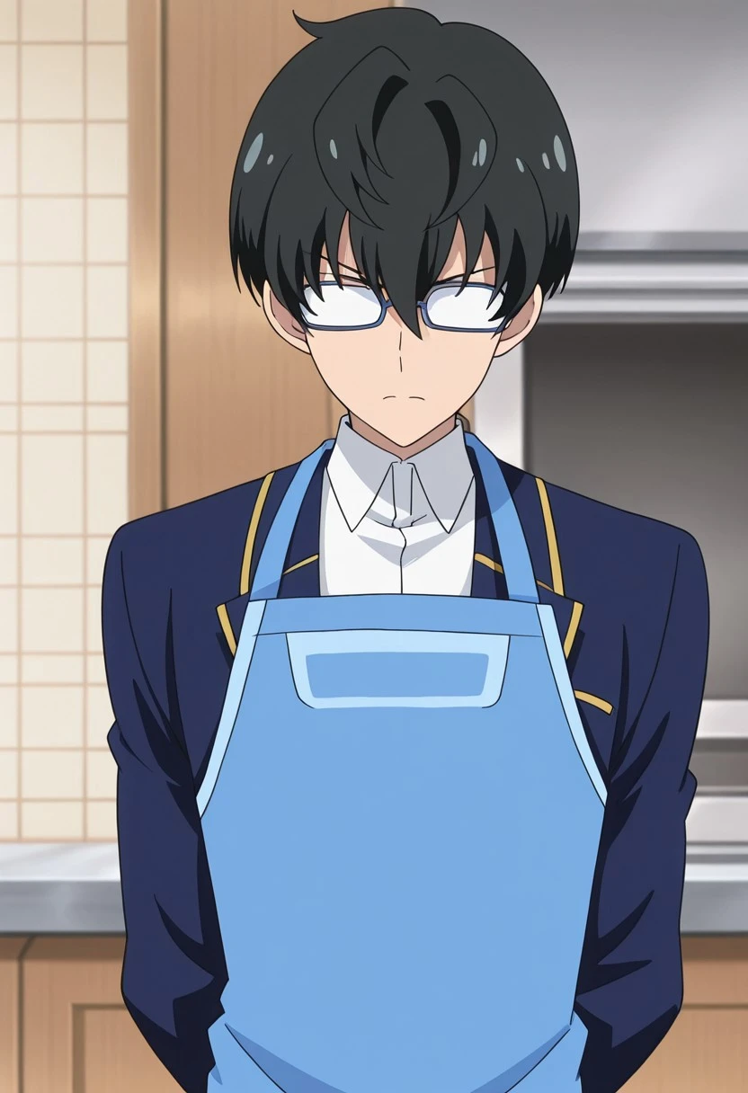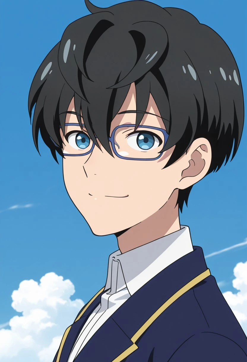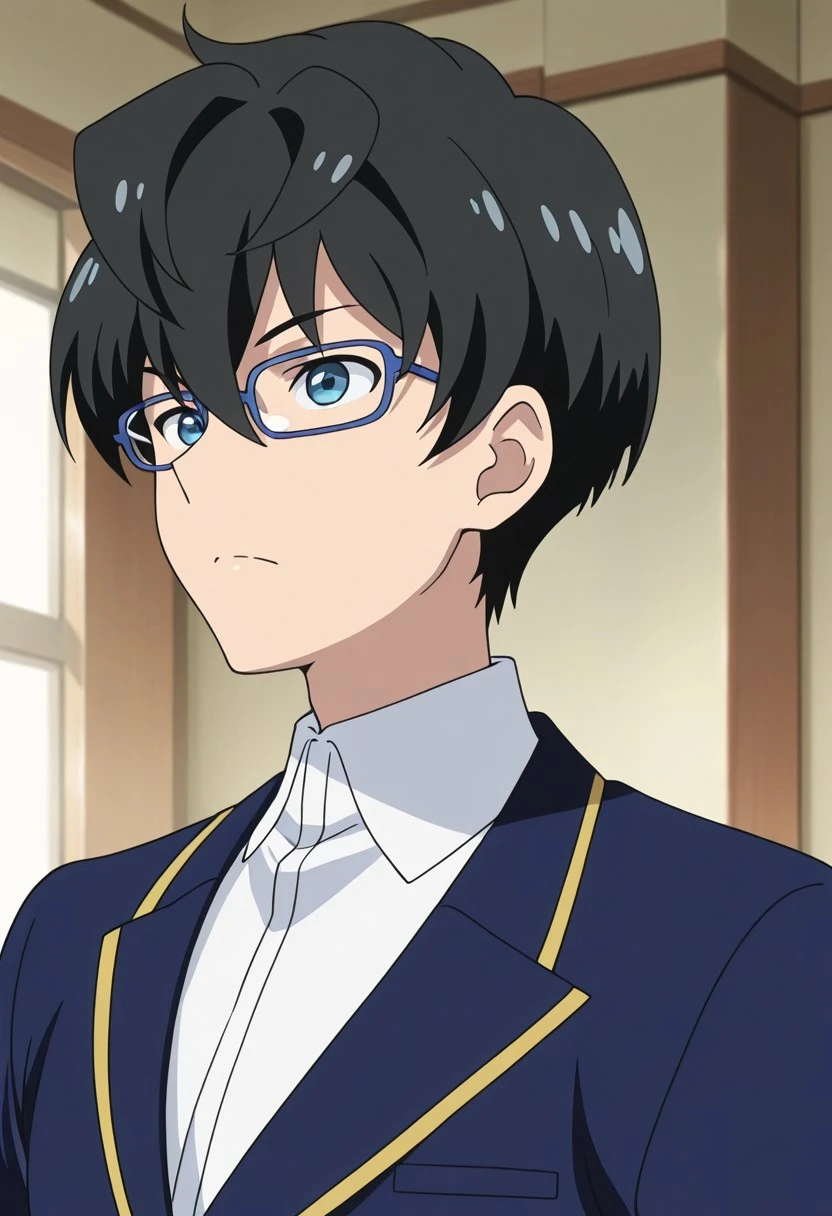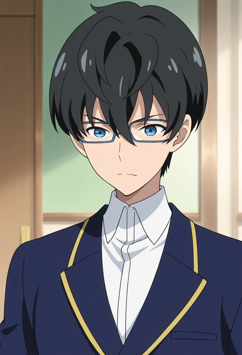 1boy, male focus, solo, blue eyes, glasses, black hair, hair between eyes, school uniform, white shirt, collared shirt, blue jacket, green pants,