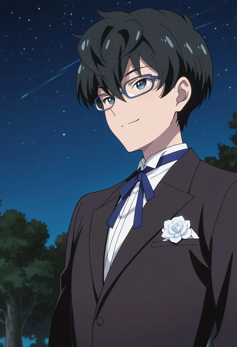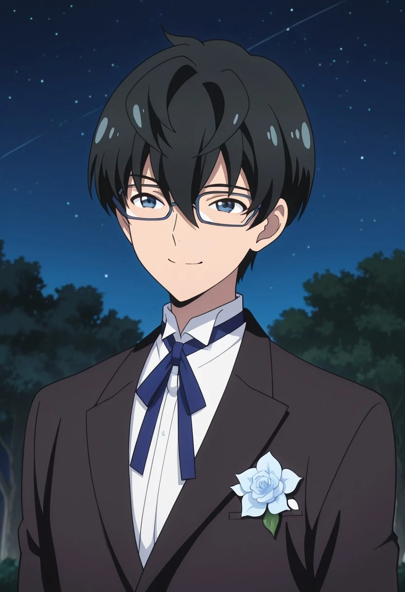 1boy, male focus, solo, blue eyes, glasses, black hair, hair between eyes, formal, white shirt, collared shirt, blue ribbon, neck ribbon, black jacket
