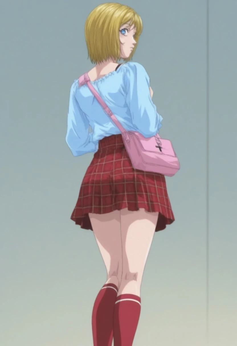 kitami reika, blue blouse, red and yellow checkered skirt and knee-high red socks blonde hair, short hair, blue eyes, lips,