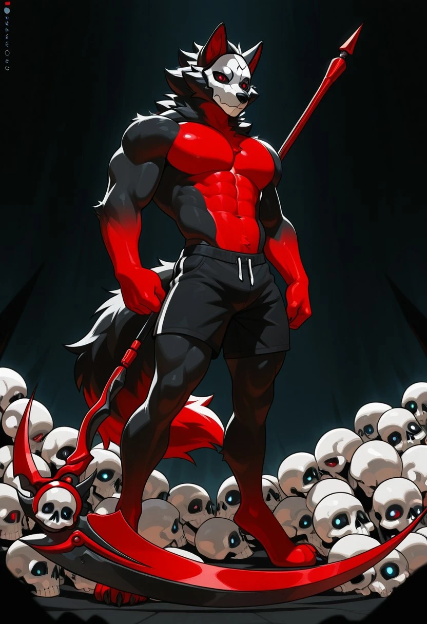 Nekros,anthro,furry,Wolf,solo,male,Muscular body,black fur,red Stomach,red hands,red paws,black tail,red tail tip, white skull mask,black sclera,red eyes,wearing no clothing,claws