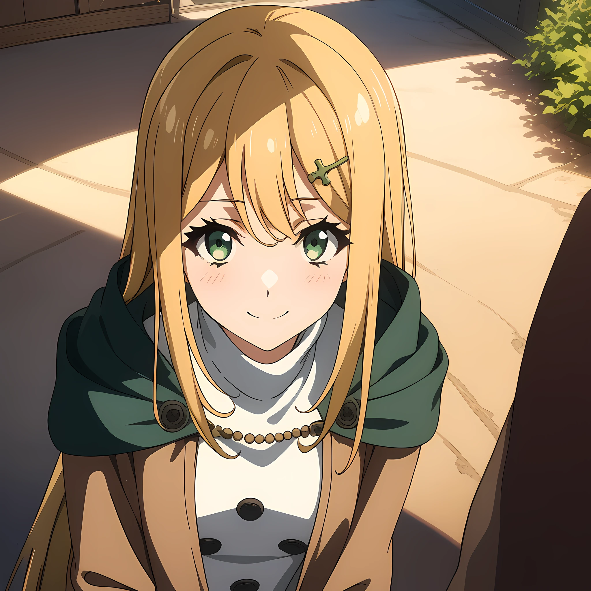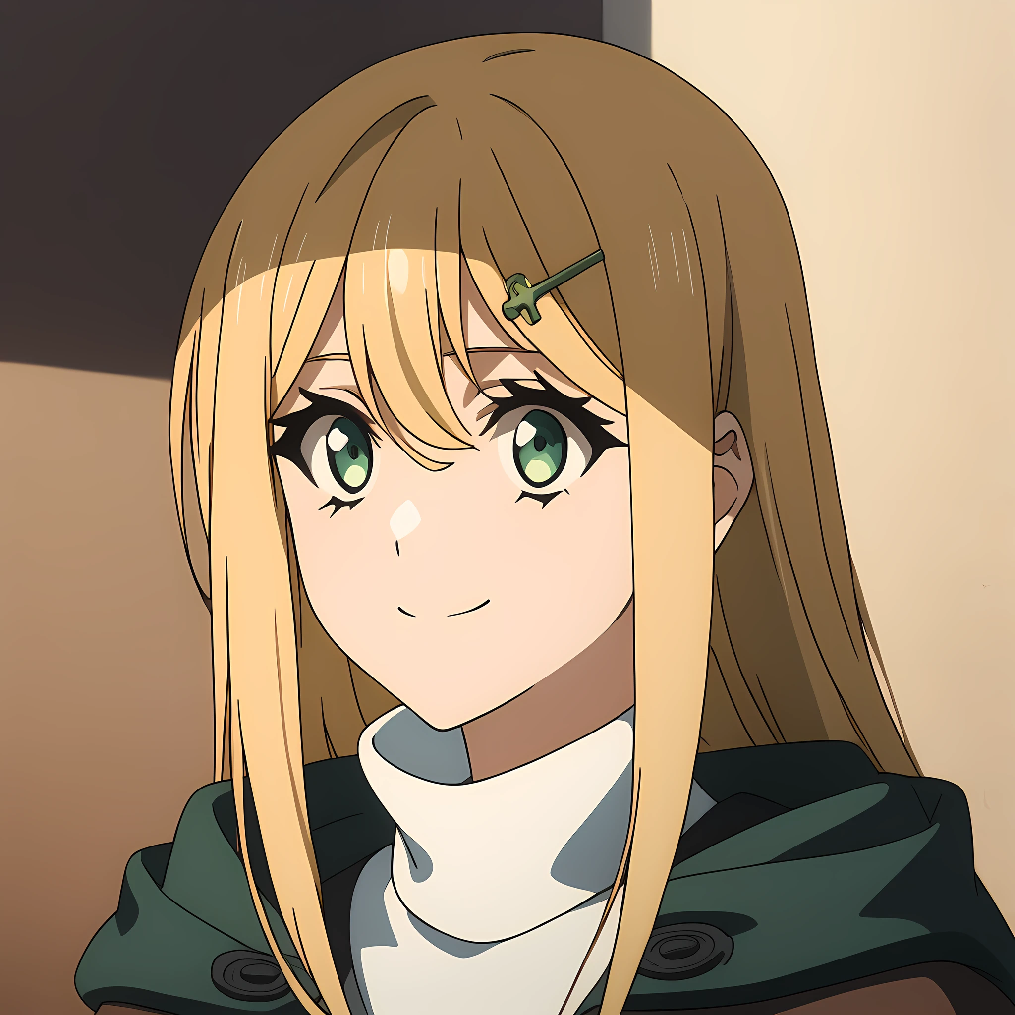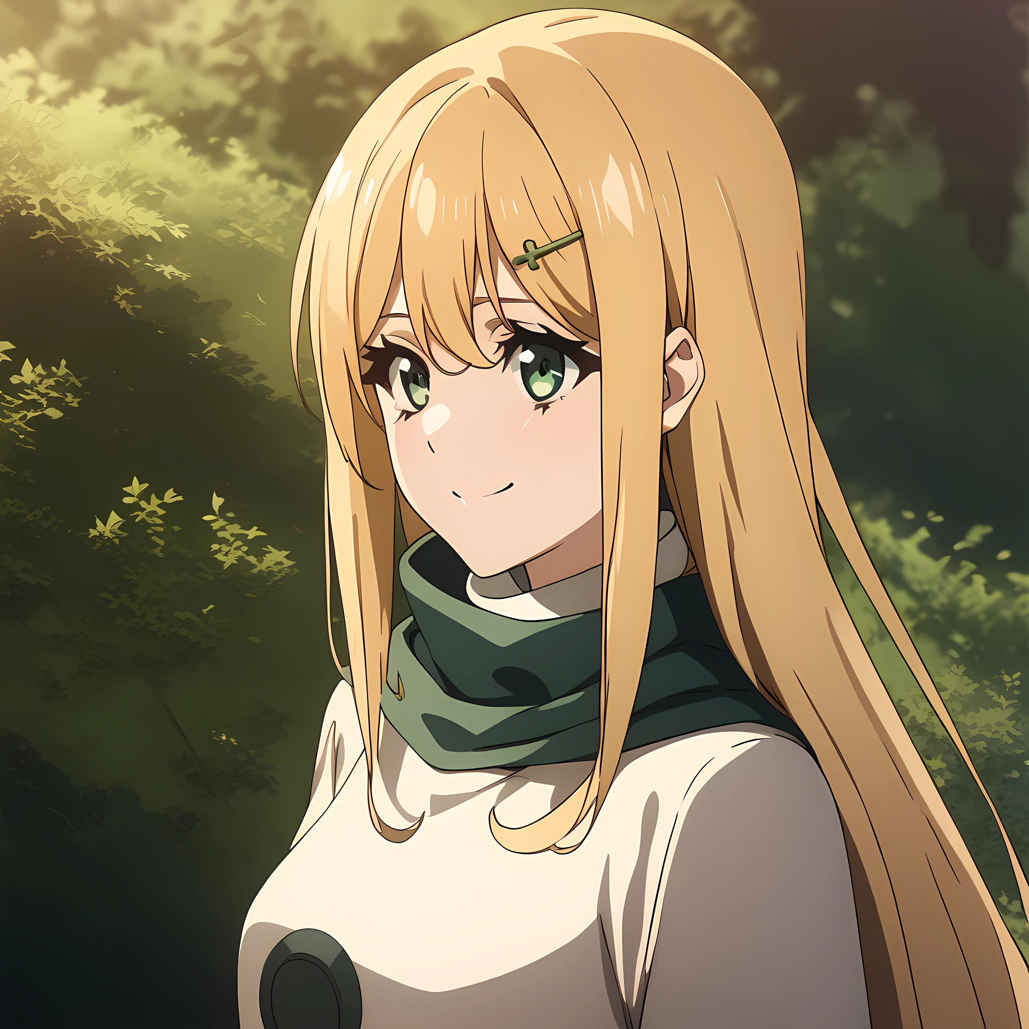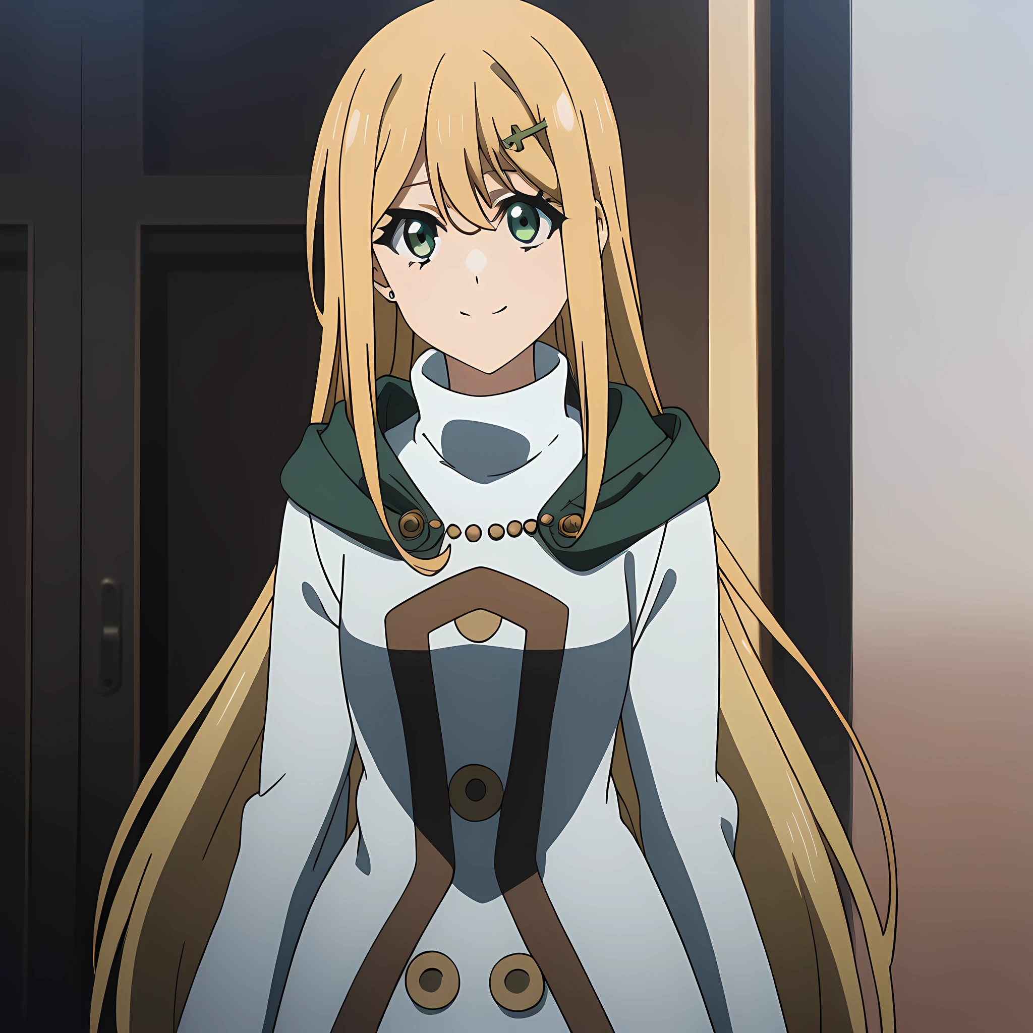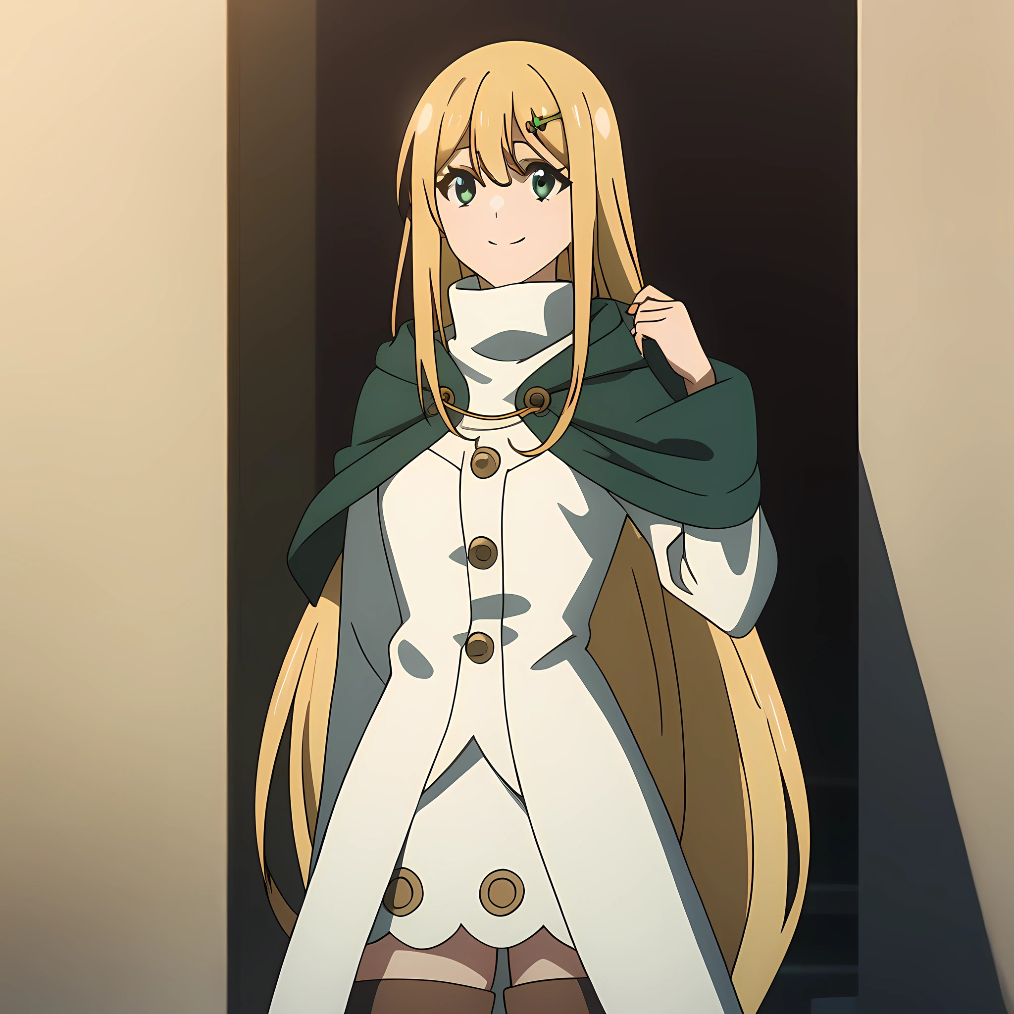 Activation tag is "tanya_clark, green eyes, bangs, blonde hair, very long hair, turtleneck, white shirt, sleeves, green cape, overcoat, white skirt, brown thigh boots, "