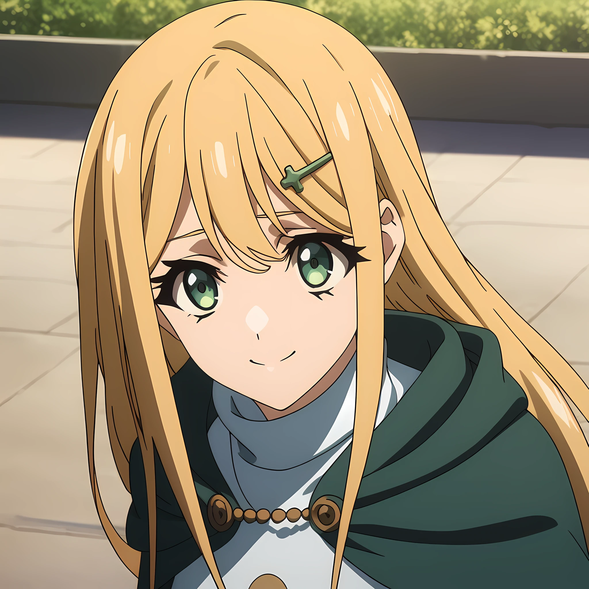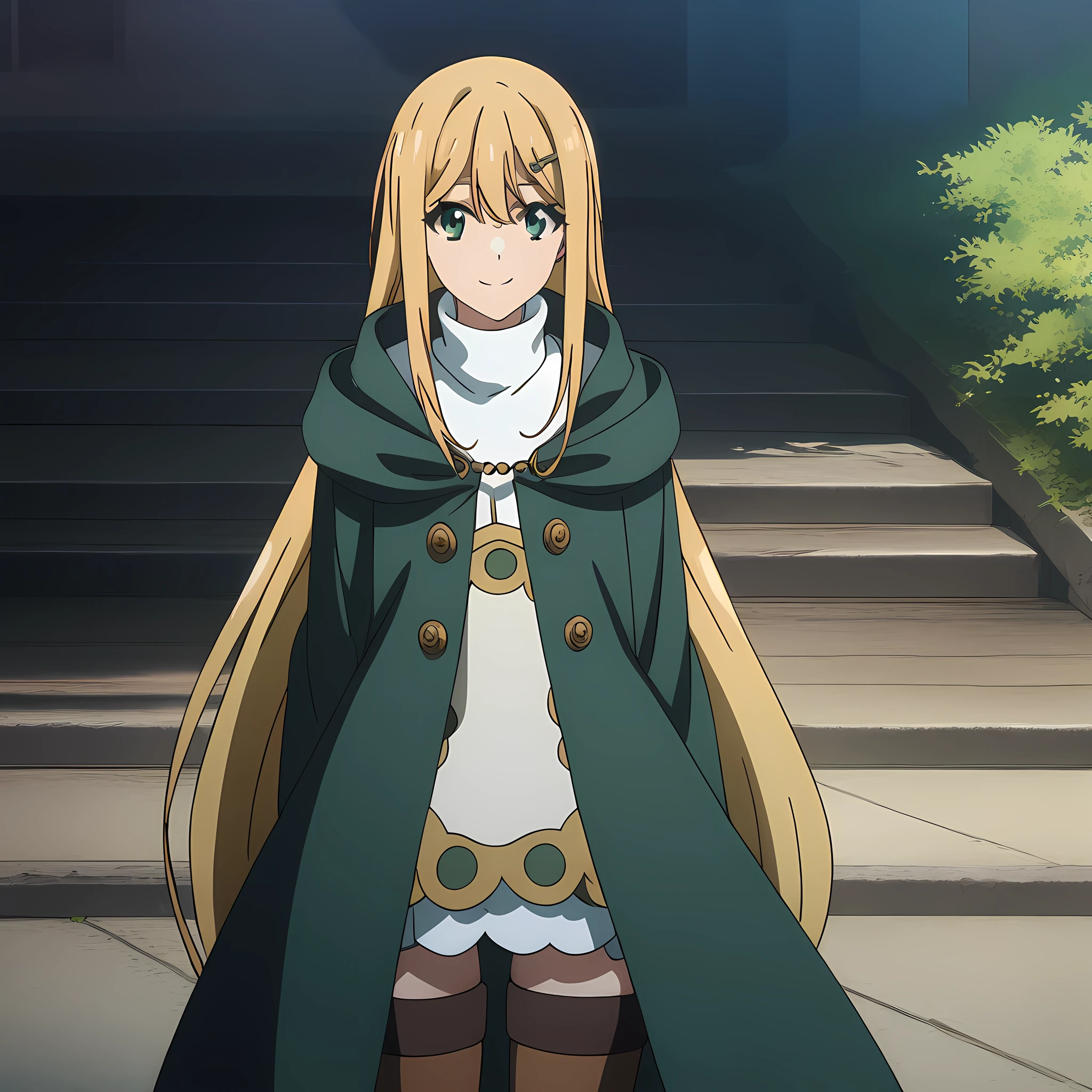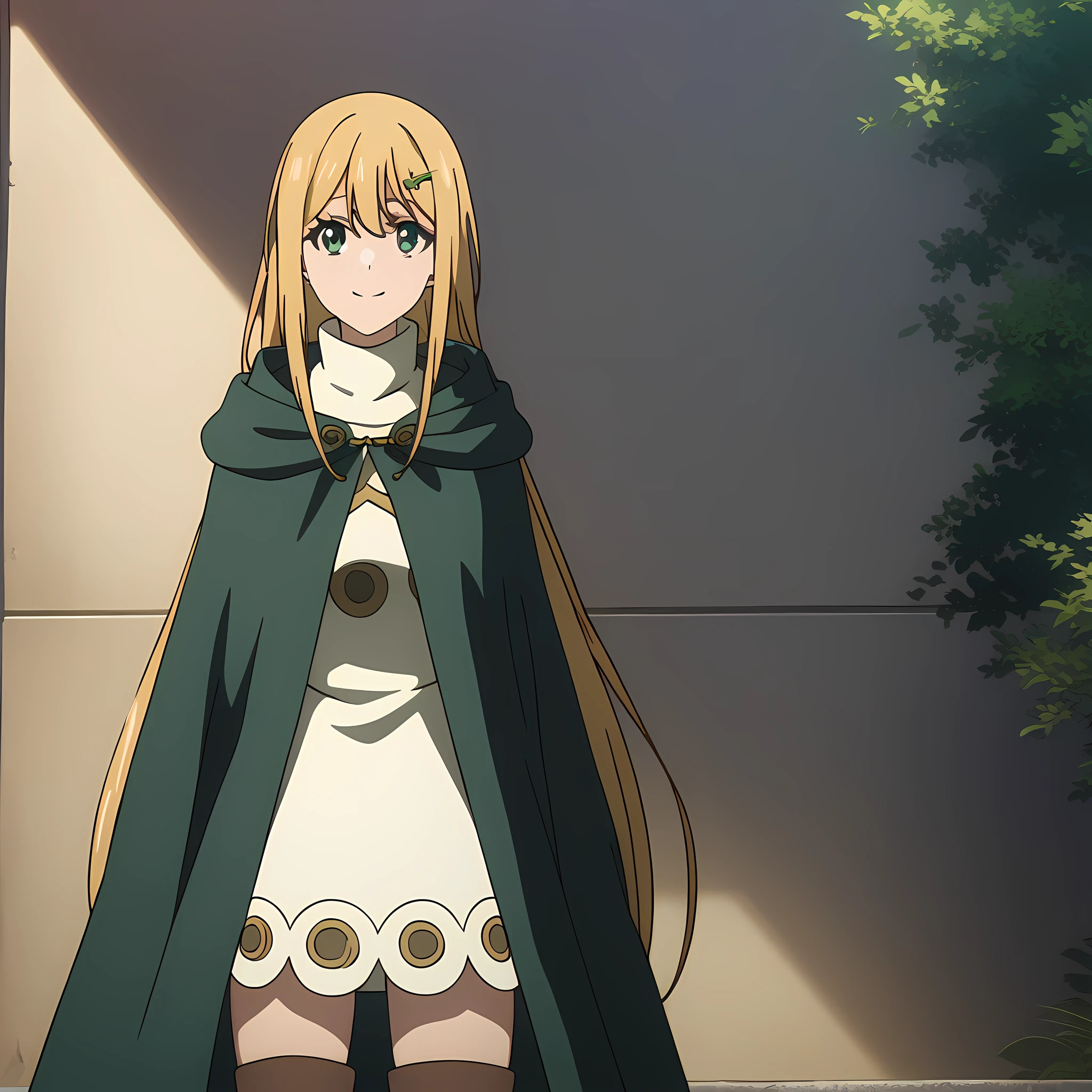 tanya_clark, green eyes, bangs, blonde hair, very long hair, turtleneck, white shirt, sleeves, green cape, overcoat, white skirt, brown thigh boots,