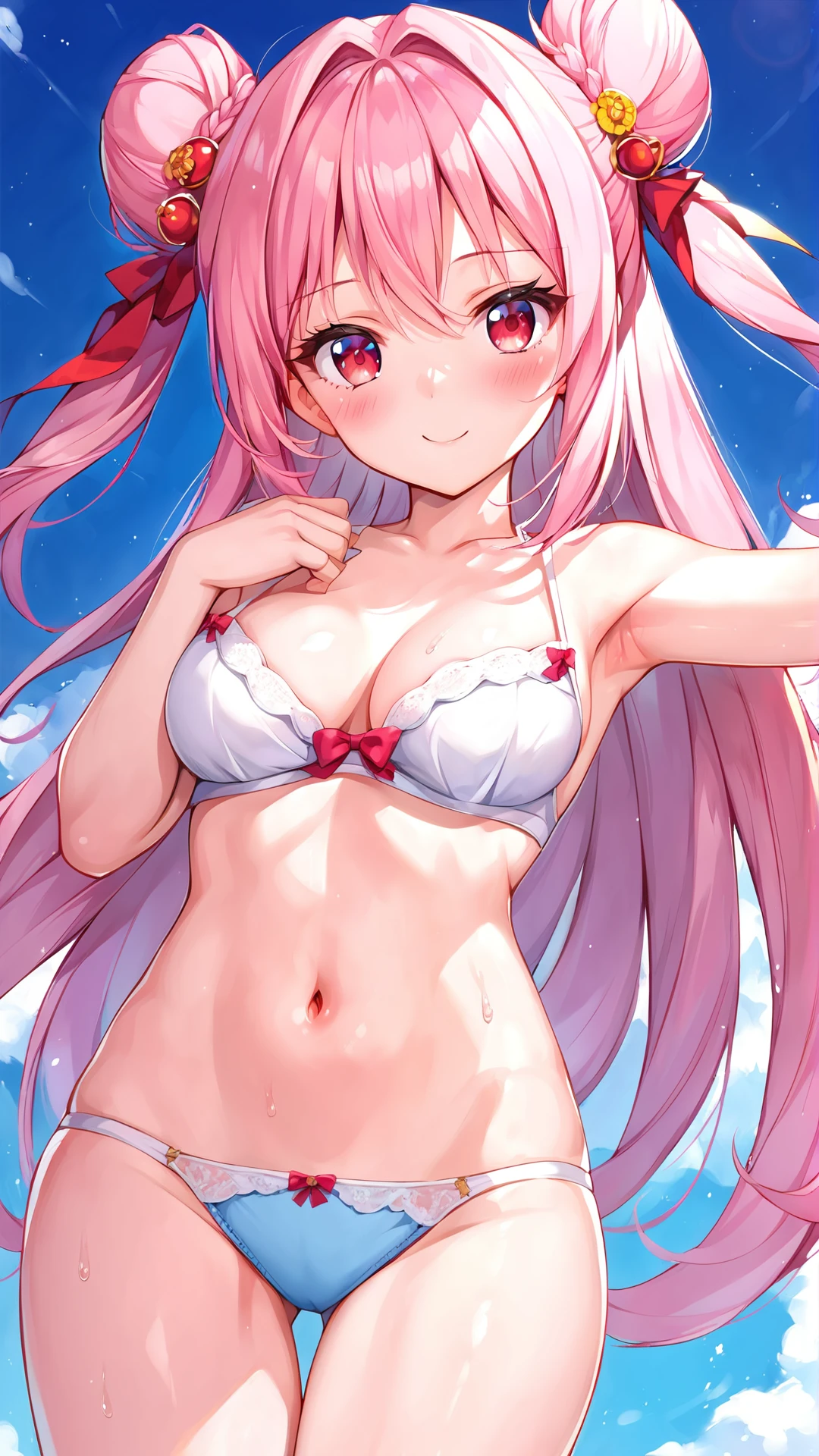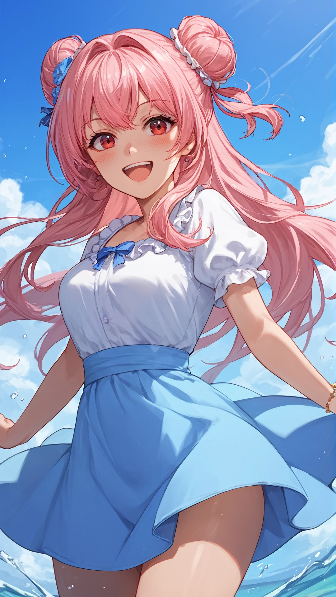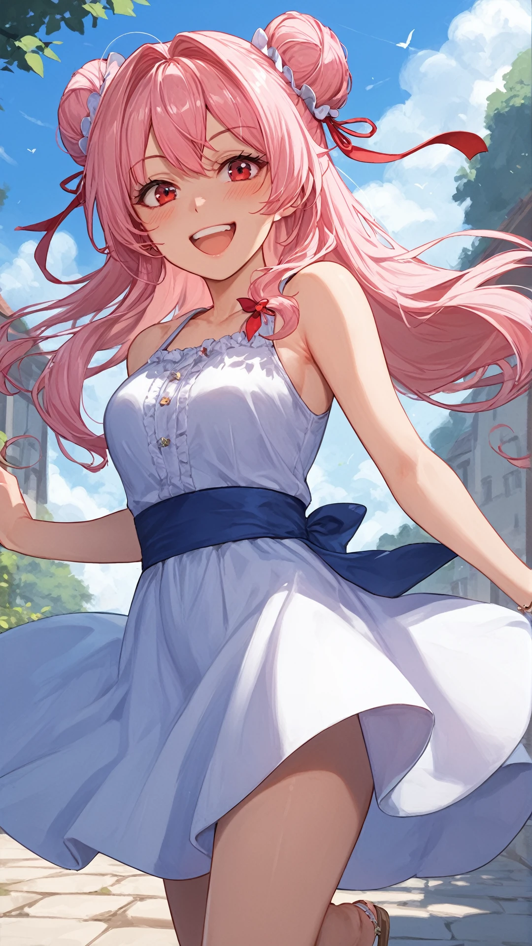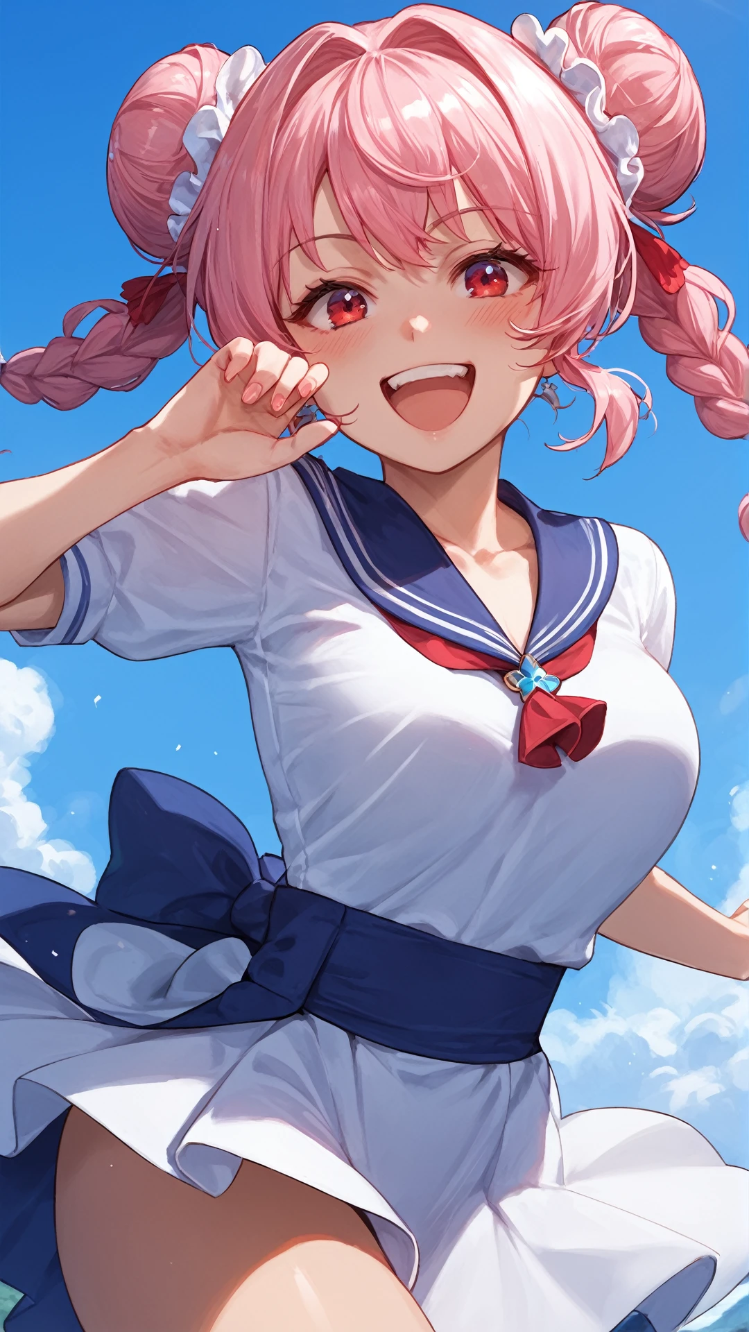 kanade, pink hair, long hair, two hair buns, two braids, two hair ornament, Medium Scarlet eyes,