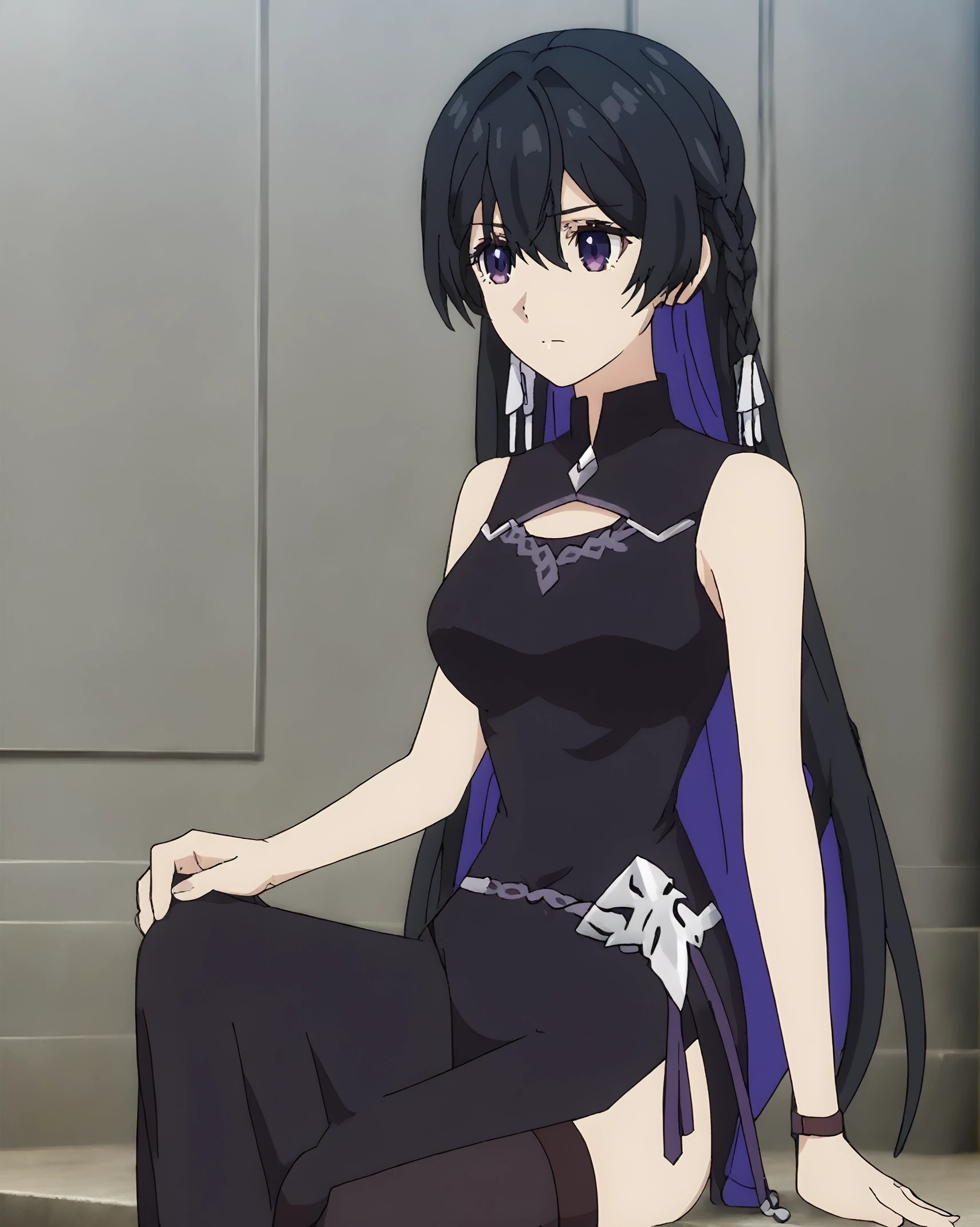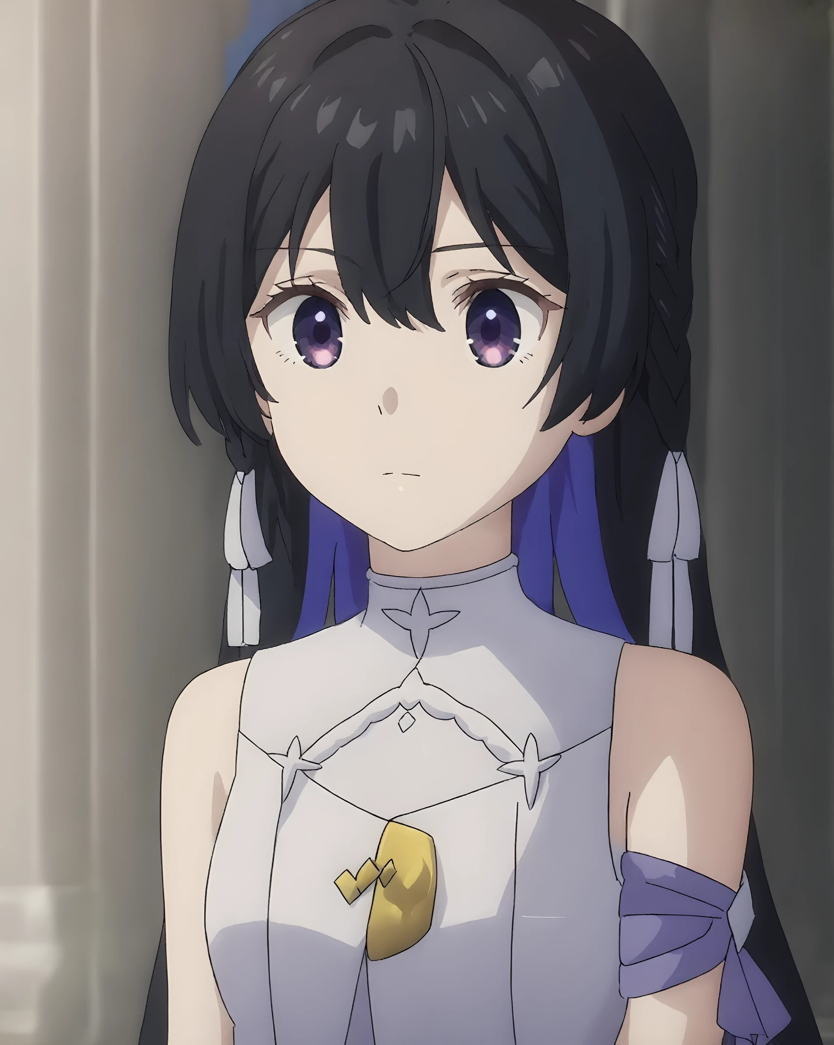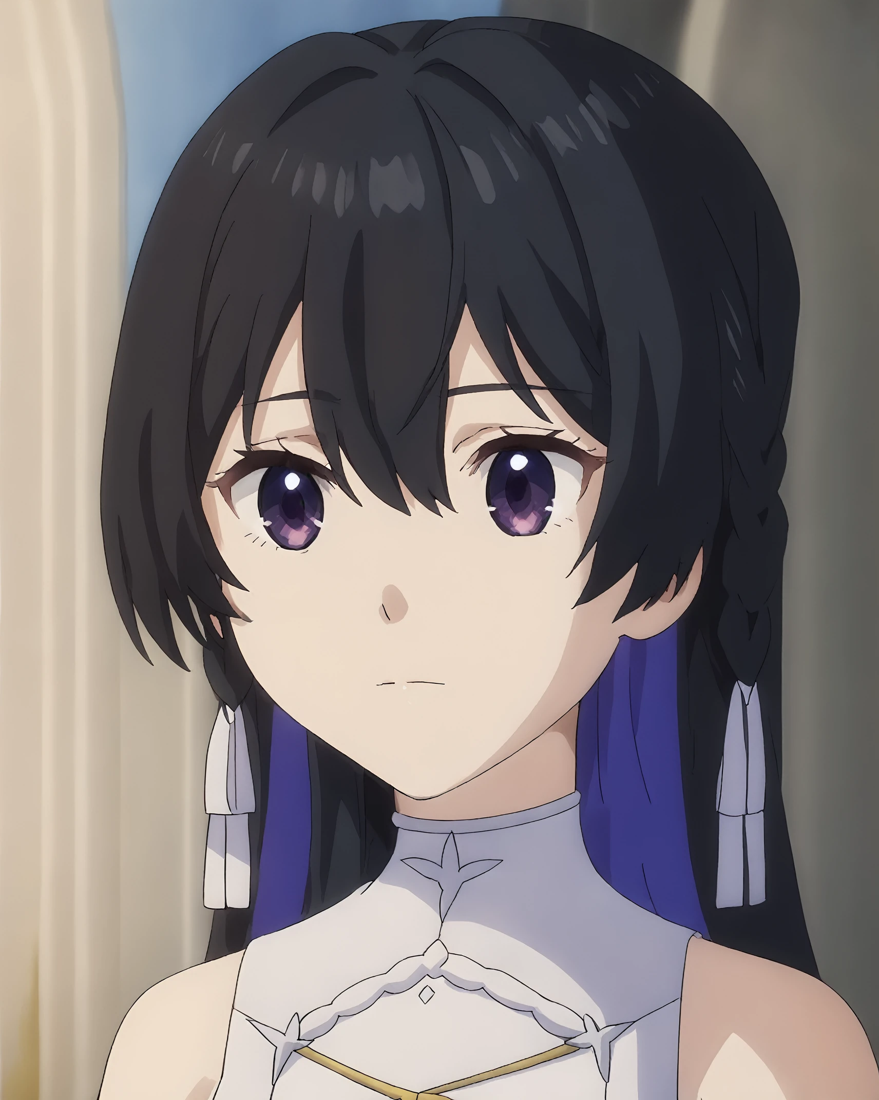 black hair, purple eyes, braid, white hair tie,